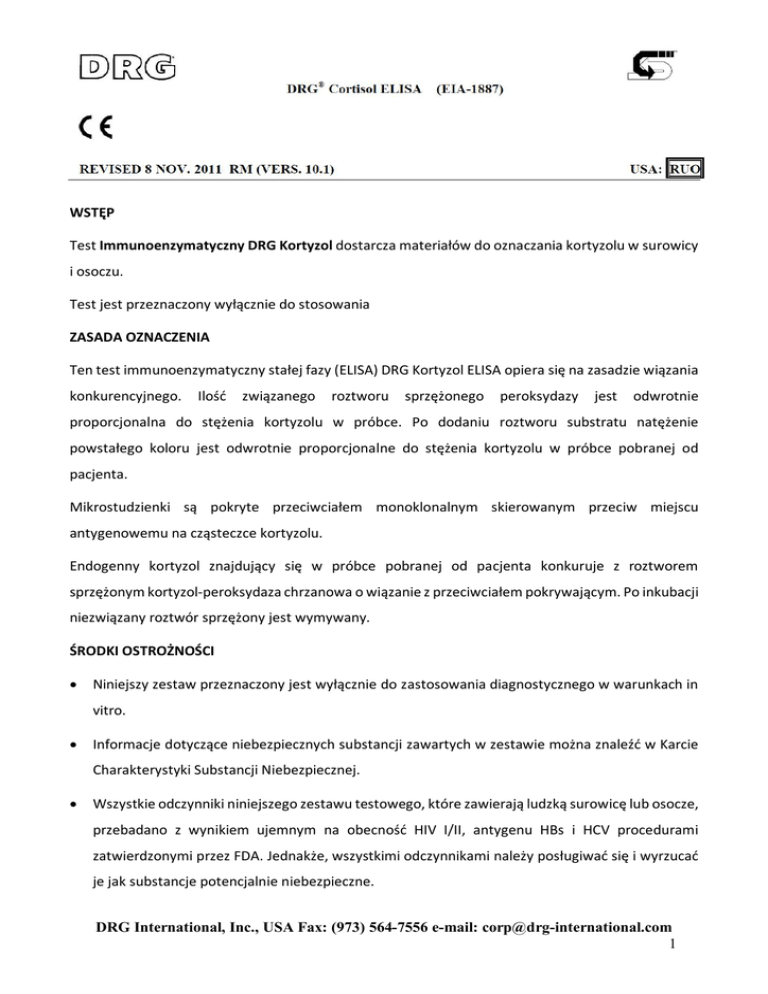 WSTĘP Test Immunoenzymatyczny DRG Kortyzol dostarcza materiałów do oznaczania kortyzolu w surowicy i osoczu. Test jest przeznaczony wyłącznie do stosowania ZASADA OZNACZENIA Ten test immunoenzymatyczny stałej fazy (ELISA) DRG Kortyzol ELISA opiera się na zasadzie wiązania konkurencyjnego. Ilość związanego roztworu sprzężonego peroksydazy jest odwrotnie proporcjonalna do stężenia kortyzolu w próbce. Po dodaniu roztworu substratu natężenie powstałego koloru jest odwrotnie proporcjonalne do stężenia kortyzolu w próbce pobranej od pacjenta. Mikrostudzienki są pokryte przeciwciałem monoklonalnym skierowanym przeciw miejscu antygenowemu na cząsteczce kortyzolu. Endogenny kortyzol znajdujący się w próbce pobranej od pacjenta konkuruje z roztworem sprzężonym kortyzol-peroksydaza chrzanowa o wiązanie z przeciwciałem pokrywającym. Po inkubacji niezwiązany roztwór sprzężony jest wymywany. ŚRODKI OSTROŻNOŚCI Niniejszy zestaw przeznaczony jest wyłącznie do zastosowania diagnostycznego w warunkach in vitro. Informacje dotyczące niebezpiecznych substancji zawartych w zestawie można znaleźć w Karcie Charakterystyki Substancji Niebezpiecznej. Wszystkie odczynniki niniejszego zestawu testowego, które zawierają ludzką surowicę lub osocze, przebadano z wynikiem ujemnym na obecność HIV I/II, antygenu HBs i HCV procedurami zatwierdzonymi przez FDA. Jednakże, wszystkimi odczynnikami należy posługiwać się i wyrzucać je jak substancje potencjalnie niebezpieczne. DRG International, Inc., USA Fax: (973) 564-7556 e-mail: [email protected] 1 Unikać kontaktu z roztworem zatrzymującym reakcję, zawierającym 0,5 M H2SO4. Może powodować podrażnienie skóry i oparzenia. Nigdy nie pipetować ustami i unikać kontaktu odczynników i próbek ze skórą i błonami śluzowymi. Nie palić, nie jeść, nie pić i nie stosować kosmetyków w miejscach, gdzie stosuje się próbki i odczynniki zestawu. Przy posługiwaniu się próbkami i odczynnikami stosować jednorazowe rękawiczki lateksowe. Zanieczyszczenie odczynników lub próbek drobnoustrojami może prowadzić do uzyskania fałszywych wyników. Próbkami i odczynnikami należy posługiwać się zgodnie z procedurami określonymi w odpowiednich krajowych wytycznych i regulacjach dotyczących bezpieczeństwa biologicznego. Nie stosować odczynników po upływie terminu ważności podanego na etykietach zestawu. Należy przestrzegać wszystkich objętości podanych w protokole. Optymalne wyniki oznaczenia można uzyskać tylko przy stosowaniu kalibrowanych pipet i czytnika płytek Nie mieszać i nie stosować elementów zestawów o różnych numerach serii. Zaleca się nie mieszać studzienek z różnych płytek nawet w obrębie tej samej serii. Zestawy mogą być transportowane lub przechowywane w różnych warunkach i charakterystyki wiązania płytek mogą się nieznacznie różnić. Substancje chemiczne i przygotowane lub stosowane odczynniki należy traktować jak odpady potencjalnie zakaźne, zgodnie z krajowymi wytycznymi lub regulacjami dotyczącymi bezpieczeństwa biologicznego. Karty Charakterystyki dla tego produktu dostępne są na życzenie bezpośrednio w firmie DRG. Karty Charakterystyki dostosowane do wymogów: UE-Wytyczna 91/155 WE. DRG International, Inc., USA Fax: (973) 564-7556 e-mail: [email protected] 2 ODCZYNNIKI Zawartość zestawu 1. Mikrostudzienki, 12 x 8 (odłamywanych) pasków, 96 studzienek; Studzienki pokryte przeciwciałem przeciw kortyzolowi (monoklonalnym). 2. Standard (Standard 0-6), 7 fiolek, 1 ml, gotowy do użycia; Stężenia: 0, 20, 50, 100, 200, 400, 800 ng/ml, odpowiadające 0, 55,2, 138, 276, 552, 1104, 2208 nmol/l. Przelicznik: 1 ng/ml = 2,76 nmol/l.) * zawierają 0,03% Proclin jako środek konserwujący. 3. Roztwór sprzężony enzymu, 1 fiolka, 25 ml, gotowy do użycia; Kortzyol sprzężony z peroksydazą chrzanową; *zawierają 0,03% Proclin jako środek konserwujący. 4. Roztwór substratu, 1 fiolka, 14 ml, gotowy do użycia. Tetrametylobenzydyna (TMB). 5. Roztwór zatrzymujący reakcję, 1 fiolka, 14 ml, gotowy do użycia zawiera 0,5 M H2SO4. Unikać kontaktu z roztworem zatrzymującym reakcję. Roztwór ten może powodować podrażnienia skóry i oparzenia. 6. Roztwór płuczący, 1 fiolka, 30 ml (40 x stężony) Patrz „Przygotowanie odczynników”. UWAGA: Dodatkowy Standard zero do rozcieńczania próbek jest dostępny na życzenie. DRG International, Inc., USA Fax: (973) 564-7556 e-mail: [email protected] 3 SPRZĘT I MATERIAŁY NIEZBĘDNE, ALE NIEZAWARTE W ZESTAWIE Kalibrowany czytnik płytek (450±10 nm) Kalibrowane nastawne precyzyjne mikropipety. Bibuła. Woda destylowana. WARUNKI PRZECHOWYWANIA Nieotwarte odczynniki, przechowywane w temperaturze 2 - 8 C, zachowują reaktywność do upływu terminu ważności. Nie stosować odczynników po tej dacie. Otwarte odczynniki muszą być przechowywane w temperaturze 2- 8 C. Studzienki muszą być przechowywane w temperaturze 2 C - 8 C. Po otwarciu torebki foliowej należy ją ponownie uważnie szczelnie zamknąć. Przygotowanie odczynników Przed użyciem pozostawić wszystkie odczynniki oraz wymaganą liczbę pasków, do osiągnięcia temperatury pokojowej. Roztwór wymywający Rozcieńczyć 30 ml stężonego roztworu wymywającego w 1170 ml wody dejonizowanej, do końcowej objętości 1200 ml. Rozcieńczony roztwór wymywający zachowuje stabilność przez 2 tygodmie w temperaturze pokojowej. Utylizacja zestawu Zestaw należy utylizowaćzgodnie z krajowymi przepisami prawnymi. Specjalne informacje dotyczące niniejszego produktu zawarte są w Karcie Charakterystyki Substancji Niebezpiecznej. DRG International, Inc., USA Fax: (973) 564-7556 e-mail: [email protected] 4 Uszkodzone zestawy testowe W przypadku każdego poważnego uszkodzenia zestawu testowego lub jego elementów należy poinformować o tym na piśmie DRG®, nie później niż jeden tydzień po otrzymaniu zestawu. Nie należy w oznaczeniu stosować po