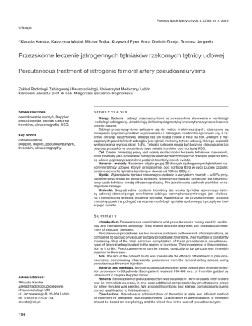 Postępy Nauk Medycznych, t. XXVIII, nr 2, 2015 ©Borgis *Klaudia Karska, Katarzyna Wojtal, Michał Sojka, Krzysztof Pyra, Anna Drelich-Zbroja, Tomasz Jargiełło Przezskórne leczenie jatrogennych tętniaków rzekomych tętnicy udowej Percutaneous treatment of iatrogenic femoral artery pseudoaneurysms Zakład Radiologii Zabiegowej i Neuroradiologii, Uniwersytet Medyczny, Lublin Kierownik Zakładu: prof. dr hab. Małgorzata Szczerbo-Trojanowska Słowa kluczowe Streszczenie cewnikowanie naczyń, Doppler, pseudotętniak, tętniak rzekomy, trombina, ultrasonografia, USG Wstęp. Badania i zabiegi przeznaczyniowe są powszechnie stosowane w kardiologii i radiologii zabiegowej. Umożliwiają dokładną diagnostykę i wewnątrznaczyniowe leczenie chorób naczyń. Zabiegi przeznaczyniowe zaliczane są do metod małoinwazyjnych, obarczone są mniejszym ryzykiem powikłań w porównaniu z zabiegami kardiochirurgicznymi czy z zakresu chirurgii naczyniowej, dlatego też ich liczba rośnie z roku na rok. Jednym z najczęstszych powikłań tych zabiegów jest tętniak rzekomy tętnicy udowej, którego częstość występowania wynosi około 1-8%. Tętniaki rzekome mogą być leczone chirurgicznie lub poprzez przezskórne podanie do jego światła trombiny pod kontrolą USG. Cel. Celem niniejszej pracy jest ocena skuteczności leczenia tętniaków rzekomych, które powstały jako powikłanie zabiegów wewnątrznaczyniowych z dostępu poprzez tętnicę udową poprzez przezskórne podanie trombiny do ich światła. Materiał i metody. Badaniem objęto grupę 36 chorych z jatrogennymi tętniakami rzekomymi tętnicy udowej, którym przezskórnie, pod kontrolą USG w opcji Duplex Doppler, podano do worka tętniaka trombinę w dawce od 100 do 800 j.m. Wyniki. Wykrzepienie tętniaka rzekomego uzyskano u wszystkich chorych – w 97% przypadków natychmiast po podaniu trombiny, w jednym przypadku konieczny był kilkuminutowy ucisk tętniaka sondą ultrasonograficzną. Nie zanotowano żadnych powikłań w następstwie zabiegu. Wnioski. Bezpośrednie podanie trombiny do worka tętniaka rzekomego tętnicy udowej stanowiącego powikłanie zabiegu wewnątrznaczyniowego jest skuteczną i bezpieczną metodą leczenia tętniaka. Kwalifikacja do przezskórnego podania trombiny powinna polegać na ocenie morfologii tętniaka rzekomego i przepływu krwi w jego świetle. Key words catheterisation, Doppler, duplex, pseudoaneurysm, thrombin, ultrasonography Summary Adres/address: *Klaudia Karska Zakład Radiologii Zabiegowej i Neuroradiologii UM ul. Jaczewskiego 8, 20-954 Lublin tel. +48 (81) 724-41-54 [email protected] 104 Introduction. Percutaneous examinations and procedures are widely used in cardiology and interventional radiology. They enable accurate diagnosis and intravascular treatment of vascular diseases. Percutaneous procedures are low invasive and carry out lower risk of complications, as compared to cardiac or vascular surgery procedures; therefore, their number is constantly increasing. One of the most common complication of those procedures is pseudoaneurysm of femoral artery located in the region of puncture. The occurrence of this complication is 1 to 8%. Pseudoaneurysms can be treated surgically or by percutaneus thrombin injection to their sacs. Aim. The aim of the present study was to evaluate the efficacy of treatment of pseudoaneurysms, complicating intravascular procedures from the femoral artery access, using percutaneous thrombin injection. Material and methods. Iatrogenic pseudoaneurysms were treated with thrombin injection procedure in 36 patients. Each patient received 100-800 m.u. of thrombin guided by ultrasound in Duplex Doppler option. Results. Embolization of pseudoaneurysm was obtained in 100% of cases, in 97% there was an immediate success, in one case additional compression by an ultrasound probe for a few minutes was needed. We avoided thrombotic and allergic complications due to correct qualification to this treatment. Conclusions. Percutaneus administration of thrombin is safe and efficient method of treatment of iatrogenic pseudoaneurysms. Qualification to administration of thrombin should be based on morphology and the blood flow in the sack of pseudoaneurysm. Przezskórne leczenie jatrogennych tętniaków rzekomych tętnicy udowej WSTĘP Badania i zabiegi przeznaczyniowe są powszechnie stosowane w kardiologii i radiologii zabiegowej. Umożliwiają dokładną diagnostykę i wewnątrznaczyniowe leczenie chorób naczyń. Wśród zabiegów przeznaczyniowych wymienić należy angioplastykę i stentowanie zwężonych/niedrożnych odcinków naczyń (w tym impantację stentów uwalniających leki), implantację protez naczyniowych w tętniakach i rozwarstwieniach aorty i naczyń biodrowych (stentgrafty aortalne), embolizację tętniaków i malformacji naczyniowych oraz embolizację naczyń patologicznych w przypadku nowotworów. Zabiegi przeznaczyniowe zaliczane są do metod małoinwazyjnych, obarczonych mniejszym ryzykiem powikłań w porównaniu z zabiegami kardiochirurgicznymi czy z zakresu chirurgii naczyniowej, dlatego też ich liczba rośnie z roku na rok. Zabiegi przeznaczyniowe wymagają dostępu naczyniowego: tętniczego lub żylnego, w zależności od rodzaju patologii naczyniowej. Najczęściej dostęp ten uzyskiwany jest poprzez nakłucie tętnicy udowej, tętnicy ramiennej, tętnicy promieniowej lub żyły udowej. Pomimo iż zabiegi przeznaczyniowe są istotnie mniej inwazyjne w porównaniu z zabiegami chirurgicznymi, to nie są one wolne od powikłań. Najczęstszymi jest przedłużające się krwawienie z miejsca nakłucia naczynia. Powikłanie to obserwowane jest zwykle po badaniach i zabiegach wykonywanych z dostępu przez tętnicę, u chorych z nieprawidłowymi parametrami układu krzepnięcia oraz u tych, którzy podczas zabiegu otrzymali heparynę. Przedłużające się krwawienie z miejsca nakłucia tętnicy może prowadzić do powstania tętniaka rzekomego. Częstoś