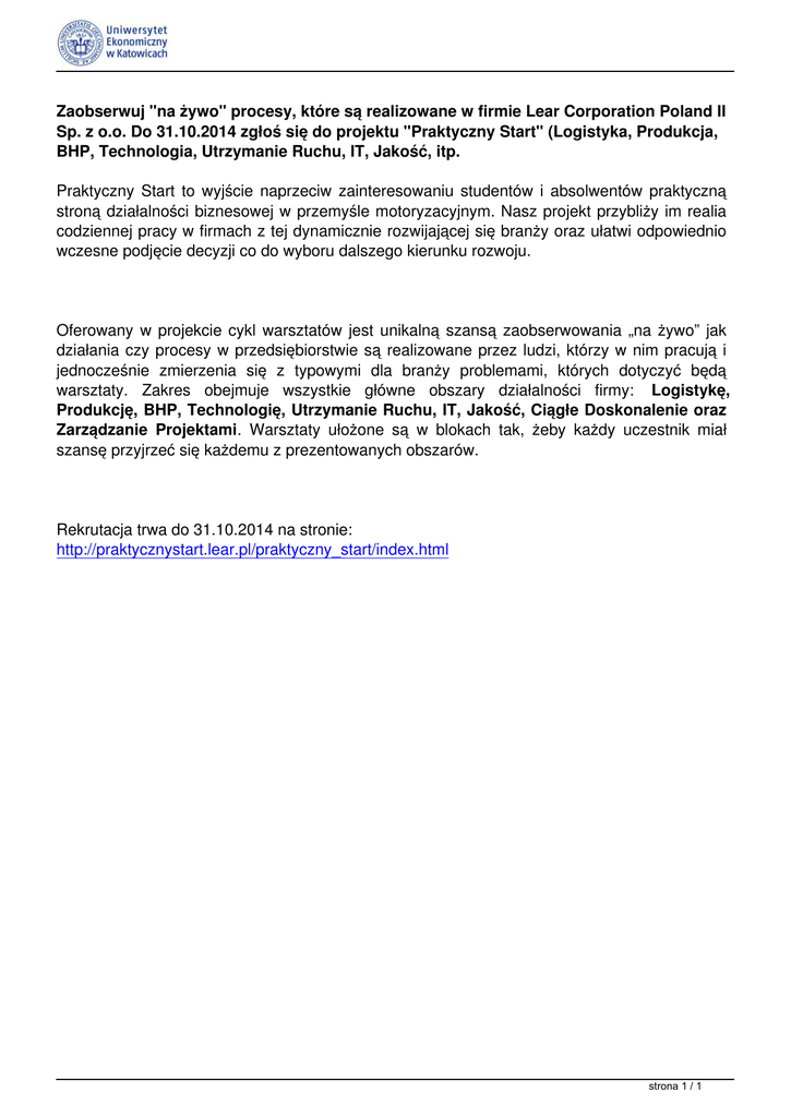 Zaobserwuj "na żywo" procesy, które są realizowane w firmie Lear Corporation Poland II Sp. z o.o. Do 31.10.2014 zgłoś się do projektu "Praktyczny Start" (Logistyka, Produkcja, BHP, Technologia, Utrzymanie Ruchu, IT, Jakość, itp. Praktyczny Start to wyjście naprzeciw zainteresowaniu studentów i absolwentów praktyczną stroną działalności biznesowej w przemyśle motoryzacyjnym. Nasz projekt przybliży im realia codziennej pracy w firmach z tej dynamicznie rozwijającej się branży oraz ułatwi odpowiednio wczesne podjęcie decyzji co do wyboru dalszego kierunku rozwoju. Oferowany w projekcie cykl warsztatów jest unikalną szansą zaobserwowania „na żywo” jak działania czy procesy w przedsiębiorstwie są realizowane przez ludzi, którzy w nim pracują i jednocześnie zmierzenia się z typowymi dla branży problemami, których dotyczyć będą warsztaty. Zakres obejmuje wszystkie główne obszary działalności firmy: Logistykę, Produkcję, BHP, Technologię, Utrzymanie Ruchu, IT, Jakość, Ciągłe Doskonalenie oraz Zarządzanie Projektami. Warsztaty ułożone są w blokach tak, żeby każdy uczestnik miał szansę przyjrzeć się każdemu z prezentowanych obszarów. Rekrutacja trwa do 31.10.2014 na stronie: http://praktycznystart.lear.pl/praktyczny_start/index.html strona 1 / 1
