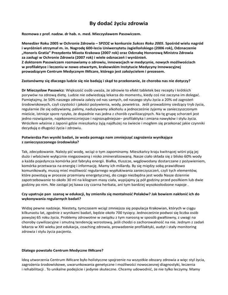 By dodać życiu zdrowia Rozmowa z prof. nadzw. dr hab. n. med. Mieczysławem Pasowiczem. Menedżer Roku 2005 w Ochronie Zdrowia – SPZOZ w konkursie Sukces Roku 2005. Spośród wielu nagród i wyróżnień otrzymał m. in. Nagrodę 600-lecia Uniwersytetu Jagiellońskiego (2006 rok), Odznaczenie „Honoris Gratia” Prezydenta Miasta Krakowa (2007 rok) oraz Odznakę Honorową Ministra Zdrowia za zasługi w Ochronie Zdrowia (2007 rok) i wiele odznaczeń i wyróżnień. Z doktorem Pasowiczem rozmawiamy o zdrowiu, innowacjach w medycynie, nowych możliwościach w profilaktyce i leczeniu w nowo otwartym, krakowskim Instytucie Medycyny Innowacyjnej prowadzącym Centrum Medycznym IMIcare, którego jest założycielem i prezesem. Zastanówmy się dlaczego ludzie się nie badają i skąd to przekonanie, że choroba nas nie dotyczy? Dr Mieczysław Pasowicz: Większość osób uważa, że zdrowie to efekt tabletek bez recepty i krótkich porywów na zdrową dietę. Ludzie nie odwiedzają lekarza do momentu, kiedy coś nie zaczyna im dolegać. Pamiętajmy, że 50% naszego zdrowia zależy od nas samych, od naszego stylu życia a 20% od zagrożeń środowiskowych, czyli czystości i jakości pożywienia, wody, powietrza. Jeśli prowadzimy siedzący tryb życia, regularnie źle się odżywiamy, palimy, nadużywamy alkoholu a jednocześnie żyjemy w zanieczyszczonym mieście, istnieje spore ryzyko, że dopadnie nas jedna z chorób cywilizacyjnych. Na tę grupę schorzeń jest jedno rozwiązanie, najekonomiczniejsze i najrozsądniejsze‒ profilaktyka i zmiana nawyków i stylu życia. Wróciłem właśnie z Japonii gdzie mieszkańcy żyją najdłużej na świecie i mogłem się przekonać jakie czynniki decydują o długości życia i zdrowiu. Potwierdza Pan wyniki badań, że woda pomaga nam zmniejszyć zagrożenia wynikające z zanieczyszczonego środowiska? Tak, zdecydowanie. Należy pić wodę, wciąż o tym zapominamy. Mieszkańcy kraju kwitnącej wiśni piją jej dużo i właściwie wyłącznie niegazowaną i nisko zmineralizowaną. Nasze ciało składa się z blisko 60% wody a każda pojedyncza komórka jest fabryką energii. Białka, tłuszcze, węglowodany dostarczane z pożywieniem, komórka przetwarza na energię i informację. Mamy ich miliardy. By się między sobą prawidłowo komunikowały, muszą mieć możliwość regularnego wypłukiwania zanieczyszczeń, czyli tych elementów, które powstają w procesie przemiany energetycznej, do czego niezbędna jest woda Nasze dziennie zapotrzebowanie to około 30 ml na kilogram masy ciała, wypijajmy ją pół godziny przed posiłkiem lub dwie godziny po nim. Nie zastąpi jej kawa czy czarna herbata, ani tym bardziej wysokosłodzone napoje . Czy upatruje pan szansę w edukacji, by zmieniła się mentalność Polaków? Jak bowiem nakłonić ich do wykonywania regularnych badań? Widzę pewne nadzieje. Niestety, tymczasem wciąż zmniejsza się populacja Krakowian, których w ciągu kilkunastu lat, zgodnie z wynikami badań, będzie około 700 tysięcy. Jednocześnie podwoi się liczba osób powyżej 65 roku życia. Problemy zdrowotne w związku z tym narosną w sposób gwałtowny, z uwagi na choroby cywilizacyjne i smutną tendencję wzrostową, jeśli chodzi o zachorowalność na nie. Jednym z zadań lekarza w XXI wieku jest edukacja, coaching zdrowia, prowadzenie profilaktyki, audyt i stały monitoring zdrowia i stylu życia pacjenta. Dlatego powstało Centrum Medyczne IMIcare? Ideą utworzenia Centrum IMIcare było holistyczne spojrzenie na wszystkie obszary zdrowia a więc styl życia, zagrożenia środowiskowe, uwarunkowania genetyczne i możliwości nowoczesnej diagnostyki, leczenia i rehabilitacji . To unikalne podejście i jedynie skuteczne. Chcemy udowodnić, że nie tylko leczymy. Mamy konsultantów, specjalistów, diagnostykę, rehabilitację, badania laboratoryjne, ale przede wszystkim dodajemy zdrowia ‒zwracamy uwagę na styl życia pacjenta w tym: dietę, skład wody jaką pacjent spożywa, powietrze jakim oddycha, kładziemy nacisk na systematyczne badania i przeglądy zdrowia. W naszym centrum nie chcemy w skupiać się jedynie chorobach, lecz przede wszystkim skoncentrować się na utrzymaniu zdrowia. Nie chodzi nam bowiem o wyszukiwanie choroby, tylko wyraźne nakreślenie: zbadaliśmy cię, masz przeciążony układ krążenia, układ oddechowy czy też układ narządu ruchu. Zmień styl życia. Przeprowadzimy cię przez tę zmianę. Rzeczywiście wciąż bagatelizujemy jakość życia, w tej kwestii jesteśmy na szarym końcu Europy. Chcemy to zmienić, zgodnie z definicją WHO, najważniejsze jest poczucie zdrowia i jakość życia. Najnowsza medycyna cały czas walczy o to, by dodać pacjentowi życia w zdrowiu. Celem dla Europy 2020 jest zatem realizacja hasła - Dodajemy dwa lata życia w zdrowiu dla populacji europejskiej. Popieramy tę ideę z całego serca. Światowa medycyna idzie też wyraźnie w kierunku personalizacji, rozważania indywidualnych przypadków ludzkich, dokładnego poznania pacjenta, stylu jego życia. Podpisujemy się pod tym. Nie chodzi bowiem o przepisywanie kolejnych tabletek lecz o pomoc w dodawaniu zdrowia na co dzień i wspieranie pacjentów w ich trudnościach. Wizyta lekarska w IMIcare będzie się opierać głównie na rozmowie? Tak, od tego zaczynamy. Rozmowa jest tym, czego w Polsce brakuje zarówno lekarzom jak i pacjentom. Jeśli chodzi o styl życia, głównym naszym głosem doradczym są lekarze prowadzący i dietetycy. Przeprowadzają audyt zdrowia i kontrolują terapię pacjenta na bieżąco, telefonicznie i mailowo. Pamiętajmy, że nawyki żywieniowe i aktywność fizyczna trzeba dobierać indywidualnie do stylu życia, to bardzo ważne. IMIcare stoi na straży zwalczania epidemii chorób cywilizacyjnych , także otyłości? Oczywiście, do dyspozycji pacjentów mamy specjalne urządzenia, które analizują skład ciała, wyznaczają wiek metaboliczny, określają niedobór wody, 