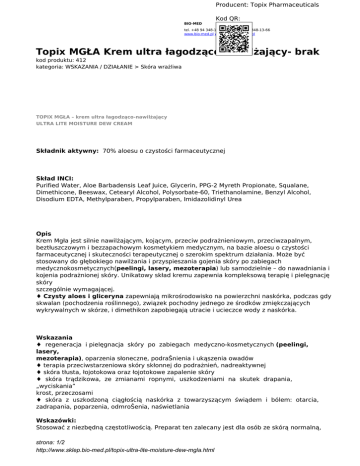Producent: Topix Pharmaceuticals BIO-MED Kod QR: tel. +48 94 348-13-65 Fax.. +48 94 348-13-66 www.bio-med.pl www.sklep.bio-med.pl Topix MGŁA Krem ultra łagodząco-nawilżający- brak kod produktu: 412 kategoria: WSKAZANIA / DZIAŁANIE > Skóra wrażliwa TOPIX MGŁA – krem ultra łagodząco-nawilżający ULTRA LITE MOISTURE DEW CREAM Składnik aktywny: 70% aloesu o czystości farmaceutycznej Skład INCI: Purified Water, Aloe Barbadensis Leaf Juice, Glycerin, PPG-2 Myreth Propionate, Squalane, Dimethicone, Beeswax, Cetearyl Alcohol, Polysorbate-60, Triethanolamine, Benzyl Alcohol, Disodium EDTA, Methylparaben, Propylparaben, Imidazolidinyl Urea Opis Krem Mgła jest silnie nawilżającym, kojącym, przeciw podrażnieniowym, przeciwzapalnym, beztłuszczowym i bezzapachowym kosmetykiem medycznym, na bazie aloesu o czystości farmaceutycznej i skuteczności terapeutycznej o szerokim spektrum działania. Może być stosowany do głębokiego nawilżania i przyspieszania gojenia skóry po zabiegach medycznokosmetycznych(peelingi, lasery, mezoterapia) lub samodzielnie – do nawadniania i kojenia podrażnionej skóry. Unikatowy skład kremu zapewnia kompleksową terapię i pielęgnację skóry szczególnie wymagającej. ♦ Czysty aloes i gliceryna zapewniają mikrośrodowisko na powierzchni naskórka, podczas gdy skwalan (pochodzenia roślinnego), związek pochodny jednego ze środków zmiękczających wykrywalnych w skórze, i dimethikon zapobiegają utracie i ucieczce wody z naskórka. Wskazania ♦ regeneracja i pielęgnacja skóry po zabiegach medyczno-kosmetycznych (peelingi, lasery, mezoterapia), oparzenia słoneczne, podraŜnienia i ukąszenia owadów ♦ terapia przeciwstarzeniowa skóry skłonnej do podrażnień, nadreaktywnej ♦ skóra tłusta, łojotokowa oraz łojotokowe zapalenie skóry ♦ skóra trądzikowa, ze zmianami ropnymi, uszkodzeniami na skutek drapania, „wyciskania” krost, przeczosami ♦ skóra z uszkodzoną ciągłością naskórka z towarzyszącym świądem i bólem: otarcia, zadrapania, poparzenia, odmroŜenia, naświetlania Wskazówki: Stosować z niezbędną częstotliwością. Preparat ten zalecany jest dla osób ze skórą normalną, strona: 1/2 http://www.sklep.bio-med.pl/topix-ultra-lite-moisture-dew-mgla.html tłustą i mieszaną. Produkt ten sprawdza się również jako uzupełniający środek nawilżający przy stosowaniu innych preparatów. Opakowanie : 57g. strona: 2/2 http://www.sklep.bio-med.pl/topix-ultra-lite-moisture-dew-mgla.html