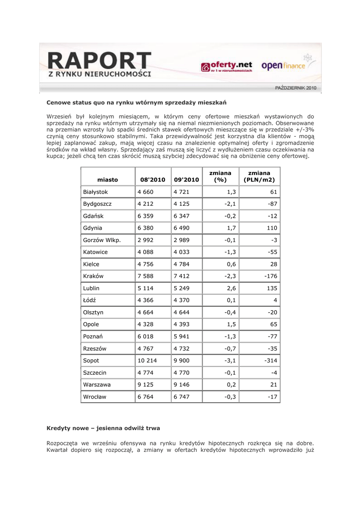 Cenowe status quo na rynku wtórnym sprzedaży mieszkań Wrzesień był kolejnym miesiącem, w którym ceny ofertowe mieszkań wystawionych do sprzedaży na rynku wtórnym utrzymały się na niemal niezmienionych poziomach. Obserwowane na przemian wzrosty lub spadki średnich stawek ofertowych mieszczące się w przedziale +/-3% czynią ceny stosunkowo stabilnymi. Taka przewidywalność jest korzystna dla klientów - mogą lepiej zaplanować zakup, mają więcej czasu na znalezienie optymalnej oferty i zgromadzenie środków na wkład własny. Sprzedający zaś muszą się liczyć z wydłużeniem czasu oczekiwania na kupca; jeżeli chcą ten czas skrócić muszą szybciej zdecydować się na obniżenie ceny ofertowej. miasto 08'2010 09'2010 zmiana (%) zmiana (PLN/m2) Białystok 4 660 4 721 1,3 61 Bydgoszcz 4 212 4 125 -2,1 -87 Gdańsk 6 359 6 347 -0,2 -12 Gdynia 6 380 6 490 1,7 110 Gorzów Wlkp. 2 992 2 989 -0,1 -3 Katowice 4 088 4 033 -1,3 -55 Kielce 4 756 4 784 0,6 28 Kraków 7 588 7 412 -2,3 -176 Lublin 5 114 5 249 2,6 135 Łódź 4 366 4 370 0,1 4 Olsztyn 4 664 4 644 -0,4 -20 Opole 4 328 4 393 1,5 65 Poznań 6 018 5 941 -1,3 -77 Rzeszów 4 767 4 732 -0,7 -35 Sopot 10 214 9 900 -3,1 -314 Szczecin 4 774 4 770 -0,1 -4 Warszawa 9 125 9 146 0,2 21 Wrocław 6 764 6 747 -0,3 -17 Kredyty nowe – jesienna odwilż trwa Rozpoczęta we wrześniu ofensywa na rynku kredytów hipotecznych rozkręca się na dobre. Kwartał dopiero się rozpoczął, a zmiany w ofertach kredytów hipotecznych wprowadziło już prawie dziesięć banków. Warto wymienić m.in. Bank BPH, który dostosował swą ofertę do warunków rynkowych, bo dotychczas była ona jedną z najsłabszych. Bank dał wyraźny sygnał, że wraca do gry. Osobom posiadającym 25-proc. wkład własny BPH udzieli kredytu z marżą 1,41,8 pkt proc., czyli poniżej rynkowej średniej. Z największych graczy ofertę swoją poprawiły także Bank Pekao i Kredyt Bank. Niejasna pozostaje kwestia zamierzeń Komisji Nadzoru Finansowego co do ograniczenia liczby udzielanych walutowych kredytów hipotecznych. Bankom pomysły KNF są nie w smak, Związek Banków Polskich przekazał już Komisji swoje stanowisko. Wygląda jednak na to, że ograniczenia w końcu zostaną wprowadzone, swój głos sprzeciwu do tej formy finansowania nieruchomości wyraził ostatnio też doradca prezesa NBP Wojciech Kwaśniak, co tylko umocniło stanowisko KNFu. Na razie nie wiadomo jednak, jak dokładnie wyglądać będzie nowa rekomendacja, ani kiedy wejdzie w życie. Tymczasem, wbrew oczekiwaniom KNF-u, banki nie zaczęły wycofywać się z udzielania kredytów walutowych, wręcz przeciwnie. W październiku do grupy instytucji oferujących hipoteki w euro ostrożnie (wymagając 20-proc. wkładu własnego i ponadprzeciętnych zarobków) dołączył Lukas Bank, Polbank z kolei obniżył wymagania dotyczące wkładu własnego z 20 do 10 procent. Kredyty spłacane – frank dalej tanieje Październik był miesiącem kontynuacji rozpoczętego na przełomie sierpnia i września trendu: złoty dalej umacnia się wobec franka szwajcarskiego. Od początku lipca kurs franka spadł o 25 groszy, dzięki czemu, mimo wzrostu stawki LIBOR CHF, kredytobiorcy zadłużeni w tej walucie płacą dziś raty o 7-8 proc. niższe niż przed kwartałem. W ciągu miesiąca kurs franka spadł o prawie 9 groszy, dzięki czemu rata kredytu w tej walucie jest niższa od tej sprzed miesiąca o około 12,50 zł na każde 100 tys. kredytu (o 2,8 proc.). Więcej płacą za to niektórzy kredytobiorcy zadłużeni w euro, a to za sprawą zmiany stawki EURIBOR 3M, która od publikacji naszego poprzedniego raportu wzrosła o 16,5 pkt bazowego do 1,045. Niektóre banki nawet 3-miesięczne stawki aktualizują co miesiąc i to ich klienci muszą pogodzić się z nieco wyższą ratą (o około 2-proc. – 9 zł na każde 100 tys. kredytu). Kurs EUR/PLN podlegał w ostatnich 30 dniach wahaniom i jeśli ktoś płaci ratę kredytu w euro w połowie miesiąca to mógł załapać się na miesięczny dołek kiedy to średni kurs EUR/PLN w NBP znalazł się poniżej 3,90. Na koniec października euro wróciło jednak do poziomów sprzed miesiąca. Zgodnie z oczekiwaniami większości analityków Rada Polityki Pieniężnej na październikowym posiedzeniu pozostawiła najważniejsze stopy procentowe na niezmienionych poziomach. Trzymiesięczny WIBOR też nie podlegał większym wahaniom i cały miesiąc znajdował się w przedziale 3,82-3,84, by dopiero pod koniec października wspiąć się o dwa punkty bazowe powyżej górnej granicy tego przedziału. W okolicach 3,8-3,9 proc. WIBOR 3M oscyluje już od pół roku, ostatni raz tak długi okres stabilizacji (a nawet dłuższy – trwał trzy kwartały) tego wskaźnika mieliśmy od połowy 2006 roku. Tak nieznaczne wahania są zbyt małe, by wpłynąć na stawki wg których banki wyliczają oprocentowanie kredytów hipotecznych. Jeśli już do zmiany dochodzi to w przełożeniu na obciążenie budżetu domowego nie wynosi ona więcej niż kilka złotych na każde 100 tys. kredytu. Warszawa – o ile jest droższa? Powszechnie wiadomo, że ceny mieszkań w Warszawie są najwyższe w Polsce. Pomijając stawki za apartamenty w Sopocie, Juracie czy Zakopanem średnia ofertowa w stolicy wynosząca 9146 PLN za m2 jest nawet kilkakrotnie wyższa od średnich w innych miastach Polski. Wspomniane dysproporcje nie dziwią ale ich skala dla wielu osób, zwłaszcza mniej zorientowanych w cenach mieszkań, może być zaskakująca. Szczególnie dla posiadaczy mieszkań, którzy myślą o przeprowadzce na stałe do większego miasta. Ogromne różnice w cenach lokali sprawiają bowiem, że kwota uzyskana ze sprzedaży nawet średniej wielkości mieszkania w małym mieście może nie wystarczyć na zakup kawalerki w innym. Serwis Oferty.net przeprowadził kalkulację pokazującą jakiej wielkości mieszkanie można kupić za kwotę uzyskaną ze zbycia 50 metrowego mieszkania w wybranych 2