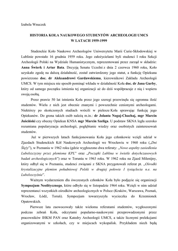 Izabela Wnuczek HISTORIA KOŁA NAUKOWEGO STUDENTÓW ARCHEOLOGII UMCS W LATACH 1959-1999 Studenckie Koło Naukowe Archeologów Uniwersytetu Marii Curie-Skłodowskiej w Lublinie powstało 16 grudnia 1959 roku. Jego założycielami byli studenci I roku Sekcji Archeologii Polski na Wydziale Humanistycznym, reprezentowani przez zarząd w składzie: Anna Świerk i Artur Bata. Decyzją Senatu Uczelni z dnia 2 czerwca 1960 roku, Koło uzyskało zgodę na dalszą działalność, został zatwierdzony jego statut, a funkcję Opiekuna powierzono doc. dr Aleksandrowi Gardawskiemu, kierownikowi Zakładu Archeologii UMCS. W tym miejscu nie sposób pominąć wkładu w działalność Koła doc. dr Jana Gurby, który od samego początku istnienia tej organizacji aż do dziś współpracuje z nią i wspiera swoją osobą. Przez prawie 50 lat istnienia Koła przez jego szeregi przewinęła się ogromna ilość studentów. Wielu z nich jest obecnie znanymi i powszechnie cenionymi archeologami. Niektórzy po skończonych studiach wrócili w pielesze Koła sprawując funkcję jego Opiekunów. Do grona takich osób należą m.in.: dr Jolanta Nogaj-Chachaj, mgr Marcin Juściński czy obecny Opiekun KNSA mgr Marcin Szeliga. U podstaw SKNA legła szeroko rozumiana popularyzacja archeologii, pogłębianie wiedzy oraz osobistych zainteresowań studentów. Już w pierwszych latach funkcjonowania Koła jego członkowie wzięli udział w Zjazdach Studenckich Kół Naukowych Archeologii we Wrocławiu w 1960 roku („Dni Ślęży”), w Poznaniu w 1962 roku (gdzie wygłoszono dwa referaty: „Nowe aspekty zasiedlenia Lubelszczyzny przez plemiona KPL” oraz „Początki Lublina w świetle dotychczasowych badań archeologicznych”) oraz w Toruniu w 1963 roku. W 1962 roku na Zjazd Milenijny, który odbył się w Poznaniu, studenci związani z SKNA przygotowali referat pt. „Ośrodki krystalizacyjne plemion południowej Polski w drugiej połowie I tysiąclecia n.e. na Lubelszczyźnie”. Ważnym wydarzeniem dla ówczesnych członków Koła było podjęcie się organizacji Sympozjum Neolitycznego, które odbyło się w listopadzie 1964 roku. Wzięli w nim udział reprezentanci wszystkich ośrodków archeologicznych w Polsce (Kraków, Warszawa, Poznań, Wrocław, Łódź, Toruń). Sympozjum towarzyszyła wycieczka do Krzemionek Opatowskich. Pierwsze lata zaowocowały także wieloma referatami studentów, wygłoszonymi podczas zebrań Koła, odczytami popularno-naukowymi przeprowadzonymi przez pracowników IHKM PAN oraz Katedry Archeologii UMCS, a także licznymi prelekcjami organizowanymi w szkołach, czy w miejscach wykopalisk. Przykładem niech będą wykopaliska w Strzyżowie w 1961 roku, podczas których oprowadzano po terenie badań wycieczki, przybliżając zainteresowanym odległe pradzieje. Akcji tej towarzyszyła wystawa przygotowana przez uczniów pobliskich szkół. Z działalnością SKNA szły w parze liczne wycieczki badawcze. W latach 1960-1962 odbyły się wyjazdy do Warszawy, Krakowa, Oświęcimia, Igołomii, Poznania, Gniezna oraz Kórnika. W roku akademickim 1961/1962 Członkowie SKNA wraz z Kołem Etnografów i Językoznawców spędzili wakacje na obozie naukowo-wypoczynkowym na Mazurach. Natomiast w roku akademickim 1964/1965 doszła do skutku wymiana ze studentami z Debreczyna. W ramach tego programu studenci związani z SKNA wyjechali na wycieczkę do Węgier. W 1965 roku działalność Studenckiego Koła Naukowego Archeologów została zawieszona, z powodu wstrzymania naboru nowych studentów. Stan ten trwał do 1974 roku, kiedy to reaktywowano działalność Koła i przemianowano je na Koło Naukowe Studentów Archeologii, która to nazwa towarzyszy mu również dzisiaj. W dniach 6 i 7 grudnia 1975 roku odbyła się uroczysta sesja naukowa na okazję obchodów XXX-lecia działalności Zakładu Archeologii – najstarszej jednostki Wydziału Humanistycznego UMCS. W jej trakcie Łukasz Rejniewicz – Przewodniczący Rady Wydziałowej Samorządu Studentów Wydziału Humanistycznego przedstawił zebranym słuchaczom „Plany i zamierzenia Studenckiego Koła Archeologicznego”. W tym samym roku została wydana pierwsza publikacja Koła – „Pradzieje Lubelszczyzny w prasie lubelskiej: (bibliografia za lata 1960-1974)”. Powstała ona na podstawie lubelskich dzienników: „Sztandar Ludu” i „Kurier Lubelski” oraz dwutygodnika „Kamena”. Lata 1977-1979 były czasem licznych odczytów organizowanych w szkołach czy muzeach przez członków KNSA. Studenci odwiedzili wiele placówek oświatowych (m.in. Hrubieszów, Zamość, Tyszowce, Turkowice, Bełżec, Biłgoraj) prowadząc spotkania z młodzieżą, na których poruszali ważne tematy z zakresu archeologii. W czasie prelekcji kładli nacisk na ochronę zabytków archeologicznych i natychmiastowe zgłaszanie w odpowiednich placówkach przypadkowych odkryć. Akcja ta miała także charakter popularyzatorski i dotyczyła przede wszystkim pradziejów okolic Tomaszowa i Hrubieszowa oraz najnowszych osiągnięć lubelskiej archeologii na tych terenach. Ważnym wydarzeniem w działalności KNSA było podjęcie się organizacji VII Międzynarodowej Sesji Studentów Archeologii w Werbkowicach k. Hrubieszowa. Tematem konferencji, która odbyła się ona w dniach 17-22 kwietnia 1978 roku pod patronatem Jego Magnificencji Rektora UMCS prof. dr hab. Wiesława Skrzydło oraz Wojewody Zamojskiego dr Stanisława Juszczaka, były „Kontakty interkulturowe w Europie Środkowej w pradziejach i we wczesnym średniowieczu motorem postępu”. Sesja zgromadziła studentów z wszystkich ośrodków archeologicznych w Polsce oraz z wielu placówek zagranicznych (Brno, Praga, Bukareszt, Budapeszt, Lyon, Edynburg). Łącznie wygłoszono 26 referatów naukowych, ocenianych przez jury, w którego składzie znaleźli się znakomici archeolodzy: prof. dr hab. Marek Gedl, John Morfey (Londyn), mgr Michał Parczewski, prof. dr hab. Kazimierz Godłowski, doc. dr hab. Andrzej 