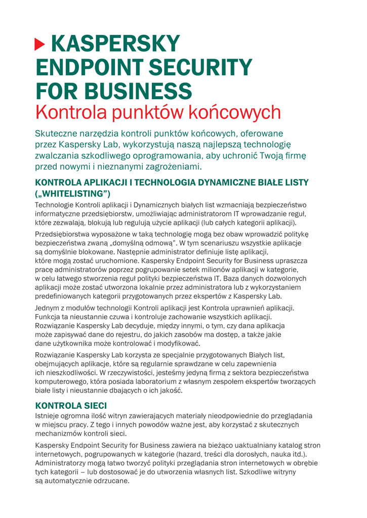 KASPERSKY ENDPOINT SECURITY FOR BUSINESS Kontrola punktów końcowych Skuteczne narzędzia kontroli punktów końcowych, oferowane przez Kaspersky Lab, wykorzystują naszą najlepszą technologię zwalczania szkodliwego oprogramowania, aby uchronić Twoją firmę przed nowymi i nieznanymi zagrożeniami. KONTROLA APLIKACJI I TECHNOLOGIA DYNAMICZNE BIAŁE LISTY („WHITELISTING”) Technologie Kontroli aplikacji i Dynamicznych białych list wzmacniają bezpieczeństwo informatyczne przedsiębiorstw, umożliwiając administratorom IT wprowadzanie reguł, które zezwalają, blokują lub regulują użycie aplikacji (lub całych kategorii aplikacji). Przedsiębiorstwa wyposażone w taką technologię mogą bez obaw wprowadzić politykę bezpieczeństwa zwaną „domyślną odmową”. W tym scenariuszu wszystkie aplikacje są domyślnie blokowane. Następnie administrator definiuje listę aplikacji, które mogą zostać uruchomione. Kaspersky Endpoint Security for Business upraszcza pracę administratorów poprzez pogrupowanie setek milionów aplikacji w kategorie, w celu łatwego stworzenia reguł polityki bezpieczeństwa IT. Baza danych dozwolonych aplikacji może zostać utworzona lokalnie przez administratora lub z wykorzystaniem predefiniowanych kategorii przygotowanych przez ekspertów z Kaspersky Lab. Jednym z modułów technologii Kontroli aplikacji jest Kontrola uprawnień aplikacji. Funkcja ta nieustannie czuwa i kontroluje zachowanie wszystkich aplikacji. Rozwiązanie Kaspersky Lab decyduje, między innymi, o tym, czy dana aplikacja może zapisywać dane do rejestru, do jakich zasobów ma dostęp, a także jakie dane użytkownika może kontrolować i modyfikować. Rozwiązanie Kaspersky Lab korzysta ze specjalnie przygotowanych Białych list, obejmujących aplikacje, które są regularnie sprawdzane w celu zapewnienia ich nieszkodliwości. W rzeczywistości, jesteśmy jedyną firmą z sektora bezpieczeństwa komputerowego, która posiada laboratorium z własnym zespołem ekspertów tworzących białe listy i nieustannie dbających o ich jakość. KONTROLA SIECI Istnieje ogromna ilość witryn zawierających materiały nieodpowiednie do przeglądania w miejscu pracy. Z tego i innych powodów ważne jest, aby korzystać z skutecznych mechanizmów kontroli sieci. Kaspersky Endpoint Security for Business zawiera na bieżąco uaktualniany katalog stron internetowych, pogrupowanych w kategorie (hazard, treści dla dorosłych, nauka itd.). Administratorzy mogą łatwo tworzyć polityki przeglądania stron internetowych w obrębie tych kategorii – lub dostosować je do utworzenia własnych list. Szkodliwe witryny są automatycznie odrzucane. Polityki mogą zostać ustawione zgodnie z harmonogramem, aby umożliwić przeglądanie pewnych stron w określonych porach dnia, a ponieważ Kontrola sieci w Kaspersky Endpoint Security for Business integruje się z istniejącą strukturą Active Directory, utworzone reguły mogą być stosowane w obrębie przedsiębiorstwa szybko i łatwo. Innowacyjne podejście zastosowane w rozwiązaniu Kaspersky Lab pozwala na użycie tej technologii bezpośrednio na punkcie końcowym. Oznacza to, że każda ustawiona polityka będzie egzekwowana, nawet gdy użytkownik znajduje się poza siecią firmową. KONTROLA URZĄDZEŃ Wyłączenie portu USB nie zawsze oznacza rozwiązanie problemów z prywatnymi urządzeniami wymiennymi pracowników. Często wymagany jest bardziej szczegółowy poziom kontroli, aby zapewnić wydajność i bezpieczeństwo użytkownika. Na przykład, jeśli użytkownik musi podłączyć token USB VPN, aby uzyskać dostęp do sieci – ale nie wolno mu podłączać wymiennych urządzeń pamięci masowej – polityka „wyłącz port USB” nie zadziała. Kaspersky Endpoint Security for Business umożliwia administratorowi zdefiniować politykę i kontrolować wszystkie podłączane urządzenia na dowolnej magistrali (nie tylko USB) i w dowolnym czasie. Oznacza to, że administrator jest w stanie decydować, jakie urządzenia można podłączać i wykorzystywać do odczytu lub zapisu, o jakiej porze dnia polityka ma być aktywna i jakie typy urządzeń są dozwolone. Dla skrajnego bezpieczeństwa, kontrolę można zastosować nawet z uwzględnieniem numeru seryjnego konkretnego urządzenia. ŁATWA ADMINISTRACJA Ponieważ rozwiązanie Kaspersky Endpoint Security for Business zostało stworzone z myślą o administratorach, wszystkie funkcje kontroli integrują się z Active Directory. Dzięki temu definiowanie polityk jest łatwe i szybkie. Wszystkie funkcje kontroli są zarządzane z tej samej konsoli, co oznacza, że administrator posiada jeden intuicyjny interfejs, który nie wymaga dodatkowych szkoleń. Jak dokonać zakupu? Narzędzia kontroli Kaspersky Lab nie są sprzedawane oddzielnie – stanowią składnik poniższych poziomów linii Kaspersky Security for Business: • Endpoint Security, Select • Endpoint Security, Advanced • Kaspersky Total Security for Business NIE WSZYSTKIE FUNKCJE SĄ DOSTĘPNE NA WSZYSTKICH PLATFORMACH. Dowiedz się więcej na www.kaspersky.pl. KESB-CONTROL/Version 0.2/NOV12/Global © 2013 Kaspersky Lab ZAO. Wszelkie prawa zastrzeżone. Zarejestrowane znaki towarowe i nazwy usług należą do ich prawowitych właścicieli.