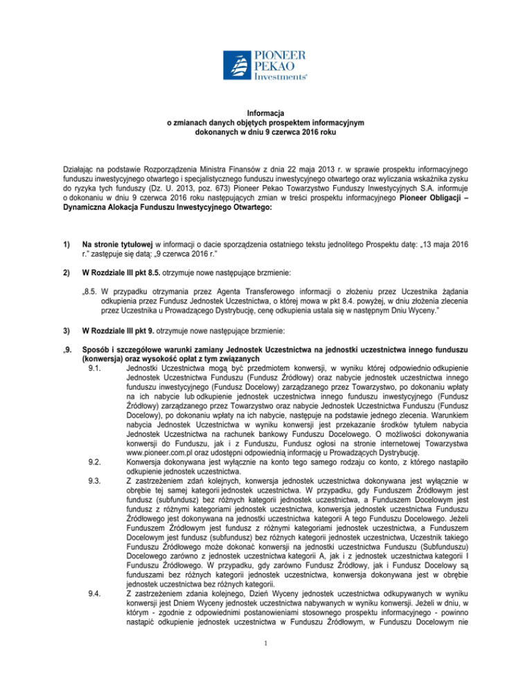Informacja o zmianach danych objętych prospektem informacyjnym dokonanych w dniu 9 czerwca 2016 roku Działając na podstawie Rozporządzenia Ministra Finansów z dnia 22 maja 2013 r. w sprawie prospektu informacyjnego funduszu inwestycyjnego otwartego i specjalistycznego funduszu inwestycyjnego otwartego oraz wyliczania wskaźnika zysku do ryzyka tych funduszy (Dz. U. 2013, poz. 673) Pioneer Pekao Towarzystwo Funduszy Inwestycyjnych S.A. informuje o dokonaniu w dniu 9 czerwca 2016 roku następujących zmian w treści prospektu informacyjnego Pioneer Obligacji – Dynamiczna Alokacja Funduszu Inwestycyjnego Otwartego: 1) Na stronie tytułowej w informacji o dacie sporządzenia ostatniego tekstu jednolitego Prospektu datę: „13 maja 2016 r.” zastępuje się datą: „9 czerwca 2016 r.” 2) W Rozdziale III pkt 8.5. otrzymuje nowe następujące brzmienie: „8.5. W przypadku otrzymania przez Agenta Transferowego informacji o złożeniu przez Uczestnika żądania odkupienia przez Fundusz Jednostek Uczestnictwa, o której mowa w pkt 8.4. powyżej, w dniu złożenia zlecenia przez Uczestnika u Prowadzącego Dystrybucję, cenę odkupienia ustala się w następnym Dniu Wyceny.” 3) W Rozdziale III pkt 9. otrzymuje nowe następujące brzmienie: „9. Sposób i szczegółowe warunki zamiany Jednostek Uczestnictwa na jednostki uczestnictwa innego funduszu (konwersja) oraz wysokość opłat z tym związanych 9.1. Jednostki Uczestnictwa mogą być przedmiotem konwersji, w wyniku której odpowiednio odkupienie Jednostek Uczestnictwa Funduszu (Fundusz Źródłowy) oraz nabycie jednostek uczestnictwa innego funduszu inwestycyjnego (Fundusz Docelowy) zarządzanego przez Towarzystwo, po dokonaniu wpłaty na ich nabycie lub odkupienie jednostek uczestnictwa innego funduszu inwestycyjnego (Fundusz Źródłowy) zarządzanego przez Towarzystwo oraz nabycie Jednostek Uczestnictwa Funduszu (Fundusz Docelowy), po dokonaniu wpłaty na ich nabycie, następuje na podstawie jednego zlecenia. Warunkiem nabycia Jednostek Uczestnictwa w wyniku konwersji jest przekazanie środków tytułem nabycia Jednostek Uczestnictwa na rachunek bankowy Funduszu Docelowego. O możliwości dokonywania konwersji do Funduszu, jak i z Funduszu, Fundusz ogłosi na stronie internetowej Towarzystwa www.pioneer.com.pl oraz udostępni odpowiednią informację u Prowadzących Dystrybucję. 9.2. Konwersja dokonywana jest wyłącznie na konto tego samego rodzaju co konto, z którego nastąpiło odkupienie jednostek uczestnictwa. 9.3. Z zastrzeżeniem zdań kolejnych, konwersja jednostek uczestnictwa dokonywana jest wyłącznie w obrębie tej samej kategorii jednostek uczestnictwa. W przypadku, gdy Funduszem Źródłowym jest fundusz (subfundusz) bez różnych kategorii jednostek uczestnictwa, a Funduszem Docelowym jest fundusz z różnymi kategoriami jednostek uczestnictwa, konwersja jednostek uczestnictwa Funduszu Źródłowego jest dokonywana na jednostki uczestnictwa kategorii A tego Funduszu Docelowego. Jeżeli Funduszem Źródłowym jest fundusz z różnymi kategoriami jednostek uczestnictwa, a Funduszem Docelowym jest fundusz (subfundusz) bez różnych kategorii jednostek uczestnictwa, Uczestnik takiego Funduszu Źródłowego może dokonać konwersji na jednostki uczestnictwa Funduszu (Subfunduszu) Docelowego zarówno z jednostek uczestnictwa kategorii A, jak i z jednostek uczestnictwa kategorii I Funduszu Źródłowego. W przypadku, gdy zarówno Fundusz Źródłowy, jak i Fundusz Docelowy są funduszami bez różnych kategorii jednostek uczestnictwa, konwersja dokonywana jest w obrębie jednostek uczestnictwa bez różnych kategorii. 9.4. Z zastrzeżeniem zdania kolejnego, Dzień Wyceny jednostek uczestnictwa odkupywanych w wyniku konwersji jest Dniem Wyceny jednostek uczestnictwa nabywanych w wyniku konwersji. Jeżeli w dniu, w którym - zgodnie z odpowiednimi postanowieniami stosownego prospektu informacyjnego - powinno nastąpić odkupienie jednostek uczestnictwa w Funduszu Źródłowym, w Funduszu Docelowym nie 1 9.5. 9.6. 9.7. 9.8. 9.9. 4) przeprowadza się wyceny, Dniem Wyceny odkupywanych i nabywanych jednostek uczestnictwa jest najbliższy po tym dniu dzień, który jest Dniem Wyceny zarówno w Funduszu Źródłowym, jak i w Funduszu Docelowym. Z zastrzeżeniem zdania kolejnego, odkupienie Jednostek Uczestnictwa w wyniku konwersji dokonywane jest w Dniu Wyceny następującym po Dniu Wyceny, w którym Agent Transferowy otrzymał informację o złożeniu przez Uczestnika u Prowadzącego Dystrybucję stosownego zlecenia. W przypadku jeżeli nie jest możliwe przekazanie środków na rachunek bankowy Funduszu Docelowego, konwersja dokonywana jest w pierwszym Dniu Wyceny, w którym wykonanie zlecenia (przekazanie środków na rachunek bankowy Funduszu Docelowego) stanie się możliwe. Do ustalenia Dnia Wyceny Jednostek Uczestnictwa będących przedmiotem konwersji mają zastosowanie zasady ustalania Dnia Wyceny konwersji Jednostek Uczestnictwa obowiązujące w Funduszu Źródłowym. Z zastrzeżeniem postanowień pkt. 9.5., do odkupywania jednostek uczestnictwa Funduszu Źródłowego stosuje się, odpowiednio, właściwe postanowienia prospektu informacyjnego tego Funduszu Źródłowego, dotyczące odkupywania jednostek uczestnictwa, a do nabywania jednostek uczestnictwa danego Funduszu Docelowego stosuje się, odpowiednio, właściwe postanowienia prospektu informacyjnego tego Funduszu Docelowego dotyczące nabywania jednostek uczestnictwa. Okres pomiędzy złożeniem zlecenia konwersji Jednostek Uczestnictwa a Dniem Wyceny, w którym ustalana jest cena konwersji Jednostek Uczestnictwa, nie będzie dłuższy niż siedem dni. Warunkiem realizacji zlecenia konwersji Jednostek Uczestnictwa w powyższym terminie jest złożenie zlecenia zgodnie z zasadami wskazanymi w Statucie i Prospekcie Informacyjnym Funduszu. Termin, o którym mowa w zdaniu poprzednim, może ulec wydłużeniu w przypadku braku lub wadliwości informacji niezbęd