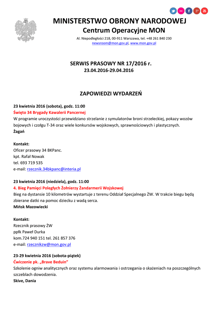 MINISTERSTWO OBRONY NARODOWEJ Centrum Operacyjne MON Al. Niepodległości 218, 00-911 Warszawa, tel. +48 261 840 230 [email protected], www.mon.gov.pl SERWIS PRASOWY NR 17/2016 r. 23.04.2016-29.04.2016 ZAPOWIEDZI WYDARZEŃ 23 kwietnia 2016 (sobota), godz. 11:00 Święto 34 Brygady Kawalerii Pancernej W programie uroczystości przewidziano strzelanie z symulatorów broni strzeleckiej, pokazy wozów bojowych i czołgu T-34 oraz wiele konkursów wojskowych, sprawnościowych i plastycznych. Żagań Kontakt: Oficer prasowy 34 BKPanc. kpt. Rafał Nowak tel. 693 719 535 e-mail: [email protected] 23 kwietnia 2016 (niedziela), godz. 11:00 4. Bieg Pamięci Poległych Żołnierzy Żandarmerii Wojskowej Bieg na dystansie 10 kilometrów wystartuje z terenu Oddział Specjalnego ŻW. W trakcie biegu będą zbierane datki na pomoc dziecku z wadą serca. Mińsk Mazowiecki Kontakt: Rzecznik prasowy ŻW ppłk Paweł Durka kom.724 940 151 tel. 261 857 376 e-mail: [email protected] 23-29 kwietnia 2016 (sobota-piątek) Ćwiczenie pk. „Brave Beduin” Szkolenie ogniw analitycznych oraz systemu alarmowania i ostrzegania o skażeniach na poszczególnych szczeblach dowodzenia. Skive, Dania Kontakt: Rzecznik prasowy 8 FOW kmdr ppor. Jacek Kwiatkowski kom. 661 417 739 e-mail: [email protected] 24 kwietnia 2016 (niedziela), godz. 15:00 Pogrzeb ppłk. Zygmunta Szendzielarza „Łupaszki Uroczystość pogrzebową rozpocznie msza żałobna w kościele parafialnym pw. św. Karola Boromeusza o godzinie 15:00. Po mszy kondukt żałobny przejdzie na Cmentarz Wojskowy na Powązkach, gdzie nastąpi dalsza część uroczystości. Proces akredytacji dla dziennikarzy zakończył się. Więcej... Warszawa (Kościół parafialny pw. św. Karola Boromeusza, ul. Powązkowska 14 Cmentarz Wojskowy na Powązkach) Kontakt: Oddział Mediów CO MON e-mail: [email protected] 25 kwietnia 2016 (poniedziałek), godz. 13:00 Odprawa kadry kierowniczej MON i Sił Zbrojnych Doroczna odprawa kierowniczej kadry MON i SZ RP, z udziałem kierownictwa resortu i najwyższych dowódców wojskowych. W pierwszej części odprawy udział weźmie Prezydent Rzeczypospolitej Polskiej, Zwierzchnik Sił Zbrojnych Andrzej Duda oraz przedstawiciele parlamentu i władz państwowych. Więcej... Warszawa (Centrum Konferencyjne WP, ul. Żwirki i Wigury 9/13) Kontakt: Oddział Mediów CO MON e-mail: [email protected] 25 kwietnia 2016 (poniedziałek) Ćwiczenie pk. RARÓG-16 Szkolenie pilotów 2 Skrzydła Lotnictwa Taktycznego. Poznań, Łask Kontakt: Oficer prasowy 2 SLT por. Grzegorz Jasianek kom. 519 038 210 e-mail: [email protected] 25-29 kwietnia 2016 (poniedziałek-piątek) Konferencja LEOBEN Konferencja Grupy Roboczej Leopard-2. Kraków Kontakt: Oficer prasowy 6 BPD kpt. Marcin Gil kom. 693 719 535 e-mail: [email protected] 25-29 kwietnia 2016 (poniedziałek-piątek) Szkolenie poligonowe Szkolenie 3 i 4 Kompanii Czołgów i 1 Batalionu Czołgów. Żagań-Karliki Kontakt: Oficer prasowy 34 BKPanc. kpt. Rafał Nowak tel. 693 719 535 e-mail: [email protected] 25-27 kwietnia 2016 (poniedziałek-środa) Szkolenie doskonalące nurków Szkolenie nurków z 1 Brzeskiego Pułku Saperów. W ćwiczeniu weźmie udział 11 nurków. Biała Góra k. Krosna Odrzańskiego Kontakt: Rzecznik prasowy 1 Psap kpt. Jacek Obierzyński kom.727 016 577 tel. 261 637 221 e-mail: [email protected] 25-29 kwietnia 2016 (poniedziałek-piątek) Ćwiczenia taktyczne RARÓG-16 Ćwiczenia taktyczne pilotów 2 Skrzydła Lotnictwa Taktycznego z wojskiem. Poznań-Krzesiny Kontakt: Oficer prasowy 2 SLT por. Grzegorz Jasianek kom. 519 038 210 e-mail: [email protected] 25-29 kwietnia 2016 (poniedziałek-piątek) Szkolenie komponentu lotniczego Szkolenie komponentu lotniczego 1 Brygady Lotnictwa Wojsk Lądowych w zwalczaniu celów powietrznych i nawodnych. W szkoleniu udział wezmą śmigłowce Mi-24, Mi-2 oraz W3PL Ustka Kontakt: mjr Krzysztof Kugiel tel. 727 012 196 e-mail: [email protected] 27 kwietnia 2016 (środa) Egzamin żołnierzy służby przygotowawczej Egzamin żołnierzy po zakończeniu szkolenia specjalistycznego Zegrze (CSŁiI, ul. Juzistek 2) Kontakt: Oficer prasowy CSŁiI kpt. Krzysztof Baran kom. 722 380 054 e-mail: [email protected] 27-28 kwietnia 2016 (środa-czwartek) Szkolenie doskonalące Szkolenie doskonalące Wojskowych Jednostek Odbudowy. W ćwiczeniu weźmie udział 100 żołnierzy z 1 Brzeskiego Pułku Saperów Prędocin k. Brzegu Kontakt: Rzecznik prasowy 1 Psap kpt. Jacek Obierzyński kom.727 016 577 tel. 261 637 221 e-mail: [email protected] 29 kwietnia 2016 (piątek) Odsłonięcie pomnika poległych Odsłonięcie pomnika poświęconego żołnierzom poległym na misjach poza granicami państwa. Toruń (CSAiU, ul. Sobieskiego 36) Kontakt: Oficer prasowy 17 WBZ por. Dorota Kusiak kom. 685 885 032 e-mail: [email protected] KRONIKA 18 kwietnia 2016 (poniedziałek) Rocznica powstania w getcie warszawskim Jest potrzeba, żeby wszystko to, co się wydarzyło w latach 1939–1945 w tym mieście, w tym kraju, na tej ziemi było pamiętane, było upamiętnione i żeby wyraźnie było rozumiane – powiedział podsekretarz stanu w MON Wojciech Fałkowski podczas obchodów rocznicowych wybuchu powstania w getcie warszawskim. Więcej... 18 kwietnia 2016 (poniedziałek) Szef MON gościł dyrektora Wywiadu Narodowego USA 13 kwietnia b.r. w Centrum Operacyjnym MON odbyło się spotkanie z przedstawicielami amerykańskich służb wywiadowczych. Więcej... 18 kwietnia 2016 (poniedziałek) Międzynarodowe warsztaty w lubelskiej brygadzie Dowódca Wielonarodowej Brygady LITPOLUKRBRIG Generał Adam Joks przywitał zespół instruktorów amerykańskich z 80 i z 92 Batalionu Civil Affairs – specjalizujący się w działaniach cywilno-wojskowych. Specjaliści z Civil Affairs Team będą prowadzić tygodniowe warsztaty skupiające się na technikach i metodach prowadzenia operacji współpracy cywilno-wojskowej (CIMIC). Więcej... 19 kwietnia 2016 (wtorek) Święto Dowództwa Dowództwo Garnizon