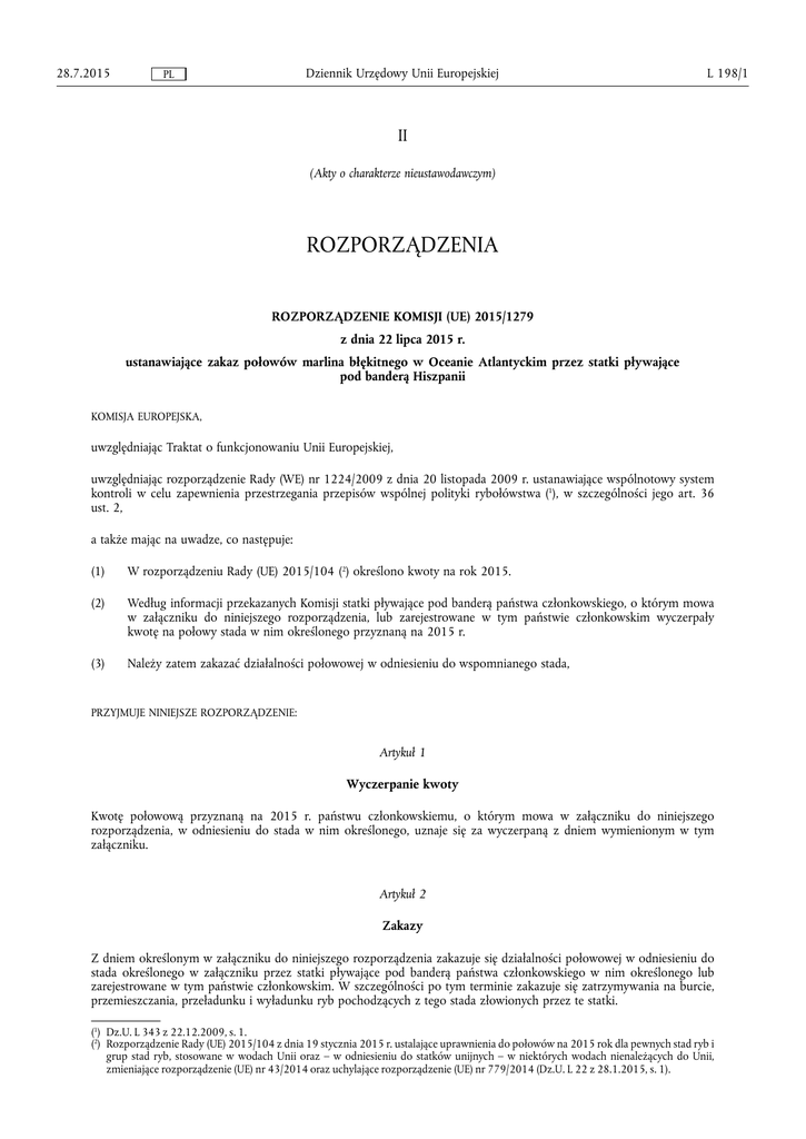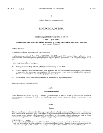 28.7.2015 Dziennik Urzędowy Unii Europejskiej PL L 198/1 II (Akty o charakterze nieustawodawczym) ROZPORZĄDZENIA ROZPORZĄDZENIE KOMISJI (UE) 2015/1279 z dnia 22 lipca 2015 r. ustanawiające zakaz połowów marlina błękitnego w Oceanie Atlantyckim przez statki pływające pod banderą Hiszpanii KOMISJA EUROPEJSKA, uwzględniając Traktat o funkcjonowaniu Unii Europejskiej, uwzględniając rozporządzenie Rady (WE) nr 1224/2009 z dnia 20 listopada 2009 r. ustanawiające wspólnotowy system kontroli w celu zapewnienia przestrzegania przepisów wspólnej polityki rybołówstwa (1), w szczególności jego art. 36 ust. 2, a także mając na uwadze, co następuje: (1) W rozporządzeniu Rady (UE) 2015/104 (2) określono kwoty na rok 2015. (2) Według informacji przekazanych Komisji statki pływające pod banderą państwa członkowskiego, o którym mowa w załączniku do niniejszego rozporządzenia, lub zarejestrowane w tym państwie członkowskim wyczerpały kwotę na połowy stada w nim określonego przyznaną na 2015 r. (3) Należy zatem zakazać działalności połowowej w odniesieniu do wspomnianego stada, PRZYJMUJE NINIEJSZE ROZPORZĄDZENIE: Artykuł 1 Wyczerpanie kwoty Kwotę połowową przyznaną na 2015 r. państwu członkowskiemu, o którym mowa w załączniku do niniejszego rozporządzenia, w odniesieniu do stada w nim określonego, uznaje się za wyczerpaną z dniem wymienionym w tym załączniku. Artykuł 2 Zakazy Z dniem określonym w załączniku do niniejszego rozporządzenia zakazuje się działalności połowowej w odniesieniu do stada określonego w załączniku przez statki pływające pod banderą państwa członkowskiego w nim określonego lub zarejestrowane w tym państwie członkowskim. W szczególności po tym terminie zakazuje się zatrzymywania na burcie, przemieszczania, przeładunku i wyładunku ryb pochodzących z tego stada złowionych przez te statki. (1) Dz.U. L 343 z 22.12.2009, s. 1. (2) Rozporządzenie Rady (UE) 2015/104 z dnia 19 stycznia 2015 r. ustalające uprawnienia do połowów na 2015 rok dla pewnych stad ryb i grup stad ryb, stosowane w wodach Unii oraz – w odniesieniu do statków unijnych – w niektórych wodach nienależących do Unii, zmieniające rozporządzenie (UE) nr 43/2014 oraz uchylające rozporządzenie (UE) nr 779/2014 (Dz.U. L 22 z 28.1.2015, s. 1). L 198/2 PL Dziennik Urzędowy Unii Europejskiej 28.7.2015 Artykuł 3 Wejście w życie Niniejsze rozporządzenie wchodzi w życie następnego dnia po jego opublikowaniu w Dzienniku Urzędowym Unii Europejskiej. Niniejsze rozporządzenie wiąże w całości i jest bezpośrednio stosowane we wszystkich państwach członkowskich. Sporządzono w Brukseli dnia 22 lipca 2015 r. W imieniu Komisji, za Przewodniczącego, Lowri EVANS Dyrektor Generalna ds. Gospodarki Morskiej i Rybołówstwa ZAŁĄCZNIK Nr 09/TQ104 Państwo członkowskie Hiszpania Stado BUM/ATLANT Gatunek Marlin błękitny (Makaira nigricans) Obszar Ocean Atlantycki Data 6.2.2015
