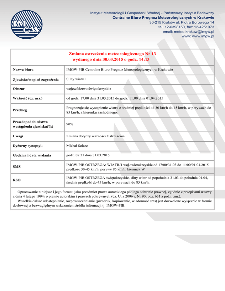 Zmiana ostrzeżenia meteorologicznego Nr 13