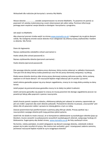 Wskazówki dla rodziców jak korzystać z serwisu My Maths Wasze dziecko ..................zostało zarejestrowane na stronie MyMaths. To powinno im pomóc w poprawić ich wiedzę matematyczną a wam obserwować jak sobie radzą. Poniższe informacje pomogą wam wspierać swoje dziecko w dostępie i korzystaniu z programu. Jak wejść na MyMaths Aby otworzyć proram trzeba wejść na stronę www.mymaths.co.uk i zalogować się na górze danymi szkoły. Na następnej stronie wasze dziecko musi zalogować się własną nazwą użytkownika i hasłem w okienku My Portal. Dane do logowania: Nazwa użytkownika szkoły(the school username) is: Hasło szkoły (the school password) is: Nazwa użytkownika dziecka (personal username) : Hasło dziecka (personal password): Dla waszego dziecka została zadana praca domowa, którą można zobaczyć w zakładce Homework. Tam jest link do lekcji którą trzeba powtórzyć oraz link do pracy domowej związanej z tą lekcją. Kiedy wasze dziecko skończy obie strony pracy domowej zostaną naliczone punkty, które zostaną zapisane w ich bazie danych. Ich nauczyciel będzie mógł zobaczyć jak im poszło i ją ocenić. Jeżeli zielona gwiazdka pojawi się przy danym zagadnieniu, znaczy to że mają dobrą wiedzę na dany temat. Jeżeli pojawi się pomarańczowa gwiazdka znaczy to że dalej ma jakieś trudności. Jeżeli czerwona gwiazdka się pojawi to znaczy że muszą powrócić do danego zagadnienia jeszcze raz powtórzyć lekcję albo poprosić o pomoc nauczyciela. Jeżeli chcecie pomóc swojemu dziecku, efektowną taktyką jest udawać że samemu zapomniało sie jak coś zrobić i poprosić aby wam dziecko pokazało. Postawienie dziecka na pozycji „nauczyciela” jest dobre dla ich pewności siebie i sprawia że mówią głośno o tym co robią. Zawsze powinniście być poinformowani o pomocy jaką oferuje szkoła. Proszę spotkać się z nauczycielem swojego dziecka jeśli mają państwo jakieś pytania. Jeżeli link nie działa to może znaczyć, że w komputerze zablokowane są wyskakujące okienka (pop up blocker), musisz zezwolić na pokazywanie wszystkich wyskakujących okienek, wyłączając funkcję ich blokowania. Sugerujemy aby dodać stronę www.mymaths.co.uk do listy zaufanych stron. Na koniec, należy pamiętać, że jeżeli zalogujecie się danymi waszego dziecka, cokolwiek zrobicie pojawi się to jako rezultat ich pracy. Nie można tam wchodzić, grać i rozwiązywać zadania samemu, ponieważ nauczyciel będzie myślał że są to osiągnięcia dziecka!