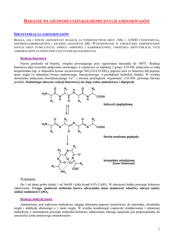 BADANIE WŁAŚCIWOŚCI FIZYKOCHEMICZNYCH AMINOKWASÓW IDENTYFIKACJA AMINOKWASÓW BIAŁKA, JAK I WOLNE AMINOKWASY REAGUJĄ ZA POŚREDNICTWEM GRUP: -NH2 I –COOH Z NINHYDRYNĄ, DINITROFLUOROBENZENEM I KWASEM AZOTOWYM (III). WYSTĘPOWANIE W STRUKTURZE AMINOKWASÓW INNYCH GRUP FUNKCYJNYCH, OPRÓCZ AMINOWEJ I KARBOKSYLOWEJ, UMOŻLIWIA IDENTYFIKACJĘ TYCH AMINOKWASÓW NA PODSTAWIE CZUŁYCH REAKCJI BARWNYCH. Reakcja biuretowa Nazwa pochodzi od biuretu, związku powstającego przy ogrzewaniu mocznika do 180OC. Reakcję biuretową dają wszystkie połączenia zawierające w cząsteczce co najmniej 2 grupy -CO-NH- połączone ze sobą bezpośrednio (np. w diamidzie kwasu szczawiowego NH2-CO-CO-NH2), poprzez azot (w biurecie) lub poprzez atom węgla (w diamidzie kwasu malonowego, bursztynowego, w produktach hydrolizy białek). W wyniku utworzenia połączenia koordynacyjnego Cu2+ z dwoma przyległymi wiązaniami –CO-NH- powstaje barwny produkt. Dodatniego odczynu reakcji biuretowej nie dają wolne aminokwasy i dipeptydy. Wykonanie: Do 1 ml danej próby dodać 1 ml NaOH i kilka kropli 0,5% CuSO4 W obecności białka powstaje fioletowe zabarwienie. Uwaga: ponieważ niebieska barwa odczynnika może maskować właściwy odczyn należy unikać nadmiaru CuSO4. Reakcja ninhydrynowa Aminokwasy pod wpływem ninhydryny ulegają utlenieniu poprzez iminokwasy do amoniaku, dwutlenku węgla i aldehydu uboższego o 1 atom węgla. W wyniku kondensacji cząsteczki zredukowanej i utlenionej ninhydryny z amoniakiem powstaje niebiesko-fioletowe zabarwienie, którego natężenie jest proporcjonalne do zawartości azotu aminowego aminokwasów. 1 O H R C O C COOH + C OH C OH C NH2 R CH + CO2 + H2O + H C C NH O OH O ninhydryna zredukowana ninhydryna H R CH + H2O R O OH C C H + + NH3 O NH C C 2NH3 OH O + C HO O O O C C C C N C C C C O O O barwny kompleks + 3H2O + NH4 Wykonanie: Do 1 ml próby badanej dodać 3-4 krople 0,1% roztworu ninhydryny w 50% etanolu. Po wymieszaniu próbę ogrzać do wrzenia. Wszystkie aminokwasy (oprócz proliny) reagują z ninhydryną tworząc niebieskie zabarwienie. Reakcja ksantoproteinowa Aminokwasy aromatyczne oraz fenole ulegają reakcji nitrowania w czasie ogrzewania ze stężonym HNO 3, dając żółto zabarwione pochodne nitrowe (fenyloalanina wymaga do nitrowania dodatku H2SO4). COOH H2C COOH NH3 H2C 2H2O NH3 + 2HNO3 O2N OH OH Wykonanie: Do 1 ml próby badanej dodać 0,5 ml stężonego HNO3 i ogrzewać na wrzącej łaźni wodnej przez 2 min. Wytrąca się żółty osad. Reakcja Adamkiewicza Jest to reakcja charakterystyczna dla tryptofanu zawierającego pierścień indolowy. W obecności kwasu siarkowego i formaldehydu (kwas glioksalowy) dwie grupy indolowe ulegają kondensacji z wydzieleniem cząsteczki wody i dają barwny fioletowy związek. Schemat przebiegu reakcji: 2 Wykonanie: Do 1 ml próby badanej dodać kilka kropli formaldehydu. Po wymieszaniu roztwór podwarstwić (po ściance) stężonym H2SO4. Na granicy cieczy powstaje fioletowy pierścień. Reakcja Millona Reakcja na wykrywanie tyrozyny jest mało specyficzna, ponieważ dodatni wynik dają również związki zawierające reszty fenolowe. Wykonanie: Do 1 ml próby badanej dodać kilka kropli odczynnika Millona. Mieszaninę ogrzewać w łaźni wodnej przez kilka minut. W przypadku obecności tyrozyny pojawia się biały osad, który zabarwia się na żółto, a później na czerwono (lub powstaje czerwone zabarwienie roztworu). Wykrywanie cysteiny i cystyny Zawarta w cysteinie i cystynie siarka w silnie zasadowym środowisku ulega uwolnieniu w postaci jonów siarczkowych, które z jonami Pb2+ dają czarny osad PbS. Metionina nie daje dodatniego wyniku w tej reakcji. Schemat przebiegu reakcji: COOH HC NH2 H2C SH CH3 + 2OH C O + S 2 + NH3 + H2O COOH 2 Pb + S 2 PbS Wykonanie: Do 1 ml próby badanej dodać 1 ml roztworu octanu ołowiu i 3 ml 10% roztworu NaOH (roztwór powinien być klarowny). Próbkę ogrzewać na łaźni wodnej, po kilku minutach pojawia się czarny osad. 3 Wykrywanie glutaminy Próba na obecność glutaminy wykorzystuje obecność w jej cząsteczce ugrupowania amidowego, z którego w warunkach hydrolizy zasadowej uwalnia się gazowy amoniak. Dodatni wynik tej reakcji dają też asparagina i sole amonowe. Wykonanie: Do 3 ml próby badanej dodać 3 ml 10% NaOH (roztwór dodać do probówki pipetą, tak aby nie dotknąć jej wylotu). Całość umieścić we wrzącej łaźni wodnej a do wylotu probówki zbliżyć zwilżony uniwersalny papierek lakmusowy. W przypadku obecności glutaminy papierek zmienia zabarwienie na niebieski Uwaga: należy uważać, aby nie dotknąć papierkiem brzegu probówki. wówczas zmiana zabarwienia papierka następuje na skutek obecności NaOH a nie amoniaku. 4