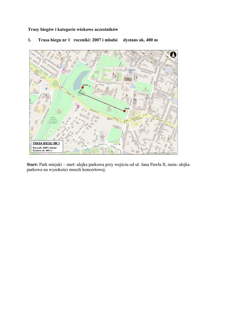 Trasy biegów i kategorie wiekowe uczestników 1. Trasa biegu nr 1 roczniki: 2007 i młodsi dystans ok. 400 m Start: Park miejski – start: alejka parkowa przy wejściu od ul. Jana Pawła II, meta: alejka parkowa na wysokości muszli koncertowej. 2. Trasa biegu nr 2 roczniki 2006-2001 dystans ok. 1400 m Start: Park miejski im. Stanisława Staszica alejka parkowa (na wysokości muszli koncertowej) – skręt w lewo – bieg alejką parkową w stronę ul. Jana Pawła II – skręt w prawo, bieg alejka parkową do chodnika przy ul. Ogrodowej – na wysokości przejścia dla pieszych skręt w prawo i bieg ścieżką rowerową do ul. Solnej – ul. Solna – skręt w prawo w ul. Staszica – ul. Staszica meta alejka parkowa na wysokości muszli koncertowej. 3. Trasa biegu nr 3 roczniki: 2000-1998 dystans ok. 2000 m Start: Park miejski im. Stanisława Staszica alejka parkowa (na wysokości muszli koncertowej) – bieg alejką parkową w stronę ul. Jana Pawła II – skręt w prawo, bieg alejka parkową do chodnika przy ul. Ogrodowej – na wysokości przejścia dla pieszych – skręt w prawo i bieg ścieżką rowerową do ul. Solnej – przecięcie ul. Solnej, bieg wzdłuż Silnicy ścieżką rowerową do ul. Sienkiewicza – skręt w prawo w ul. Sienkiewicza – bieg ul. Sienkiewicza – skręt w prawo w ul. Staszica – bieg ul. Staszica – meta na alejce parkowej na wysokości muszli koncertowej. 4. Trasa biegu OPEN (osoby pełnoletnie i starsze) dystans ok 4300 m Start: Park miejski im. Stanisława Staszica alejka parkowa (na wysokości muszli koncertowej) – bieg alejką parkową w stronę ul. Jana Pawła II – skręt w prawo bieg alejka parkową do chodnika przy ul. Ogrodowej na wysokości przejścia dla pieszych – skręt |w prawo i bieg ścieżką rowerową do ul. Solnej – ul. Solna – skręt w prawo w ul. Staszica – ul. Staszica- skręt w lewo ul. Zamkowa – ul. Zamkowa – skręt w lewo w bramę placu zamkowego Muzeum Narodowego – teren Muzeum Narodowego – bieg ulicą obok budynku Caritasu – skręt w prawo w ul. Czerwonego Krzyża – ul. Czerwonego Krzyża – skręt w prawo w ul. Wesoła – ul. Wesoła – skręt w lewo w ul. Mickiewicza – ul. Mickiewicza – skręt w lewo w ul. Hipoteczna – skręt w prawo ul. Przy Muzeum Zabawek – skręt w lewo w ul. Ewangelicka – skręt w lewo w ul. Sienkiewicza – ul. Sienkiewicza – – skręt w prawo w ul. Duża – ul. Duża – skręt w lewo płyta Rynku – bieg do ul. Leśnej – ul. Leśna – skręt w prawo w ul. Sienkiewicza – ul. Sienkiewicza – skręt w lewo w ul. Paderewskiego – ul. Paderewskiego – skręt w lewo w ul. Solna – ul. Solna – skręt w prawo do ul. Staszica – ul. Staszica, – meta alejka parkowa przy muszli koncertowej.