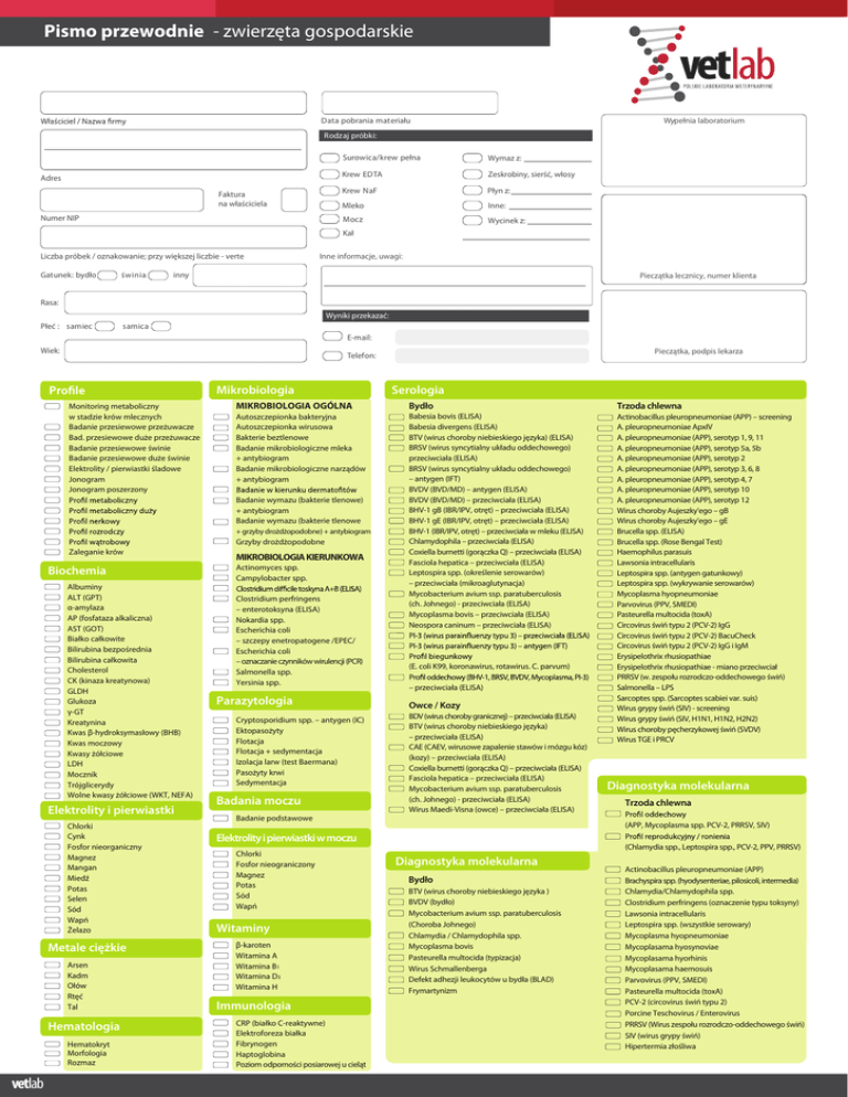 Pismo przewodnie - zwierzęta gospodarskie Wypełnia laboratorium Data pobrania materiału Rodzaj próbki: Surowica/krew pełna Adres Faktura na właściciela Numer NIP Wymaz z: Krew EDTA Zeskrobiny, sierść, włosy Krew NaF Płyn z: Mleko Inne: Mocz Wycinek z: Kał Liczba próbek / oznakowanie; przy większej liczbie - verte Gatunek: bydło świnia Inne informacje, uwagi: inny Pieczątka lecznicy, numer klienta Rasa: Wyniki przekazać: Płeć : samiec samica E-mail: Wiek: Mikrobiologia Monitoring metaboliczny w stadzie krów mlecznych Badanie przesiewowe przeżuwacze Bad. przesiewowe duże przeżuwacze Badanie przesiewowe świnie Badanie przesiewowe duże świnie Elektrolity / pierwiastki śladowe Jonogram Jonogram poszerzony Bydło Trzoda chlewna Autoszczepionka bakteryjna Autoszczepionka wirusowa Bakterie beztlenowe Badanie mikrobiologiczne mleka + antybiogram Badanie mikrobiologiczne narządów + antybiogram Babesia bovis (ELISA) Babesia divergens (ELISA) BTV (wirus choroby niebieskiego języka) (ELISA) BRSV (wirus syncytialny układu oddechowego) przeciwciała (ELISA) BRSV (wirus syncytialny układu oddechowego) – antygen (IFT) BVDV (BVD/MD) – antygen (ELISA) BVDV (BVD/MD) – przeciwciała (ELISA) BHV-1 gB (IBR/IPV, otręt) – przeciwciała (ELISA) BHV-1 gE (IBR/IPV, otręt) – przeciwciała (ELISA) BHV-1 (IBR/IPV, otręt) – przeciwciała w mleku (ELISA) Chlamydophila – przeciwciała (ELISA) Coxiella burnetti (gorączka Q) – przeciwciała (ELISA) Fasciola hepatica – przeciwciała (ELISA) Leptospira spp. (określenie serowarów) – przeciwciała (mikroaglutynacja) Mycobacterium avium ssp. paratuberculosis (ch. Johnego) - przeciwciała (ELISA) Mycoplasma bovis – przeciwciała (ELISA) Neospora caninum – przeciwciała (ELISA) Actinobacillus pleuropneumoniae (APP) – screening A. pleuropneumoniae ApxIV A. pleuropneumoniae (APP), serotyp 1, 9, 11 A. pleuropneumoniae (APP), serotyp 5a, 5b A. pleuropneumoniae (APP), serotyp 2 A. pleuropneumoniae (APP), serotyp 3, 6, 8 A. pleuropneumoniae (APP), serotyp 4, 7 A. pleuropneumoniae (APP), serotyp 10 A. pleuropneumoniae (APP), serotyp 12 Wirus choroby Aujeszky’ego – gB Wirus choroby Aujeszky’ego – gE Brucella spp. (ELISA) Brucella spp. (Rose Bengal Test) Haemophilus parasuis Lawsonia intracellularis Leptospira spp. (antygen gatunkowy) Leptospira spp. (wykrywanie serowarów) Mycoplasma hyopneumoniae Parvovirus (PPV, SMEDI) Pasteurella multocida (toxA) Circovirus świń typu 2 (PCV-2) IgG Circovirus świń typu 2 (PCV-2) BacuCheck Circovirus świń typu 2 (PCV-2) IgG i IgM Erysipelothrix rhusiopathiae Erysipelothrix rhusiopathiae - miano przeciwciał PRRSV (w. zespołu rozrodczo-oddechowego świń) Salmonella – LPS Sarcoptes spp. (Sarcoptes scabiei var. suis) Wirus grypy świń (SIV) - screening Wirus grypy świń (SIV, H1N1, H1N2, H2N2) Wirus choroby pęcherzykowej świń (SVDV) Wirus TGE i PRCV + grzyby drożdżopodobne) + antybiogram Grzyby drożdżopodobne Zaleganie krów Biochemia Albuminy ALT (GPT) α-amylaza AP (fosfataza alkaliczna) AST (GOT) Białko całkowite Bilirubina bezpośrednia Bilirubina całkowita Cholesterol CK (kinaza kreatynowa) GLDH Glukoza γ-GT Kreatynina Kwas β-hydroksymasłowy (BHB) Kwas moczowy Kwasy żółciowe LDH Mocznik Trójglicerydy Wolne kwasy żółciowe (WKT, NEFA) Elektrolity i pierwiastki Chlorki Cynk Fosfor nieorganiczny Magnez Mangan Miedź Potas Selen Sód Wapń Żelazo Metale ciężkie Arsen Kadm Ołów Rtęć Tal Hematologia Hematokryt Morfologia Rozmaz Serologia MIKROBIOLOGIA OGÓLNA Badanie wymazu (bakterie tlenowe) + antybiogram Badanie wymazu (bakterie tlenowe vetlab Pieczątka, podpis lekarza Telefon: MIKROBIOLOGIA KIERUNKOWA Actinomyces spp. Campylobacter spp. Clostridium perfringens – enterotoksyna (ELISA) Nokardia spp. Escherichia coli – szczepy enetropatogene /EPEC/ Escherichia coli – oznaczanie czynników wirulencji (PCR) Salmonella spp. Yersinia spp. Parazytologia Cryptosporidium spp. – antygen (IC) Ektopasożyty Flotacja Flotacja + sedymentacja Izolacja larw (test Baermana) Pasożyty krwi Sedymentacja Badania moczu Badanie podstawowe (E. coli K99, koronawirus, rotawirus. C. parvum) – przeciwciała (ELISA) Owce / Kozy BDV (wirus choroby granicznej) – przeciwciała (ELISA) BTV (wirus choroby niebieskiego języka) – przeciwciała (ELISA) CAE (CAEV, wirusowe zapalenie stawów i mózgu kóz) (kozy) – przeciwciała (ELISA) Coxiella burnetti (gorączka Q) – przeciwciała (ELISA) Fasciola hepatica – przeciwciała (ELISA) Mycobacterium avium ssp. paratuberculosis (ch. Johnego) - przeciwciała (ELISA) Wirus Maedi-Visna (owce) – przeciwciała (ELISA) Witaminy β-karoten Witamina A Witamina B1 Witamina D3 Witamina H Immunologia CRP (białko C-reaktywne) Elektroforeza białka Fibrynogen Haptoglobina Poziom odporności posiarowej u cieląt Trzoda chlewna (APP, Mycoplasma spp. PCV-2, PRRSV, SIV) Elektrolity i pierwiastki w moczu Chlorki Fosfor nieograniczony Magnez Potas Sód Wapń Diagnostyka molekularna (Chlamydia spp., Leptospira spp., PCV-2, PPV, PRRSV) Diagnostyka molekularna Bydło BTV (wirus choroby niebieskiego języka ) BVDV (bydło) Mycobacterium avium ssp. paratuberculosis (Choroba Johnego) Chlamydia / Chlamydophila spp. Mycoplasma bovis Pasteurella multocida (typizacja) Wirus Schmallenberga Defekt adhezji leukocytów u bydła (BLAD) Frymartynizm Actinobacillus pleuropneumoniae (APP) Brachyspira spp. (hyodysenteriae, pilosicoli, intermedia) Chlamydia/Chlamydophila spp. Clostridium perfringens (oznaczenie typu toksyny) Lawsonia intracellularis Leptospira spp. (wszystkie serowary) Mycoplasma hyopneumoniae Mycoplasama hyosynoviae Mycoplasama hyorhinis Mycoplasama haemosuis Parvovirus (PPV, SMEDI) Pasteurella multocida (toxA) PCV-2 (circovirus świń typu 2) Porcine Teschovirus / Enterovirus PRRSV (Wirus zespołu rozrodczo-oddechowego świń) SIV (wirus grypy świń) Hipertermia złośliwa Histopatologia Badanie cytologiczne Wrocław Badanie cytolo