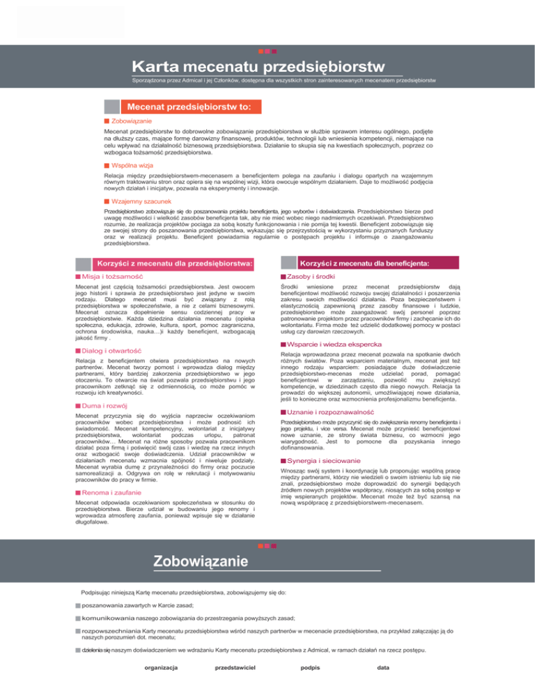 Karta mecenatu przedsiębiorstw Sporządzona przez Admical i jej Członków, dostępna dla wszystkich stron zainteresowanych mecenatem przedsiębiorstw Mecenat przedsiębiorstw to: Zobowiązanie Mecenat przedsiębiorstw to dobrowolne zobowiązanie przedsiębiorstwa w służbie sprawom interesu ogólnego, podjęte na dłuższy czas, mające formę darowizny finansowej, produktów, technologii lub wniesienia kompetencji, niemające na celu wpływać na działalność biznesową przedsiębiorstwa. Działanie to skupia się na kwestiach społecznych, poprzez co wzbogaca tożsamość przedsiębiorstwa. Wspólna wizja Relacja między przedsiębiorstwem-mecenasem a beneficjentem polega na zaufaniu i dialogu opartych na wzajemnym równym traktowaniu stron oraz opiera się na wspólnej wizji, która owocuje wspólnym działaniem. Daje to możliwość podjęcia nowych działań i inicjatyw, pozwala na eksperymenty i innowacje. Wzajemny szacunek Przedsiębiorstwo zobowiązuje się do poszanowania projektu beneficjenta, jego wyborów i doświadczenia. Przedsiębiorstwo bierze pod uwagę możliwości i wielkość zasobów beneficjenta tak, aby nie mieć wobec niego nadmiernych oczekiwań. Przedsiębiorstwo rozumie, że realizacja projektów pociąga za sobą koszty funkcjonowania i nie pomija tej kwestii. Beneficjent zobowiązuje się ze swojej strony do poszanowania przedsiębiorstwa, wykazując się przejrzystością w wykorzystaniu przyznanych funduszy oraz w realizacji projektu. Beneficjent powiadamia regularnie o postępach projektu i informuje o zaangażowaniu przedsiębiorstwa. Korzyści z mecenatu dla przedsiębiorstwa: Korzyści z mecenatu dla beneficjenta: Misja i tożsamość Zasoby i środki Mecenat jest częścią tożsamości przedsiębiorstwa. Jest owocem jego historii i sprawia że przedsiębiorstwo jest jedyne w swoim rodzaju. Dlatego mecenat musi być związany z rolą przedsiębiorstwa w społeczeństwie, a nie z celami biznesowymi. Mecenat oznacza dopełnienie sensu codziennej pracy w przedsiębiorstwie. Każda dziedzina działania mecenatu (opieka społeczna, edukacja, zdrowie, kultura, sport, pomoc zagraniczna, ochrona środowiska, nauka…)i każdy beneficjent, wzbogacają jakość firmy . Środki wniesione przez mecenat przedsiębiorstw dają beneficjentowi możliwość rozwoju swojej działalności i poszerzenia zakresu swoich możliwości działania. Poza bezpieczeństwem i elastycznością zapewnioną przez zasoby finansowe i ludzkie, przedsiębiorstwo może zaangażować swój personel poprzez patronowanie projektom przez pracowników firmy i zachęcanie ich do wolontariatu. Firma może też udzielić dodatkowej pomocy w postaci usług czy darowizn rzeczowych. Wsparcie i wiedza ekspercka Dialog i otwartość Relacja z beneficjentem otwiera przedsiębiorstwo na nowych partnerów. Mecenat tworzy pomost i wprowadza dialog między partnerami, który bardziej zakorzenia przedsiębiorstwo w jego otoczeniu. To otwarcie na świat pozwala przedsiębiorstwu i jego pracownikom zetknąć się z odmiennością, co może pomóc w rozwoju ich kreatywności. Relacja wprowadzona przez mecenat pozwala na spotkanie dwóch różnych światów. Poza wsparciem materialnym, mecenat jest też innego rodzaju wsparciem: posiadające duże doświadczenie przedsiębiorstwo-mecenas może udzielać porad, pomagać beneficjentowi w zarządzaniu, pozwolić mu zwiększyć kompetencje, w dziedzinach często dla niego nowych. Relacja ta prowadzi do większej autonomii, umożliwiającej nowe działania, jeśli to konieczne oraz wzmocnienia profesjonalizmu beneficjenta. Duma i rozwój Mecenat przyczynia się do wyjścia naprzeciw oczekiwaniom pracowników wobec przedsiębiorstwa i może podnosić ich świadomość. Mecenat kompetencyjny, wolontariat z inicjatywy przedsiębiorstwa, wolontariat podczas urlopu, patronat pracowników… Mecenat na różne sposoby pozwala pracownikom działać poza firmą i poświęcić swój czas i wiedzę na rzecz innych oraz wzbogacić swoje doświadczenia. Udział pracowników w działaniach mecenatu wzmacnia spójność i niweluje podziały. Mecenat wyrabia dumę z przynależności do firmy oraz poczucie samorealizacji a. Odgrywa on rolę w rekrutacji i motywowaniu pracowników do pracy w firmie. Renoma i zaufanie Mecenat odpowiada oczekiwaniom społeczeństwa w stosunku do przedsiębiorstwa. Bierze udział w budowaniu jego renomy i wprowadza atmosferę zaufania, ponieważ wpisuje się w działanie długofalowe. Uznanie i rozpoznawalność Przedsiębiorstwo może przyczynić się do zwiększenia renomy beneficjenta i jego projektu, i vice versa. Mecenat może przynieść beneficjentowi nowe uznanie, ze strony świata biznesu, co wzmocni jego wiarygodność. Jest to pomocne dla pozyskania innego dofinansowania. Synergia i sieciowanie Wnosząc swój system i koordynację lub proponując wspólną pracę między partnerami, którzy nie wiedzieli o swoim istnieniu lub się nie znali, przedsiębiorstwo może doprowadzić do synergii będących źródłem nowych projektów współpracy, niosących za sobą postęp w imię wspieranych projektów. Mecenat może też być szansą na nową współpracę z przedsiębiorstwem-mecenasem. Zobowiązanie Podpisując niniejszą Kartę mecenatu przedsiębiorstwa, zobowiązujemy się do: poszanowania zawartych w Karcie zasad; komunikowania naszego zobowiązania do przestrzegania powyższych zasad; rozpowszechniania Karty mecenatu przedsiębiorstwa wśród naszych partnerów w mecenacie przedsiębiorstwa, na przykład załączając ją do naszych porozumień dot. mecenatu; dzielenia się naszym doświadczeniem we wdrażaniu Karty mecenatu przedsiębiorstwa z Admical, w ramach działań na rzecz postępu. organizacja przedstawiciel podpis data