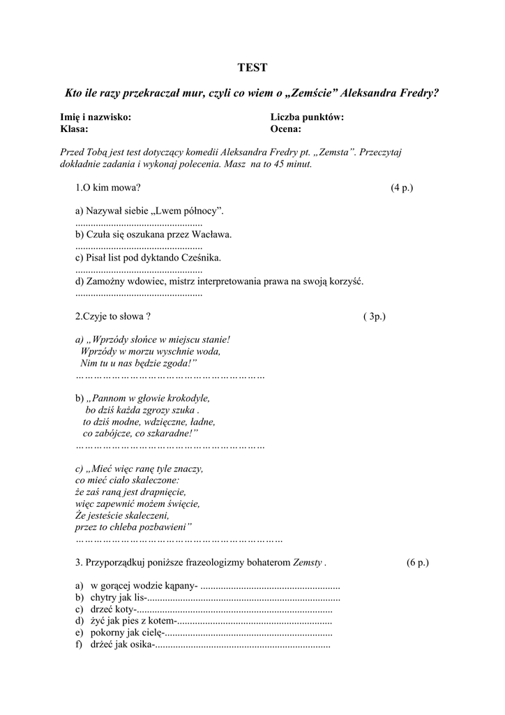 TEST Kto ile razy przekraczał mur, czyli co wiem o „Zemście” Aleksandra Fredry? Imię i nazwisko: Klasa: Liczba punktów: Ocena: Przed Tobą jest test dotyczący komedii Aleksandra Fredry pt. „Zemsta”. Przeczytaj dokładnie zadania i wykonaj polecenia. Masz na to 45 minut. 1.O kim mowa? (4 p.) a) Nazywał siebie „Lwem północy”. .................................................. b) Czuła się oszukana przez Wacława. .................................................. c) Pisał list pod dyktando Cześnika. .................................................. d) Zamożny wdowiec, mistrz interpretowania prawa na swoją korzyść. .................................................. 2.Czyje to słowa ? ( 3p.) a) „Wprzódy słońce w miejscu stanie! Wprzódy w morzu wyschnie woda, Nim tu u nas będzie zgoda!” ……………………………………………………… b) „Pannom w głowie krokodyle, bo dziś każda zgrozy szuka . to dziś modne, wdzięczne, ładne, co zabójcze, co szkaradne!” ……………………………………………………… c) „Mieć więc ranę tyle znaczy, co mieć ciało skaleczone: że zaś raną jest drapnięcie, więc zapewnić możem święcie, Że jesteście skaleczeni, przez to chleba pozbawieni” …………………………………………………………… 3. Przyporządkuj poniższe frazeologizmy bohaterom Zemsty . a) b) c) d) e) f) w gorącej wodzie kąpany- ....................................................... chytry jak lis-............................................................................ drzeć koty-............................................................................. żyć jak pies z kotem-............................................................. pokorny jak cielę-.................................................................. drżeć jak osika-..................................................................... (6 p.) 4. Dopisz po 3 wyrazy bliskoznaczne do podanych wyrazów: (4 p.) a) kłótnia-......................................................................................... b) zgoda -..................................................................................... c) zemsta-........................................................................................... d) kobieta-........................................................................................ 5. Odmień przez przypadki wyrażenie : hrabia Fredro (7 p.) M.................................... D..................................... C..................................... B..................................... N..................................... Ms.................................. W.................................... 6. Uzupełnij tekst: (7 p.) Jednym z trzech rodzajów literackich, oprócz liryki i epiki, jest ………………………... W dramacie, w odróżnieniu od epiki, nie ma ........................................., a bohater wypowiada się bezpośrednio w ………………………. i …………………………………….. O wyglądzie postaci, miejsc i okolicznościach, w których wypowiadany jest tekst dowiadujemy się z tekstu pobocznego, zwanego ……………………… . Dramat zbudowany jest z ……………………. i ………………………………. 7. Napisz zaproszenie na ślub Wacława i Klary. (5 p.) ....................................................................................................................................................... ....................................................................................................................................................... ....................................................................................................................................................... ....................................................................................................................................................... ....................................................................................................................................................... ....................................................................................................................................................... ....................................................................................................................................................... ....................................................................................................................................................... SCHEMAT ODPOWIEDZI: 1. a-Papkin, b- Postolina, c- Dyndalski, d- Rejent 2. a-Cześnik, b- Papkin c-Rejent 3. a-Papkin, Cześnik; b- Rejent; c-Rejent z Cześnikiem; d-Rejent z Cześnikiem; e- Wacław, Klara; f- Papkin. 4. a- sprzeczka, zwada, zatarg; b- pojednanie, pokój, spokój; c- odwet, porachunki, represja; d- niewiasta, pani, dama. 5. M. hrabia Fredro D. hrabiego (hrabi)Fredry C. hrabiemu (hrabi) Fredrze B. hrabiego (hrabię) Fredrę N. hrabią Fredrą Ms. hrabi (hrabim) Fredrze W. hrabio Fredro 6. dramat; narratora; dialogach i monologach; didaskalia; aktów i scen. 7. Kryteria oceny zaproszenia: Kryteria Zasady przyznawania punktów Punktacja Realizacja tematu • 0-1 Kompozycja Język i styl Ortografia i interpunkcja Razem Wskazuje adresata (nawet ogólnie), nadawcę, jednoznacznie określa miejsce, czas oraz cel; • Dostosowuje wypowiedź do sytuacji komunikacyjnej; Zachowuje spójność wypowiedzi; Przestrzega poprawności językowej i stylistycznej ( dopuszczalny 1 błąd) Przestrzega poprawności ortograficznej i interpunkcyjnej ( dopuszczalny 1 błąd ortograficzny i 1 błąd interpunkcyjny) 0-1 0-1 0-1 0-1 0-5