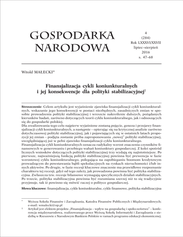 Witold Małecki, Finansjalizacja cykli koniunkturalnych i jej konsekwencje dla polityki... Gospodarka narodowa 47 4 (284) Rok LXXXVI/XXVII lipiec–sierpień 2016 s. 47–68 Witold MAŁECKI* Finansjalizacja cykli koniunkturalnych i jej konsekwencje dla polityki stabilizacyjnej1 Streszczenie: Celem artykułu jest wyjaśnienie zjawiska finansjalizacji cykli koniunkturalnych, wskazanie jego konsekwencji w postaci niezbędnych, zasadniczych zmian w sposobie prowadzenia polityki stabilizacyjnej i wreszcie nakreślenie dalszych, pożądanych kierunków badań, zarówno dotyczących teorii cyklu koniunkturalnego, jak i odnoszących się do gospodarki polskiej. Dla zrealizowania tego celu najpierw wyjaśnione zostaną pojęcie, geneza i przejawy finansjalizacji cykli koniunkturalnych, a następnie – opierając się na krytycznej analizie zarówno dotychczasowej polityki stabilizacyjnej, jak i pojawiających się w ostatnich latach propozycji jej zmian – podjęta zostanie próba zaproponowania „nowej” polityki stabilizacyjnej, uwzględniającej już w pełni zjawisko finansjalizacji cyklu koniunkturalnego. Finansjalizacja cykli koniunkturalnych oznacza radykalny wzrost znaczenia czynników finansowych w generowaniu i przebiegu wahań koniunktury gospodarczej. Z kolei spośród licznych wniosków dotyczących polityki stabilizacyjnej trzy wydają się najistotniejsze. Po pierwsze, najważniejszą funkcją polityki stabilizacyjnej powinna być prewencja w fazie wzrostowej cyklu koniunkturalnego, polegająca na zapobieganiu boomom kredytowym prowadzącym do powstawania bąbli spekulacyjnych na rynkach nieruchomości i/lub innych aktywów. Po drugie, w fazie recesji kluczowe znaczenie ma prawidłowe rozpoznanie charakteru tej recesji, gdyż od tego zależy, jak prowadzona powinna być polityka stabilizacyjna. Zwłaszcza tzw. recesje bilansowe wymagają specyficznych działań stabilizacyjnych. Po trzecie, polityka stabilizacyjna powinna być rozumiana szerzej niż to się tradycyjnie przyjmuje, tak iż powinno się mówić raczej o polityce gospodarczej. Słowa kluczowe: finansjalizacja, cykle koniunkturalne, cykle finansowe, polityka stabilizacyjna * 1 Wyższa Szkoła Finansów i Zarządzania, Katedra Finansów Publicznych i Międzynarodowych; e-mail: [email protected] Artykuł jest efektem projektu „Finansjalizacja – wpływ na gospodarkę i społeczeństwo” – konferencja międzynarodowa, realizowanego przez Wyższą Szkołę Informatyki i Zarządzania z siedzibą w Rzeszowie z Narodowym Bankiem Polskim w ramach programu edukacji ekonomicznej. 48 GOSPODARKA NARODOWA nr 4/2016 Kody klasyfikacji JEL: E32, E52, E58, E61, E62, E64, H30 Artykuł nadesłany 1 marca 2016 r., zaakceptowany 6 lipca 2016 r. Wstęp Tematem artykułu jest stosunkowo nowe i jeszcze nie w pełni rozpoznane zjawisko, jakim jest finansjalizacja cykli koniunkturalnych. Terminem tym określa się radykalny wzrost znaczenia czynników finansowych w generowaniu i przebiegu wahań koniunktury. Coraz powszechniejszy staje się pogląd, iż nie sposób jest już zrozumieć współczesnych cykli koniunkturalnych bez zrozumienia cykli finansowych i bez uznania finansowej natury współczesnej gospodarki. System finansowy już nie tylko pośredniczy, ale żyje własnym życiem i sam może generować rozmaite szoki. Oprócz Wstępu artykuł składa się z trzech części i Posumowania. W części pierwszej przedstawione zostały pojęcie, geneza i przejawy finansjalizacji cykli koniunkturalnych. Do najistotniejszych z tych przejawów należą nasilające się interakcje miedzy cyklami finansowymi i cyklami koniunkturalnymi oraz zjawiska określane jako recesje bilansowe (balance-sheet recessions) i finansowe cykle koniunkturalne (financial business cycles). Część druga poświęcona jest konsekwencjom finansjalizacji cykli koniunkturalnych dla polityki stabilizacyjnej. Najpierw wyjaśnione zostało, dlaczego dotychczasowa polityka stabilizowania koniunktury, zarówno ta prowadzona przed współczesnym globalnym kryzysem finansowo-gospodarczym, jak i ta podejmowana już w jego trakcie, okazały się całkowicie zawodne. Następnie zaprezentowane zostały spotykane w najnowszej literaturze propozycje zmian w sposobie prowadzenia polityki stabilizacyjnej, uwzględniające już zjawisko finansjalizacji cykli koniunkturalnych. Krytyczna analiza tych propozycji pozwoliła na sformułowanie wstępnych wniosków odnośnie do właściwego kształtu „nowej” polityki stabilizacyjnej w warunkach strukturalnych zmian współczesnego cyklu koniunkturalnego. W części trzeciej nakreślone zostały pożądane kierunki dalszych badań tej problematyki. Niezbędne jest zarówno kontynuowanie badań empirycznych, jak i podjęcie prac nad zbudowaniem spójnej teorii cyklu koniunkturalnego, adekwatnej do zmian strukturalnych, jakie zaszły we współczesnej gospodarce. Ponadto dotychczasowe badania empiryczne, a także propozycje modyfikacji polityki antycyklicznej odnosiły się prawie wyłącznie do gospodarek najwyżej rozwiniętych. Tymczasem gospodarka polska charakteryzuje się wyraźną specyfiką, zarówno jeśli chodzi o przebieg wahań koniunkturalnych, jak i stopień finansjalizacji. Dlatego też potrzebne są badania empiryczne cykli finansowych i ich interakcji z cyklami koniunkturalnymi, aby zweryfikować w naszych realiach przydatność rekomendacji formułowanych dla gospodarek wysoko rozwiniętych. Najważniejsze wnioski zostały ujęte w Podsumowaniu. Witold Małecki, Finansjalizacja cykli koniunkturalnych i jej konsekwencje dla polityki... 49 Finansjalizacja cykli koniunkturalnych Pojęcie i geneza Przez finansjalizację cyklu koniunkturalnego rozumie się, przez analogię do ogólnej definicji finansjalizcji, radykalny wzrost znaczenia czynników finansowych w generowaniu i przebiegu wahań koniunktury. Doprowadziły do tego głębokie przemiany strukturalne, jakie dokonały się w ciągu ostatnich 30–40 lat w gospodar