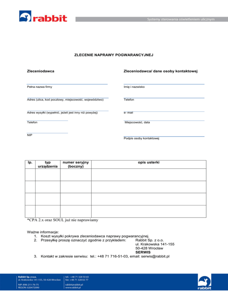 ZLECENIE NAPRAWY POGWARANCYJNEJ Zleceniodawca Zleceniodawca/ dane osoby kontaktowej Pełna nazwa firmy Imię i nazwisko Adres (ulica, kod pocztowy, miejscowość, województwo) Telefon Adres wysyłki (wypełnić, jeżeli jest inny niż powyżej) e- mail Telefon Miejscowość, data NIP Podpis osoby kontaktowej lp. typ urządzenia numer seryjny (boczny) opis usterki *CPA 2.x oraz SOUL już nie naprawiamy Ważne informacje: 1. Koszt wysyłki pokrywa zleceniodawca naprawy pogwarancyjnej. 2. Przesyłkę proszę oznaczyć zgodnie z przykładem: Rabbit Sp. z o.o. ul. Krakowska 141-155 50-428 Wrocław SERWIS 3. Kontakt w zakresie serwisu: tel.: +48 71 716-51-03, email: [email protected]