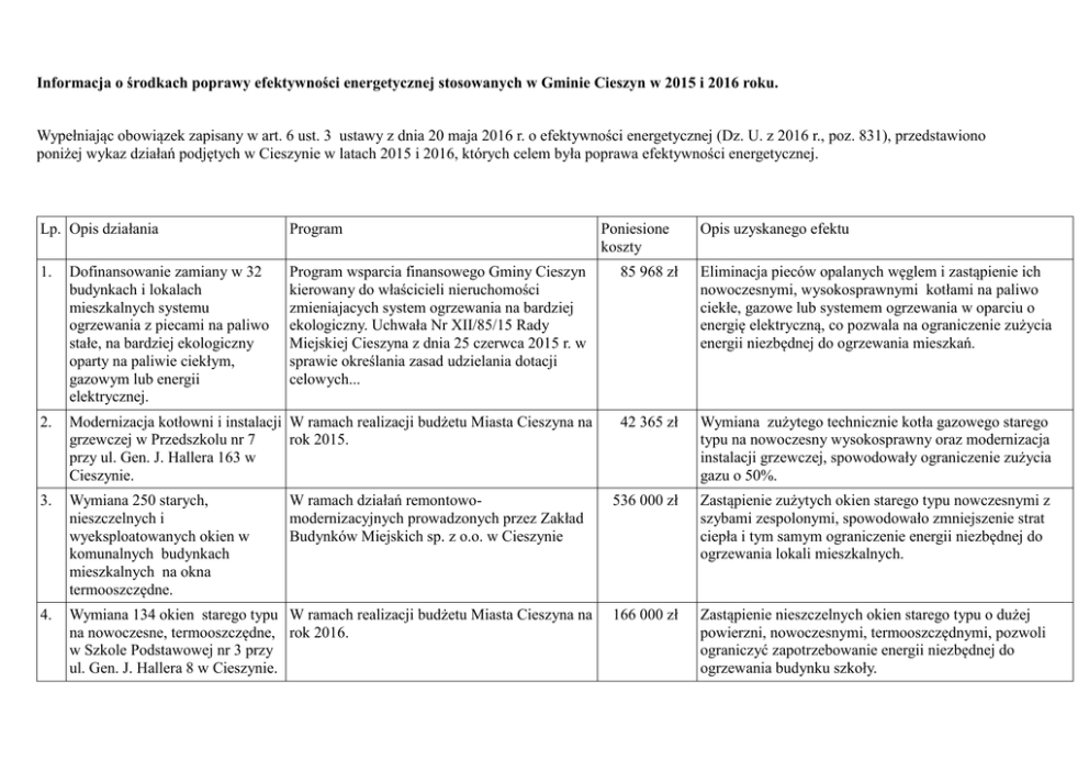 Informacja o środkach poprawy efektywności energetycznej stosowanych w Gminie Cieszyn w 2015 i 2016 roku. Wypełniając obowiązek zapisany w art. 6 ust. 3 ustawy z dnia 20 maja 2016 r. o efektywności energetycznej (Dz. U. z 2016 r., poz. 831), przedstawiono poniżej wykaz działań podjętych w Cieszynie w latach 2015 i 2016, których celem była poprawa efektywności energetycznej. Lp. Opis działania Program 1. Dofinansowanie zamiany w 32 budynkach i lokalach mieszkalnych systemu ogrzewania z piecami na paliwo stałe, na bardziej ekologiczny oparty na paliwie ciekłym, gazowym lub energii elektrycznej. Program wsparcia finansowego Gminy Cieszyn kierowany do właścicieli nieruchomości zmieniajacych system ogrzewania na bardziej ekologiczny. Uchwała Nr XII/85/15 Rady Miejskiej Cieszyna z dnia 25 czerwca 2015 r. w sprawie określania zasad udzielania dotacji celowych... 2. Modernizacja kotłowni i instalacji W ramach realizacji budżetu Miasta Cieszyna na grzewczej w Przedszkolu nr 7 rok 2015. przy ul. Gen. J. Hallera 163 w Cieszynie. 3. Wymiana 250 starych, nieszczelnych i wyeksploatowanych okien w komunalnych budynkach mieszkalnych na okna termooszczędne. 4. Wymiana 134 okien starego typu W ramach realizacji budżetu Miasta Cieszyna na na nowoczesne, termooszczędne, rok 2016. w Szkole Podstawowej nr 3 przy ul. Gen. J. Hallera 8 w Cieszynie. W ramach działań remontowomodernizacyjnych prowadzonych przez Zakład Budynków Miejskich sp. z o.o. w Cieszynie Poniesione koszty Opis uzyskanego efektu 85 968 zł Eliminacja pieców opalanych węglem i zastąpienie ich nowoczesnymi, wysokosprawnymi kotłami na paliwo ciekłe, gazowe lub systemem ogrzewania w oparciu o energię elektryczną, co pozwala na ograniczenie zużycia energii niezbędnej do ogrzewania mieszkań. 42 365 zł Wymiana zużytego technicznie kotła gazowego starego typu na nowoczesny wysokosprawny oraz modernizacja instalacji grzewczej, spowodowały ograniczenie zużycia gazu o 50%. 536 000 zł Zastąpienie zużytych okien starego typu nowczesnymi z szybami zespolonymi, spowodowało zmniejszenie strat ciepła i tym samym ograniczenie energii niezbędnej do ogrzewania lokali mieszkalnych. 166 000 zł Zastąpienie nieszczelnych okien starego typu o dużej powierzni, nowoczesnymi, termooszczędnymi, pozwoli ograniczyć zapotrzebowanie energii niezbędnej do ogrzewania budynku szkoły. Program NFOŚiGW "KAWKA": Likwidacja niskiej emisji wspierająca wzrost efektywności energetycznej i rozwój rozproszonych odnawialnych źródeł energii. 1 770 000 zł Zamiana sposobu ogrzewania mieszkań z pieców węglowych na ciepło systemowe z Energetyki Cieszynskiej sp. z o.o. oraz ocieplenie ścian i stropów budynków spowodowały zmniejszenie zapotrzebowania na energię do ogrzewania mieszkań. 5. Kompleksowa termomodernizacja 8 wielorodzinnych budynków mieszkalnych. 6. Dofinansowanie ocieplenia ścian W ramach realizacji budżetu Miasta Cieszyna na zewnętrznych strażnicy OSP rok 2016. Mnisztwo. 25 000 zł Ocieplenie ścian zewnętrznych budynku strażnicy spowoduje ograniczenie strat ciepła i wkonsekwecji zmniejszenie zapotrzebowania na energię niezbędną do ogrzewania pomieszczeń. 7. Przygotowanie modernizacji oświetlenia publicznego polegające na wymianie starych opraw oświetlenilwych na nowoczesne LED-owe. Modernizacja oświetlenia publicznego Miasta Cieszyna etap I. Projekt w ramach Regionalnego Programu Operacyjnego Województwa Śląskiego na lata 2014-2020. 26 300 zł Wymiana starych, mało efektywnych opraw oświetleniowych na nowoczesne LED-owe spowoduje znaczne zmniejszenie zapotrzebowania na energę elektryczną jak i ograniczy jej zużycie.