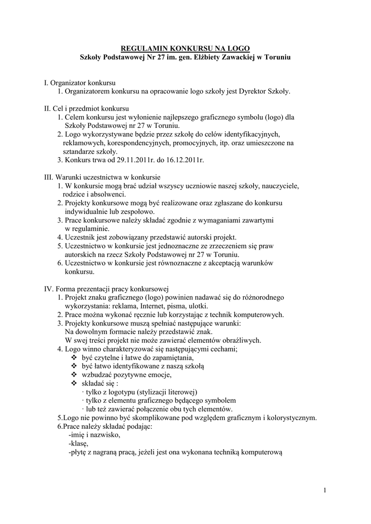 REGULAMIN KONKURSU NA LOGO Szkoły Podstawowej Nr 27 im. gen. Elżbiety Zawackiej w Toruniu I. Organizator konkursu 1. Organizatorem konkursu na opracowanie logo szkoły jest Dyrektor Szkoły. II. Cel i przedmiot konkursu 1. Celem konkursu jest wyłonienie najlepszego graficznego symbolu (logo) dla Szkoły Podstawowej nr 27 w Toruniu. 2. Logo wykorzystywane będzie przez szkołę do celów identyfikacyjnych, reklamowych, korespondencyjnych, promocyjnych, itp. oraz umieszczone na sztandarze szkoły. 3. Konkurs trwa od 29.11.2011r. do 16.12.2011r. III. Warunki uczestnictwa w konkursie 1. W konkursie mogą brać udział wszyscy uczniowie naszej szkoły, nauczyciele, rodzice i absolwenci. 2. Projekty konkursowe mogą być realizowane oraz zgłaszane do konkursu indywidualnie lub zespołowo. 3. Prace konkursowe należy składać zgodnie z wymaganiami zawartymi w regulaminie. 4. Uczestnik jest zobowiązany przedstawić autorski projekt. 5. Uczestnictwo w konkursie jest jednoznaczne ze zrzeczeniem się praw autorskich na rzecz Szkoły Podstawowej nr 27 w Toruniu. 6. Uczestnictwo w konkursie jest równoznaczne z akceptacją warunków konkursu. IV. Forma prezentacji pracy konkursowej 1. Projekt znaku graficznego (logo) powinien nadawać się do różnorodnego wykorzystania: reklama, Internet, pisma, ulotki. 2. Prace można wykonać ręcznie lub korzystając z technik komputerowych. 3. Projekty konkursowe muszą spełniać następujące warunki: Na dowolnym formacie należy przedstawić znak. W swej treści projekt nie może zawierać elementów obraźliwych. 4. Logo winno charakteryzować się następującymi cechami; być czytelne i łatwe do zapamiętania, być łatwo identyfikowane z naszą szkołą wzbudzać pozytywne emocje, składać się : · tylko z logotypu (stylizacji literowej) · tylko z elementu graficznego będącego symbolem · lub też zawierać połączenie obu tych elementów. 5.Logo nie powinno być skomplikowane pod względem graficznym i kolorystycznym. 6.Prace należy składać podając: -imię i nazwisko, -klasę, -płytę z nagraną pracą, jeżeli jest ona wykonana techniką komputerową 1 V. Miejsce i termin składania prac konkursowych 1. Prace należy składać do dnia 16.12.2011r. do p. Honoraty Herman - Meler lub w sekretariacie szkoły. 2. Prace konkursowe, niespełniające wymagań, o których mowa w regulaminie konkursu, nie będą podlegały ocenie Komisji Konkursowej. 3. Prace dostarczone po terminie nie będą oceniane. 4. Organizator nie zwraca prac. VI. Kryteria oceny prac konkursowych Projekty oceniane będą zgodnie z następującymi kryteriami: 1) zgodność projektu z danymi naszej szkoły, 2) oryginalność znaku, łatwość zapamiętywania, 3) czytelność i funkcjonalność projektu, 4) estetyka wykonania projektu. VII. Ocena prac konkursowych Zwycięskie prace zostaną wybrane przez Komisję Konkursową, w składzie: 1. Dyrektor szkoły 2. Przedstawiciel Rady Rodziców 3. Przedstawiciel Samorządu Uczniowskiego 4. Przedstawiciel Rady Pedagogicznej(nauczyciel informatyki) 5. Fundatorzy sztandaru. w/w osoby nie mogą być uczestnikami konkursu oraz mieć z nimi powiązań rodzinnych VIII. Rozstrzygnięcie konkursu 1. W wyniku postępowania konkursowego Komisja Konkursowa wyłania zwycięzcę konkursu. 2. Dla zwycięzców przewidziane są nagrody. 3. Planowana data ogłoszenia wyników 13.01.2012r. 4. Wyniki zostaną zamieszczone na stronie szkoły. 2