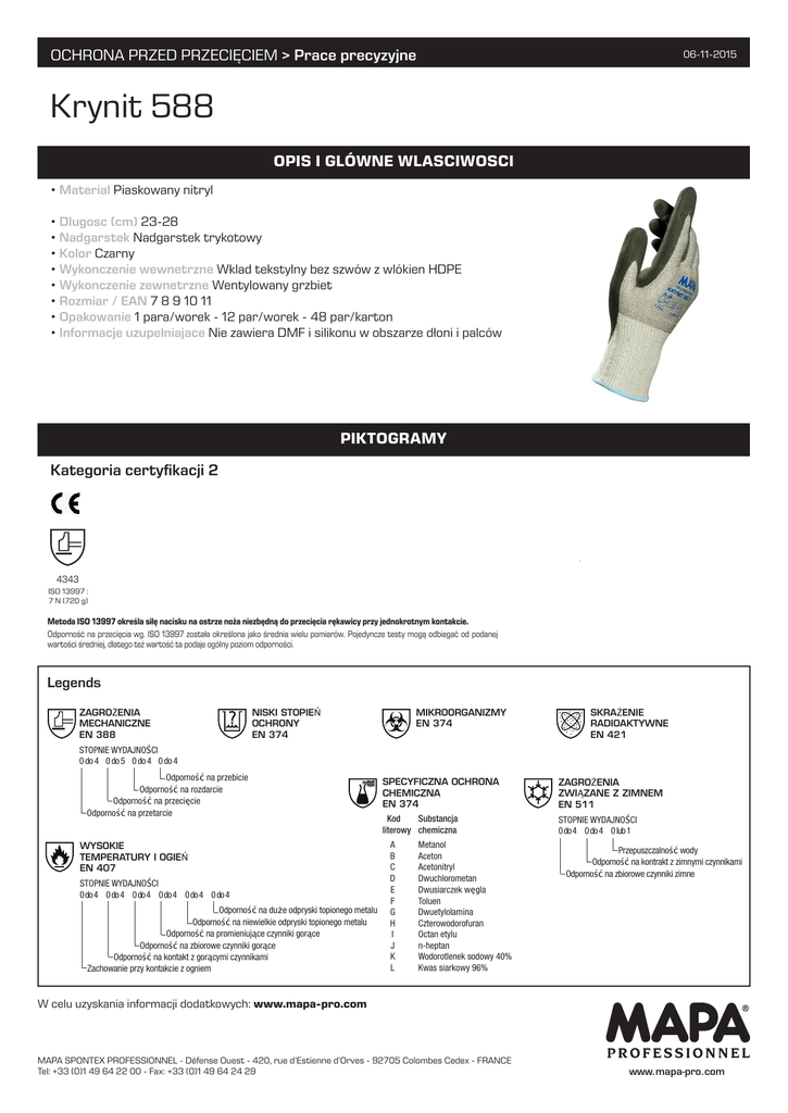 OCHRONA PRZED PRZECIĘCIEM > Prace precyzyjne 06-11-2015 Krynit 588 OPIS I GLÓWNE WLASCIWOSCI • Material Piaskowany nitryl • Dlugosc (cm) 23-28 • Nadgarstek Nadgarstek trykotowy • Kolor Czarny • Wykonczenie wewnetrzne Wklad tekstylny bez szwów z wlókien HDPE • Wykonczenie zewnetrzne Wentylowany grzbiet • Rozmiar / EAN 7 8 9 10 11 • Opakowanie 1 para/worek - 12 par/worek - 48 par/karton • Informacje uzupelniajace Nie zawiera DMF i silikonu w obszarze dłoni i palców PIKTOGRAMY Kategoria certyfikacji 2 . 4343 ISO 13997 : 7 N (720 g) Metoda ISO 13997 określa siłę nacisku na ostrze noża niezbędną do przecięcia rękawicy przy jednokrotnym kontakcie. Odporność na przecięcia wg. ISO 13997 została określona jako średnia wielu pomiarów. Pojedyncze testy mogą odbiegać od podanej wartości średniej, dlatego też wartość ta podaje ogólny poziom odporności. Legends ZAGROENIA MECHANICZNE EN 388 MIKROORGANIZMY EN 374 NISKI STOPIE OCHRONY EN 374 SKRAENIE RADIOAKTYWNE EN 421 STOPNIE WYDAJNOCI 0 do 4 0 do 5 0 do 4 0 do 4 Odporno na przebicie Odporno na rozdarcie Odporno na przecicie Odporno na przetarcie WYSOKIE TEMPERATURY I OGIE EN 407 STOPNIE WYDAJNOCI 0 do 4 0 do 4 0 do 4 0 do 4 0 do 4 0 do 4 Odporno na due odpryski topionego metalu Odporno na niewielkie odpryski topionego metalu Odporno na promieniujce czynniki gorce Odporno na zbiorowe czynniki gorce Odporno na kontakt z gorcymi czynnikami Zachowanie przy kontakcie z ogniem SPECYFICZNA OCHRONA CHEMICZNA EN 374 ZAGROENIA ZWIZANE Z ZIMNEM EN 511 Kod Substancja literowy chemiczna STOPNIE WYDAJNOCI 0 do 4 0 do 4 0 lub 1 A B C D E F G H I J K L Metanol Aceton Acetonitryl Dwuchlorometan Dwusiarczek wgla Toluen Dwuetylolamina Czterowodorofuran Octan etylu n-heptan Wodorotlenek sodowy 40% Kwas siarkowy 96% Przepuszczalno wody Odporno na kontrakt z zimnymi czynnikami Odporno na zbiorowe czynniki zimne W celu uzyskania informacji dodatkowych: www.mapa-pro.com MAPA SPONTEX PROFESSIONNEL - Défense Ouest - 420, rue d’Estienne d’Orves - 92705 Colombes Cedex - FRANCE Tel: +33 (0)1 49 64 22 00 - Fax: +33 (0)1 49 64 24 29 www.mapa-pro.com Krynit 588 OPIS I GLÓWNE WLASCIWOSCI • Rękawice zabezpieczające przed przecięciem, bez zawartości DMF • Nitrylowa piaskowana powłoka zapewnia doskonałą chwytność w środowiskach oleistych. Pozwala także zredukować zmęczenie mięśni i poprawić wydajność pracy. • Doskonała odporność na ścieranie dzięki nitrylowej powłoce. • Trwałe i ekonomiczne: możliwość prania - gwarancja zachowania właściwości ochronnych po 5 cyklach czyszczenia. ZASTOSOWANIE Przemysł samochodowy i mechaniczny • Manipulowanie metalowymi arkuszami • Manipulowanie zaolejonymi częściami • Manipulowanie i segregowanie drobnych, ostrych części Przemysł szklany • Manipulowanie arkuszami szkła Inne przemysły • Serwisowanie Przemysł mechaniczny • Prace w mokrym środowisku (woda, olej, smary, weglowodory) • Przecinanie i wytłaczanie metali INSTRUKCJA UŻYTKOWANIA Instrukcja uzytkowania Zaleca się sprawdzenie, czy rękawice nadają się do planowanego zastosowania, ponieważ warunki testów typu WE mogą się różnić od warunków w miejscu pracy. •Używanie tych rękawic nie jest zalecane u osób uczulonych na ditiokarbaminiany i lateks naturalny (elastyczna guma naturalna w okolicy nadgarstka). •Rękawice należy zakładać na suche i czyste dłonie. •Przed ponownym założeniem rękawic należy się upewnić, że ich wnętrze jest suche. •Przed ponownym użyciem rękawic skontrolować je pod kątem pęknięć i rozdarć. •Nie używać w pobliżu urządzeń z ruchomymi elementami. Warunki przechowywania Rękawice należy przechowywać w oryginalnym opakowaniu, chroniąc je przed oddziaływaniem źródeł ciepła, światła i wilgoci Instrukcja prania Rękawice zanieczyszczone olejem lub smarem należy przed zdjęciem wytrzeć suchą szmatką. Wytrzymałość rękawic jest gwarantowana do 5 cykli czyszczenia w następujących warunkach: Pranie w pralce domowej lub przemysłowej z zastosowaniem standardowego detergentu w płynie. Wybrać program do wyrobów syntetycznych z temperaturą 60°C oraz tryb suszenia z prędkością 400 obr./min. Niewłaściwe użycie rękawic lub przekazanie ich do czyszczenia lub prania w sposób, który nie jest dla nich zalecany, może skutkować utratą właściwości. Instrukcja suszenia Można suszyć w suszarce bębnowej w temperaturze maksymalnie 60°C. Zakładać na suche, czyste dłonie. Przed ponownym założeniem rękawic należy się upewnić, że ich wnętrze jest suche. PRZEPISY Produkt nie został sklasyfikowany jako niebezpieczny zgodnie z Rozporządzeniem (WE) nr 1272/2008 Parlamentu Europejskiego i Rady Europy. W przypadku tego produktu, zawartość substancji wzbudzających szczególnie duże obawy (SVHC) lub jakiejkolwiek substancji wymienionej w załączniku XVII do rozporządzenia (WE) nr 1907/2006 Parlamentu Europejskiego i Rady Europy (REACH), nie przekracza 0,1%. • Certyfikat badan typu CE 0075/014/162/07/15/0716 • Wydany przez organizacje nr 0075 - CTC - 4, rue Hermann Frenkel - 69367-Lyon cedex 07 - France www.mapa-pro.com