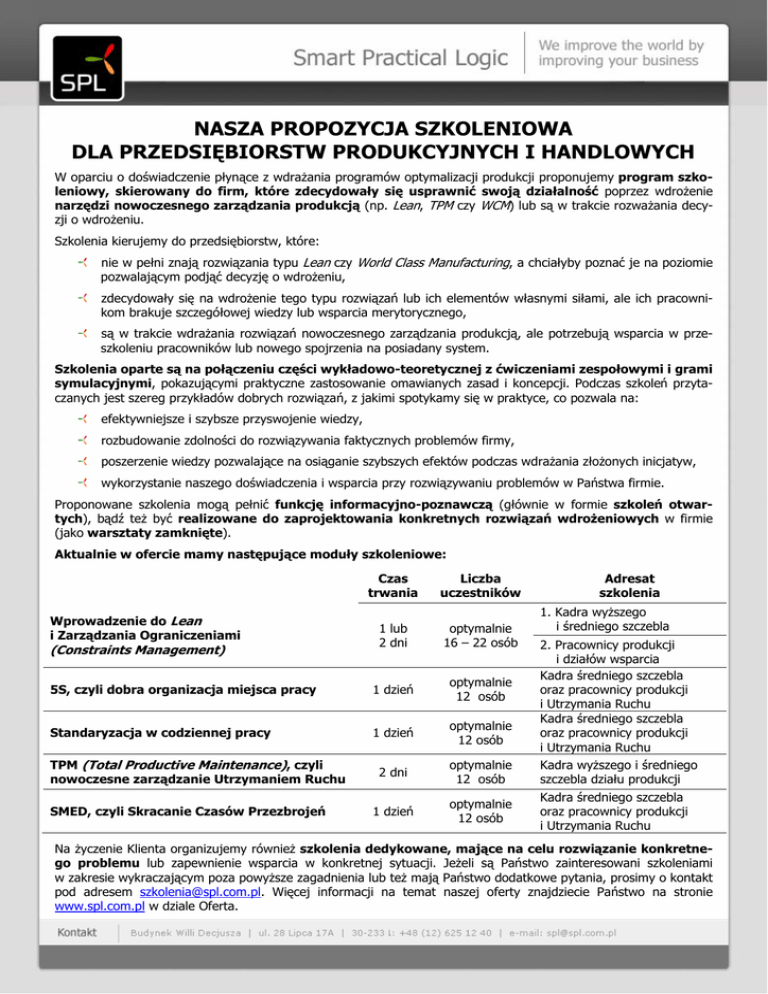 NASZA PROPOZYCJA SZKOLENIOWA DLA PRZEDSIĘBIORSTW PRODUKCYJNYCH I HANDLOWYCH W oparciu o doświadczenie płynące z wdrażania programów optymalizacji produkcji proponujemy program szkoleniowy, skierowany do firm, które zdecydowały się usprawnić swoją działalność poprzez wdrożenie narzędzi nowoczesnego zarządzania produkcją (np. Lean, TPM czy WCM) lub są w trakcie rozważania decyzji o wdrożeniu. Szkolenia kierujemy do przedsiębiorstw, które: nie w pełni znają rozwiązania typu Lean czy World Class Manufacturing, a chciałyby poznać je na poziomie pozwalającym podjąć decyzję o wdrożeniu, zdecydowały się na wdrożenie tego typu rozwiązań lub ich elementów własnymi siłami, ale ich pracownikom brakuje szczegółowej wiedzy lub wsparcia merytorycznego, są w trakcie wdrażania rozwiązań nowoczesnego zarządzania produkcją, ale potrzebują wsparcia w przeszkoleniu pracowników lub nowego spojrzenia na posiadany system. Szkolenia oparte są na połączeniu części wykładowo-teoretycznej z ćwiczeniami zespołowymi i grami symulacyjnymi, pokazującymi praktyczne zastosowanie omawianych zasad i koncepcji. Podczas szkoleń przytaczanych jest szereg przykładów dobrych rozwiązań, z jakimi spotykamy się w praktyce, co pozwala na: efektywniejsze i szybsze przyswojenie wiedzy, rozbudowanie zdolności do rozwiązywania faktycznych problemów firmy, poszerzenie wiedzy pozwalające na osiąganie szybszych efektów podczas wdrażania złożonych inicjatyw, wykorzystanie naszego doświadczenia i wsparcia przy rozwiązywaniu problemów w Państwa firmie. Proponowane szkolenia mogą pełnić funkcję informacyjno-poznawczą (głównie w formie szkoleń otwartych), bądź też być realizowane do zaprojektowania konkretnych rozwiązań wdrożeniowych w firmie (jako warsztaty zamknięte). Aktualnie w ofercie mamy następujące moduły szkoleniowe: Czas trwania Wprowadzenie do Lean i Zarządzania Ograniczeniami Liczba uczestników Adresat szkolenia 1. Kadra wyższego i średniego szczebla 1 lub 2 dni optymalnie 16 – 22 osób 5S, czyli dobra organizacja miejsca pracy 1 dzień optymalnie 12 osób Standaryzacja w codziennej pracy 1 dzień optymalnie 12 osób 2 dni optymalnie 12 osób Kadra wyższego i średniego szczebla działu produkcji 1 dzień optymalnie 12 osób Kadra średniego szczebla oraz pracownicy produkcji i Utrzymania Ruchu (Constraints Management) TPM (Total Productive Maintenance), czyli nowoczesne zarządzanie Utrzymaniem Ruchu SMED, czyli Skracanie Czasów Przezbrojeń 2. Pracownicy produkcji i działów wsparcia Kadra średniego szczebla oraz pracownicy produkcji i Utrzymania Ruchu Kadra średniego szczebla oraz pracownicy produkcji i Utrzymania Ruchu Na życzenie Klienta organizujemy również szkolenia dedykowane, mające na celu rozwiązanie konkretnego problemu lub zapewnienie wsparcia w konkretnej sytuacji. Jeżeli są Państwo zainteresowani szkoleniami w zakresie wykraczającym poza powyższe zagadnienia lub też mają Państwo dodatkowe pytania, prosimy o kontakt pod adresem [email protected]. Więcej informacji na temat naszej oferty znajdziecie Państwo na stronie www.spl.com.pl w dziale Oferta. WPROWADZENIE DO LEAN I ZARZĄDZANIA OGRANICZENIAMI (CONSTRAINTS MANAGEMENT) Opis ogólny Szkolenie omawiające tematykę „szczupłego wytwarzania” (Lean Manufacturing) i zarządzania ograniczeniami (Constraints Management) oraz korzyści z wdrożenia obu koncepcji w firmie. Uczestnicy szkolenia wcielają się w role kierownictwa oraz pracowników działów operacyjnych i wspierających, których zadaniem jest produkowanie wyrobów zgodnie z oczekiwaniami klienta. Pracownicy fabryki symulowanej w czasie szkolenia przekonują się, jak trudno jest sprostać wymaganiom klienta, jeśli w odpowiednim czasie nie podejmie się działań mających na celu usprawnienie procesu produkcyjnego. Szkolenie podzielone jest na rundy, składające się z części teoretycznej, sesji praktycznej oraz gry. W ramach części teoretycznych uczestnicy zdobywają wiedzę z zakresu Lean i Zarządzania Ograniczeniami, obejmującą podstawy następujących zagadnień: Mapowanie strumienia wartości, Analiza marnotrawstwa, 5S i organizacja miejsca pracy, Standaryzacja, SMED (Single Minute Exchange of Dies), jako droga do szybkich przezbrojeń, TPM (Total Productive Maintenance), jako metoda optymalizacji zaplecza produkcji Kanban i równoważenie produkcji, Budowanie relacji wewnątrz i na zewnątrz przedsiębiorstwa. które pozwalają im na znajdowanie potencjału oszczędności i opracowywanie działań doskonalących w swojej „fabryce”. Następnie w częściach praktycznych uczestnicy wdrażają poznane techniki na swoich stanowiskach, usprawniając analizowany proces. Wszelkie decyzje podejmowane przez uczestników mają bezpośrednie przełożenie na uzyskiwane przez ich „fabrykę” wyniki finansowe i poziomy wskaźników – braków, jakości czy zadowolenia klienta. Uczestnicy przez cały czas trwania szkolenia są angażowani w proces wprowadzania zmian, biorą udział w dyskusjach i podejmują samodzielnie decyzje o realizowanych usprawnieniach. Na bazie prowadzonej analizy finansowej, w kolejnych rundach wyraźnie daje się zauważyć wpływ podjętych działań doskonalących na przebieg procesu produkcyjnego oraz zadowolenie klienta. Przebieg szkolenia i obserwowane efekty mają przełożenie na rzeczywisty proces zmian, który zachodzi w przedsiębiorstwie wdrażającym przedstawiane narzędzia optymalizacji produkcji. Cele szkolenia Zapoznanie uczestników z koncepcją Lean i Zarządzaniem Ograniczeniami Omówienie narzędzi wspierających proces zmian, pozwalających na osiągnięcie znacznego usprawnienia procesu Zrozumienie wpływu przedstawionych koncepcji na wynik finansowy i zadowolenie klienta Poznanie zalet zespołowego rozwiązywania problemów Pokazanie wyższej kadrze kierowniczej problemów pojawiających się na stanowiskach pracy i ich wpł