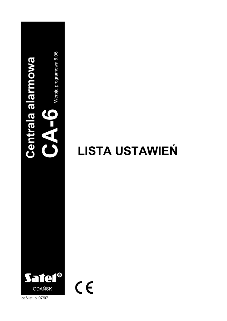 GDA SK ca6list_pl 07/07 CA-6 Wersja programowa 6.06 Centrala alarmowa LISTA USTAWIE SYSTEM ALARMOWY .............................................................................................................. YTKOWNIK ........................................................................................................................... ADRES....................................................................................................................................... NUMER TELEFONU.................................................................................................................. UWAGI....................................................................................................................................... ................................................................................................................................................... ................................................................................................................................................... Aktualn tre deklaracji zgodno ci EC i certyfikatów mo na pobra ze strony internetowej www.satel.pl CA-6 SATEL 1 FS1 - HAS O SERWISOWE |__|__|__|__|__|__|# FS2 - IDENTYFIKATOR CENTRALI FS3 - IDENTYFIKATOR KOMPUTERA |__|__|#|__|__|#|__|__|# |__|__|#|__|__|#|__|__|# FS4 - NR TEL. KOMPUTERA |__|__|#|__|__|#|__|__|#|__|__|#|__|__|#|__|__|#|__|__|#|__|__|# Fabrycznie: |12345| Fabrycznie: |3175B9| Fabrycznie: |658709| Fabrycznie: |AAAAAAAAAAAAAAAA| Max.16 cyfr i znaków specjalnych, numer zako czy znakiem AA Uwaga: Znaków B F nie nale y umieszcza przed numerem telefonu – s one do wprowadzania zmian w trakcie wybierania numeru. Podstawowy tryb wybierania numeru i test sygna u na linii telefonicznej przed wybraniem numeru za cza si w FS5. FS5 - OPCJE SYSTEMU PIERWSZY ZESTAW OPCJI DRUGI ZESTAW OPCJI TRZECI ZESTAW OPCJI (miga dolna dioda B) (miga dolna dioda A) (migaj dolne diody A i B) Dozwolone wywo anie DOWNLOADINGU z zewn trz Wybieranie numeru – tonowe (wy . – impulsowe) nie wykorzystana 1 Telefonowanie 1 2 Monitoring 2 3 Odpowiadanie na telefon 3 Podwójny komunikat z syntezera 3 4 Zawieszenie monitoringu do wyst pienia nowego zdarzenia (wy . – zawieszenie na 30 min.) 4 Sygna GROUND START 4 5 Zapisywanie w pami ci zdarze tylko 3 kolejnych zdarze transmisji testowej 5 Telefonowanie bez testu zg oszenia centrali telefonicznej 5 6 Komunikat bez testu odebrania 6 7 Transmisja szeregowa na OUT4,5 ** (do radiopowiadamiania NOKTON) 7 OUT4,5 - Transmisja typu UA 8 Podwójne wywo anie odpowiadania na telefon 8 nie wykorzystana 6 7 nie wykorzystane 8 * Zatwierdzi klawiszem # * Monitorowanie jest zawieszane w przypadku problemów z Zatwierdzi klawiszem # czno ci za stacj monitoruj 1 2 DOWNLOADING tylko, gdy centrala nie czuwa Alarm, je li po czasie na wyj cie s naruszone wej cia nie wykorzystane Zatwierdzi klawiszem # (po 16 nieudanych próbach po czenia). ** Opcja 7 trzeciego zestawu jest istotna przy za czonej opcji 7 drugiego zestawu. Gdy wy czona jest transmisja UA (LED 7 zgaszona) wyj cia 4 i 5 pracuj (PC16OUT). w formacie NOKTON ** CA-6 Lista ustawie |__|__|# FS6 - CZASY GLOBALNE (programowa od 00 do 99 sek.) FS7 - LICZNIKI WEJ |__|__|# 2 |__|__|# Fabrycznie: |30|60|60| sek. czas na wej cie czas na wyj cie czas alarmu LICZ CYCH (programowa od 00 do 07) |__|__|# |__|__|# |__|__|# 1 2 3 Licznik FS8, 9 - PRZYPISYWANIE WEJ Fabrycznie: |01|01|01| DO STREFY FS16, 17 - WEJ CIA AUTOMATYCZNIE BLOKOWANE DLA CZUWANIA CICHEGO I UZBROJENIA CZ FS127, 128 - WEJ CIA BLOKOWANE PRZY BRAKU WYJ CIA ZE STREFY. WEJ CIA AUTOMATYCZNIE BLOKOWANE WEJ CIA STREFY FS 8 Strefa A FS 9 Strefa B FS 16 Strefa A FS 17 Strefa B WEJ CIA BLOKOWANE PRZY BRAKU WYJ CIA ZE STREFY FS 127 Strefa A FS 128 Strefa B WEJ CIE 1 1 1 1 1 1 1 WEJ CIE 2 2 2 2 2 2 2 WEJ CIE 3 3 3 3 3 3 3 WEJ CIE 4 4 4 4 4 4 4 WEJ CIE 5 5 5 5 5 5 5 WEJ CIE 6 6 6 6 6 6 6 WEJ CIE 7 7 7 7 7 7 7 WEJ CIE 8 8 8 8 8 8 8 Zatwierdzi klawiszem # -opcje za czone fabrycznie CIOWEGO. CA-6 SATEL 3 FS20 - OPCJE MANIPULATORA I STREF PIERWSZY ZESTAW OPCJI DRUGI ZESTAW OPCJI (miga dolna dioda B) (miga dolna dioda A) 1 Blokada szybkiego za czania czuwania strefy A 1 Alarm w manipulatorze do wy . has em (je eli wy . opcja 2 tego zestawu) 2 Blokada szybkiego za czania czuwania strefy B 2 Alarm w manipulatorze przez czas alarmu 3 Blokada szybkiego za czania czuwania obu stref 3 Sygn. naruszenia linii „cicha/g 4 nie wykorzystana 4 Sygnalizacja gongu (CHIME) 5 Blokada alarmu po 3 b dnych has ach 5 Sygnalizacja d wi kowa awarii 6 Blokada alarmu napadowego (PANIC) z klawiatury 6 Sygn. czasu na wyj cie w manipulatorze 7 Blokada alarmu pomocniczego (AUX) z klawiatury 7 Sygn. czasu na wej cie w manipulatorze 8 Blokada alarmu po arowego (FIRE) z klawiatury 8 Sygnalizacja naci ni cia klawisza. Zatwierdzi klawiszem # FS24 - CZU Zatwierdzi klawiszem # WEJ Wej cie (programowa od 1 do 255) 1 2 3 4 5 6 7 8 30 30 30 30 30 30 30 30 6 7 8 Uwaga: Na diodach 1-8 nie jest wy wietlana nowa warto parametru. Fabrycznie dla wszystkich wej zaprogramowane jest 30 (30*16 ms = 480 ms.). Programowa od 1 do 255, ka liczb zatwierdza klawiszem [#]. Warto Fabrycznie [x16ms] na” lub „licznikowa” FS25 - TYP LINII (programowa od 00 do 05) Wej cie 1 2 3 4 5 Warto Fabrycznie 0 3 0 3 0 3 0 3 0 3 0 3 0 3 0 3 00 01 02 brak czujnika czujnik NC czujnik NO 03 04 05 czujnik EOL czujnik 2EOL/NC czujnik 2EOL/NO CA-6 Lista ustawie FS26 - TYP REAKCJI WEJ (programowa od 00 do 20) 00 - wej cia/wyj cia (EXIT/ENTRY) 01 - opó niona (DELAY) 02 - opó niona wewn trzna Wej cie 1 2 03 - natychmiastowa (INSTANT) 04 - cicha/g na (DAY/NIGHT) 05 - natychmiastowa licznikowa L1 3 4 5 6 7 8 Warto Fabrycznie 0 0 0 3 4 0 3 0 3 0 3 0 3 0 3 0 3 06 - natychmiastowa licznikowa L2 07 - natychmiastowa licznikowa L3 08 - 24H g na 09 - 24H pomocnicza (AUX) 10 - 24H cicha (SILENT) 11 - 24H po arowa (FIRE) 12 - w czaj ca czuwanie 13 - w czaj ca czuwanie ciche 14 - wy czaj ca czuwanie 15 - bez akcji alarmowej 16 - za 