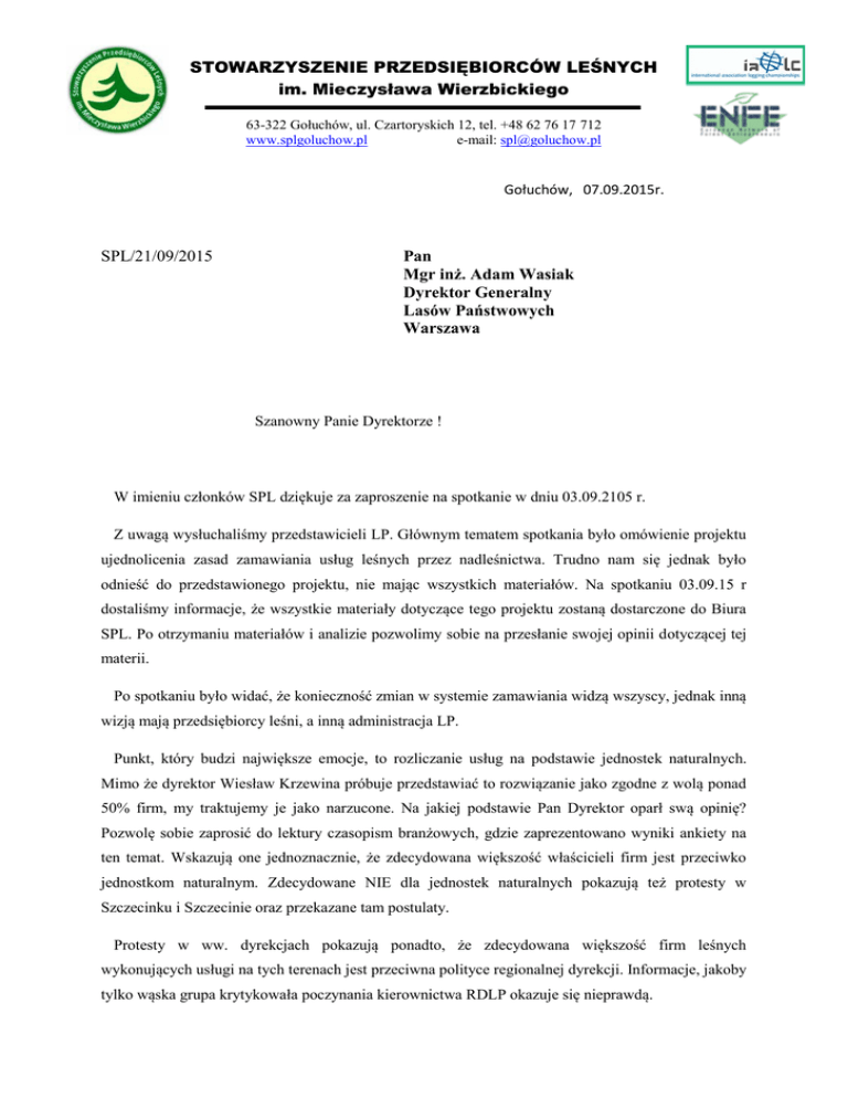 STOWARZYSZENIE PRZEDSIĘBIORCÓW LEŚNYCH im. Mieczysława Wierzbickiego 63-322 Gołuchów, ul. Czartoryskich 12, tel. +48 62 76 17 712 www.splgoluchow.pl e-mail: [email protected] Gołuchów, 07.09.2015r. SPL/21/09/2015 Pan Mgr inż. Adam Wasiak Dyrektor Generalny Lasów Państwowych Warszawa Szanowny Panie Dyrektorze ! W imieniu członków SPL dziękuje za zaproszenie na spotkanie w dniu 03.09.2105 r. Z uwagą wysłuchaliśmy przedstawicieli LP. Głównym tematem spotkania było omówienie projektu ujednolicenia zasad zamawiania usług leśnych przez nadleśnictwa. Trudno nam się jednak było odnieść do przedstawionego projektu, nie mając wszystkich materiałów. Na spotkaniu 03.09.15 r dostaliśmy informacje, że wszystkie materiały dotyczące tego projektu zostaną dostarczone do Biura SPL. Po otrzymaniu materiałów i analizie pozwolimy sobie na przesłanie swojej opinii dotyczącej tej materii. Po spotkaniu było widać, że konieczność zmian w systemie zamawiania widzą wszyscy, jednak inną wizją mają przedsiębiorcy leśni, a inną administracja LP. Punkt, który budzi największe emocje, to rozliczanie usług na podstawie jednostek naturalnych. Mimo że dyrektor Wiesław Krzewina próbuje przedstawiać to rozwiązanie jako zgodne z wolą ponad 50% firm, my traktujemy je jako narzucone. Na jakiej podstawie Pan Dyrektor oparł swą opinię? Pozwolę sobie zaprosić do lektury czasopism branżowych, gdzie zaprezentowano wyniki ankiety na ten temat. Wskazują one jednoznacznie, że zdecydowana większość właścicieli firm jest przeciwko jednostkom naturalnym. Zdecydowane NIE dla jednostek naturalnych pokazują też protesty w Szczecinku i Szczecinie oraz przekazane tam postulaty. Protesty w ww. dyrekcjach pokazują ponadto, że zdecydowana większość firm leśnych wykonujących usługi na tych terenach jest przeciwna polityce regionalnej dyrekcji. Informacje, jakoby tylko wąska grupa krytykowała poczynania kierownictwa RDLP okazuje się nieprawdą. Protest 16.10.2015 r. pokaże, jak duża liczba firm krytycznie ocenia kierunek przyjęty przez LP wobec sektora leśno-drzewnego. Na spotkaniu został poruszony również zasadniczy postulat przedsiębiorców leśnych. Jest nim urealnienie stawek poprzez ich podniesienie o 30%. Informację przekazaną przez pana dyrektora generalnego, jakoby LP nie było stać na podwyżki dla przedsiębiorców uważamy za brak dobrej woli. Ostatnie informacje prasowe pokazują doskonale, gdzie można poszukać oszczędności, które można przesunąć na sektor usług leśnych. Przypomnę, że ZG SPL od wielu lat sygnalizował, iż środki przekazywane na nasz sektor są niewystarczające. Cieszę się, że Pan Dyrektor przyznał nam wreszcie rację. Deklarując podniesienie o 5% stawek za usługi leśne w stosunku do ubiegłorocznego planu, nie zaś jak to praktykowano dotychczas w stosunku do cen uzyskanych w przetargach, potwierdził Pan: mechanizm ustalania przez LP stawek był wadliwy. Dziękujemy, Panie Dyrektorze! Zmiana – oby była trwała – tej krzywdzącej formuły to ruch w dobrym kierunku, lecz niestety niewystarczający. Dzisiaj możemy to powiedzieć głośno: gdyby dystrybucja środków przez ostatnie 8 lat była uczciwa wobec firm leśnych, nie byłoby zawirowania wobec LP, a ich wizerunek pozostałby nieskazitelny. Panie Dyrektorze Generalny, pozwolę sobie na koniec jeszcze raz powtórzyć dwa najważniejsze postulaty przedsiębiorców leśnych: – Urealnienie stawek poprzez ich podniesienie o 30% – Kosztorysowanie i rozliczanie wg katalogów Jestem też zmuszony poinformować Pana Dyrektora, że niespełnienie tych postulatów oraz postulatów drzewiarzy będzie oznaczało , iż o naszych problemach będziemy rozmawiać na ulicy… Pełnomocnik Zarządu Głównego SPL Stefan Sokolski