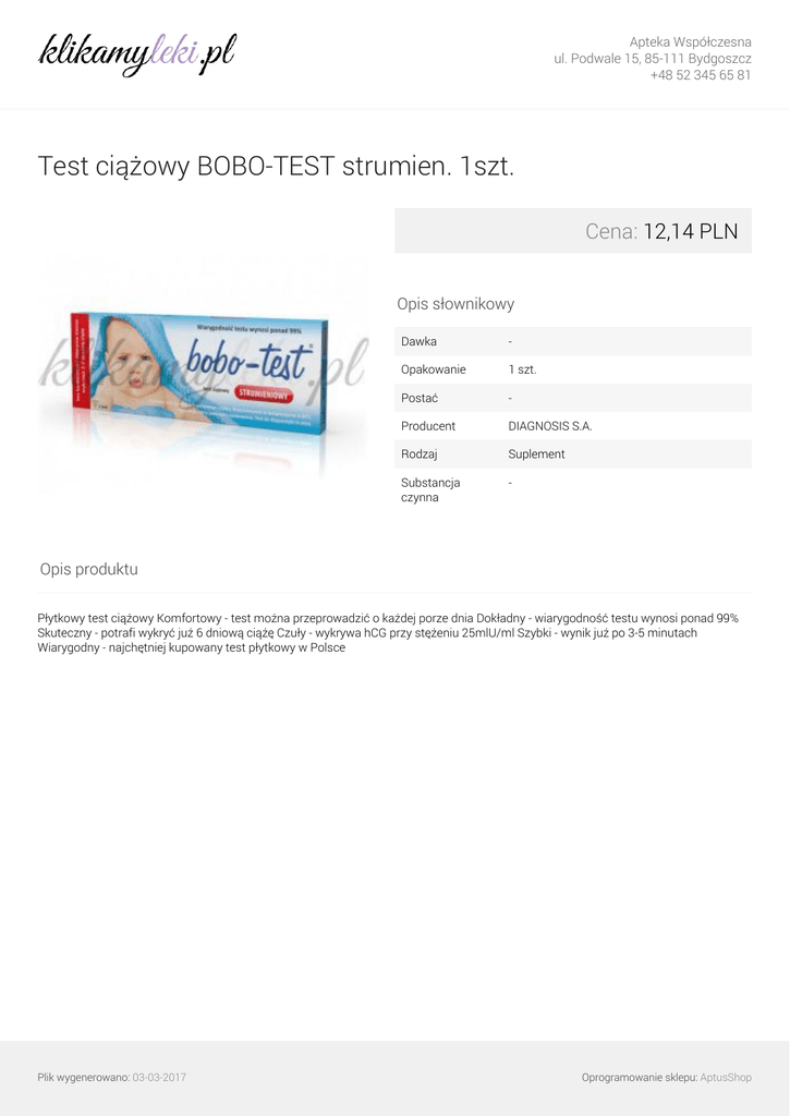 Apteka Współczesna ul. Podwale 15, 85-111 Bydgoszcz +48 52 345 65 81 Test ciążowy BOBO-TEST strumien. 1szt. Cena: 12,14 PLN Opis słownikowy Dawka - Opakowanie 1 szt. Postać - Producent DIAGNOSIS S.A. Rodzaj Suplement Substancja czynna - Opis produktu Płytkowy test ciążowy Komfortowy - test można przeprowadzić o każdej porze dnia Dokładny - wiarygodność testu wynosi ponad 99% Skuteczny - potrafi wykryć już 6 dniową ciążę Czuły - wykrywa hCG przy stężeniu 25mlU/ml Szybki - wynik już po 3-5 minutach Wiarygodny - najchętniej kupowany test płytkowy w Polsce Plik wygenerowano: 03-03-2017 Powered by TCPDF (www.tcpdf.org) Oprogramowanie sklepu: AptusShop