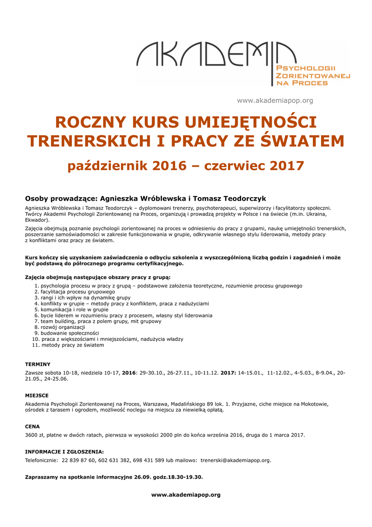 www.akademiapop.org ROCZNY KURS UMIEJĘTNOŚCI TRENERSKICH I PRACY ZE ŚWIATEM październik 2016 – czerwiec 2017 Osoby prowadzące: Agnieszka Wróblewska i Tomasz Teodorczyk Agnieszka Wróblewska i Tomasz Teodorczyk – dyplomowani trenerzy, psychoterapeuci, superwizorzy i facylitatorzy społeczni. Twórcy Akademii Psychologii Zorientowanej na Proces, organizują i prowadzą projekty w Polsce i na świecie (m.in. Ukraina, Ekwador). Zajęcia obejmują poznanie psychologii zorientowanej na proces w odniesieniu do pracy z grupami, naukę umiejętności trenerskich, poszerzanie samoświadomości w zakresie funkcjonowania w grupie, odkrywanie własnego stylu liderowania, metody pracy z konfliktami oraz pracy ze światem. Kurs kończy się uzyskaniem zaświadczenia o odbyciu szkolenia z wyszczególnioną liczbą godzin i zagadnień i może być podstawą do półrocznego programu certyfikacyjnego. Zajęcia obejmują następujące obszary pracy z grupą: 1. psychologia procesu w pracy z grupą – podstawowe założenia teoretyczne, rozumienie procesu grupowego 2. facylitacja procesu grupowego 3. rangi i ich wpływ na dynamikę grupy 4. konflikty w grupie – metody pracy z konfliktem, praca z nadużyciami 5. komunikacja i role w grupie 6. bycie liderem w rozumieniu pracy z procesem, własny styl liderowania 7. team building, praca z polem grupy, mit grupowy 8. rozwój organizacji 9. budowanie społeczności 10. praca z większościami i mniejszościami, nadużycia władzy 11. metody pracy ze światem TERMINY Zawsze sobota 10-18, niedziela 10-17, 2016: 29-30.10., 26-27.11., 10-11.12. 2017: 14-15.01., 11-12.02., 4-5.03., 8-9.04., 2021.05., 24-25.06. MIEJSCE Akademia Psychologii Zorientowanej na Proces, Warszawa, Madalińskiego 89 lok. 1. Przyjazne, ciche miejsce na Mokotowie, ośrodek z tarasem i ogrodem, możliwość noclegu na miejscu za niewielką opłatą. CENA 3600 zł, płatne w dwóch ratach, pierwsza w wysokości 2000 pln do końca września 2016, druga do 1 marca 2017. INFORMACJE I ZGŁOSZENIA: Telefonicznie: 22 839 87 60, 602 631 382, 698 431 589 lub mailowo: [email protected]. Zapraszamy na spotkanie informacyjne 26.09. godz.18.30-19.30. www.akademiapop.org