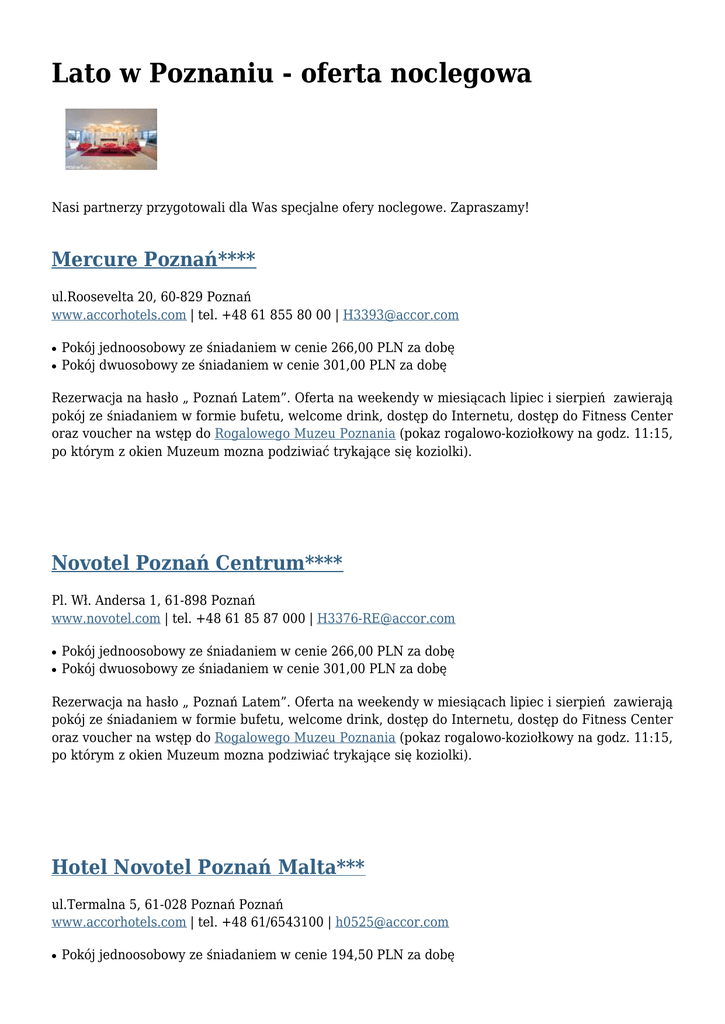 Lato w Poznaniu - oferta noclegowa Nasi partnerzy przygotowali dla Was specjalne ofery noclegowe. Zapraszamy! Mercure Poznań**** ul.Roosevelta 20, 60-829 Poznań www.accorhotels.com | tel. +48 61 855 80 00 | [email protected] ● ● Pokój jednoosobowy ze śniadaniem w cenie 266,00 PLN za dobę Pokój dwuosobowy ze śniadaniem w cenie 301,00 PLN za dobę Rezerwacja na hasło „ Poznań Latem”. Oferta na weekendy w miesiącach lipiec i sierpień zawierają pokój ze śniadaniem w formie bufetu, welcome drink, dostęp do Internetu, dostęp do Fitness Center oraz voucher na wstęp do Rogalowego Muzeu Poznania (pokaz rogalowo-koziołkowy na godz. 11:15, po którym z okien Muzeum mozna podziwiać trykające się koziolki). Novotel Poznań Centrum**** Pl. Wł. Andersa 1, 61-898 Poznań www.novotel.com | tel. +48 61 85 87 000 | [email protected] ● ● Pokój jednoosobowy ze śniadaniem w cenie 266,00 PLN za dobę Pokój dwuosobowy ze śniadaniem w cenie 301,00 PLN za dobę Rezerwacja na hasło „ Poznań Latem”. Oferta na weekendy w miesiącach lipiec i sierpień zawierają pokój ze śniadaniem w formie bufetu, welcome drink, dostęp do Internetu, dostęp do Fitness Center oraz voucher na wstęp do Rogalowego Muzeu Poznania (pokaz rogalowo-koziołkowy na godz. 11:15, po którym z okien Muzeum mozna podziwiać trykające się koziolki). Hotel Novotel Poznań Malta*** ul.Termalna 5, 61-028 Poznań Poznań www.accorhotels.com | tel. +48 61/6543100 | [email protected] ● Pokój jednoosobowy ze śniadaniem w cenie 194,50 PLN za dobę ● Pokój dwuosobowy ze śniadaniem w cenie 217,00 PLN za dobę Rezerwacja na hasło „ Poznań Latem”. Oferta na weekendy w miesiącach lipiec i sierpień zawierają pokój ze śniadaniem w formie bufetu, welcome drink, dostęp do Internetu, dostęp do Fitness Center oraz voucher na wstęp do Rogalowego Muzeu Poznania (pokaz rogalowo-koziołkowy na godz. 11:15, po którym z okien Muzeum mozna podziwiać trykające się koziolki). City Solei Boutique Hotel**** Wenecjańska 10, 61-101 Poznań www.citysolei.pl | tel. +48 512 36 88 18 | [email protected] Przy pobytach weekendowych: ● ● W przypadku rezerwacji trzech nocy od piątku do poniedzialku trzecia noc (z niedzieli na poniedziałek) objęta jest 50% rabatu. W przypadku rezerwacji dwóch nocy gość otrzyma 50zł do wykorzystania na restauracji. Soda hostel & apartments Dąbrowskiego 27A, 60-840 Poznań www.sodahostel.com | tel. +48 793 27 27 20 | [email protected] ● ● ● 15% zniżki na pokoje 10% zniżki na miejsca w pokojach wieloosobowych oferta obowiązuje do 31 sierpnia