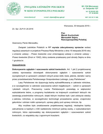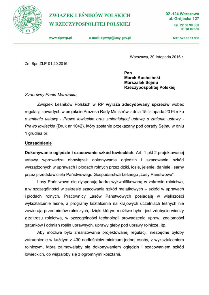 Warszawa, 30 listopada 2016 r. Zn. Spr. ZLP-01.20.2016 Pan Marek Kuchciński Marszałek Sejmu Rzeczypospolitej Polskiej Szanowny Panie Marszałku, Związek Leśników Polskich w RP wyraża zdecydowany sprzeciw wobec regulacji zawartych w projekcie Prezesa Rady Ministrów z dnia 15 listopada 2016 roku o zmianie ustawy - Prawo łowieckie oraz zmieniającej ustawę o zmianie ustawy Prawo łowieckie (Druk nr 1042), który zostanie przekazany pod obrady Sejmu w dniu 1 grudnia br. Uzasadnienie Dokonywanie oględzin i szacowanie szkód łowieckich. Art. 1 pkt 2 projektowanej ustawy wprowadza obowiązek dokonywania oględzin i szacowania szkód wyrządzonych w uprawach i płodach rolnych przez dziki, łosie, jelenie, daniele i sarny przez przedstawiciela Państwowego Gospodarstwa Leśnego „Lasy Państwowe”. Lasy Państwowe nie dysponują kadrą wykwalifikowaną w zakresie rolnictwa, a w szczególności w zakresie szacowania szkód majątkowych – szkód w uprawach i płodach rolnych. Pracownicy Lasów Państwowych posiadają w większości wykształcenie leśne, a programy kształcenia na krajowych uczelniach leśnych nie zawierają przedmiotów rolniczych, dzięki którym możliwe było i jest zdobycie wiedzy z zakresu rolnictwa, w szczególności technologii prowadzenia upraw, znajomości gatunków i odmian roślin uprawnych, uprawy gleby pod uprawy rolnicze, itp. Aby możliwe było zrealizowanie projektowanej regulacji, niezbędne byłoby zatrudnienie w każdym z 430 nadleśnictw minimum jednej osoby, z wykształceniem rolniczym, która zajmowałaby się dokonywaniem oględzin i szacowaniem szkód łowieckich, co wiązałoby się z ogromnymi kosztami. Wypłata odszkodowań za szkody łowieckie. Art. 1 pkt 4 nakłada na Państwowe Gospodarstwo Leśne „Lasy Państwowe” obowiązek wypłaty odszkodowań, który do tej pory ciążył na Skarbie Państwa. Ponadto w/w art. wprowadza zryczałtowany zwrot kosztów, zwany dalej ryczałtem ponoszony przez dzierżawcę lub zarządcę obwodu łowieckiego na rzecz Lasów Państwowych, który ma być formą rekompensaty za obowiązek wypłaty odszkodowań. Wg uzyskanych informacji szacuje się, iż na wypłatę odszkodowań za szkody w uprawach i płodach rolnych przez Państwowe Gospodarstwo Leśne „Lasy Państwowe” będzie potrzebna kwota 200 – 250 mln zł rocznie, przy czym projektowany ryczałt nie pokryje tej kwoty w całości. Brakujące środki finansowe Lasy Państwowe będą musiały wygospodarować z własnych środków. Podsumowując powyżej przytoczoną argumentację, brak jest zasadności i merytorycznego uzasadnienia w obarczeniu Lasów Państwowych wypłatą odszkodowań za szkody w uprawach i płodach rolnych, gdyż Państwowe Gospodarstwo Leśne „Lasy Państwowe” samo ponosi ogromne straty z powodu szkód od zwierzyny za które nie przysługuje im odszkodowanie przy jednoczesnym braku środków finansowych, które mogłyby być przeznaczone na wypłatę odszkodowań za szkody w uprawach i płodach rolnych dla innych podmiotów. Zwracamy się o odrzucenie projektu, a w przypadku dalszego procedowania rządowego projektu o zmianie ustawy - Prawo łowieckie oraz zmieniającej ustawę o zmianie ustawy - Prawo łowieckie w obecnej postaci, Związek Leśników Polskich w RP oświadcza, że podejmie statutowe działania, w tym akcje protestacyjne z udziałem blisko 25 tys. leśników, w tym 10.750 członków Związku Leśników Polskich w RP. Z wyrazami szacunku Otrzymują: 1. Pan Andrzej Duda - Prezydent RP 2. Pani Beata Szydło - Prezes Rady Ministrów RP 3. Pan Jarosław Kaczyński - Prezes Prawa i Sprawiedliwości 4. Pan Mateusz Morawiecki - Wicepremier, Minister Rozwoju i Finansów 5. Pan Jan Szyszko - Minister Środowiska 6. Pan Krzysztof Jurgiel - Minister Rolnictwa i Rozwoju Wsi 7. Pan Stanisław Gawłowski - Przewodniczący Komisji Ochrony Środowiska, Zasobów Naturalnych i Leśnictwa 8. Pani Urszula Pasławska - Poseł na Sejm RP VIII kadencji 9. Pan Jerzy Gosiewski - Poseł na Sejm RP VIII kadencji 10. Pan Wojciech Skurkiewicz - Poseł na Sejm RP VIII kadencji 11. Pan Dariusz Bąk - Poseł na Sejm RP VIII kadencji 12. Pan Konrad Tomaszewski - Dyrektor Generalny Lasów Państwowych 13. Pan Lech Bloch - Przewodniczący Zarządu Głównego Polskiego Związku Łowieckiego 14. Pracownicy Państwowego Gospodarstwa Leśnego Lasy Państwowe