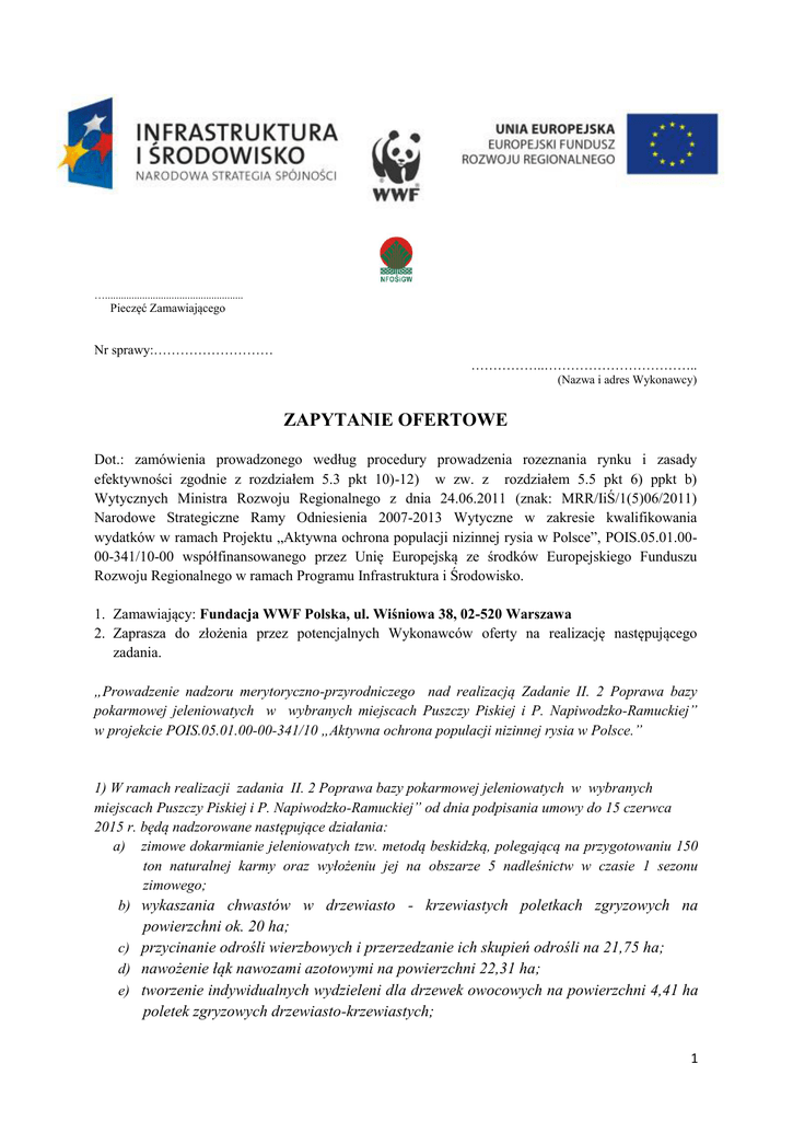….................................................... Pieczęć Zamawiającego Nr sprawy:……………………… ……………..…………………………….. (Nazwa i adres Wykonawcy) ZAPYTANIE OFERTOWE Dot.: zamówienia prowadzonego według procedury prowadzenia rozeznania rynku i zasady efektywności zgodnie z rozdziałem 5.3 pkt 10)-12) w zw. z rozdziałem 5.5 pkt 6) ppkt b) Wytycznych Ministra Rozwoju Regionalnego z dnia 24.06.2011 (znak: MRR/IiŚ/1(5)06/2011) Narodowe Strategiczne Ramy Odniesienia 2007-2013 Wytyczne w zakresie kwalifikowania wydatków w ramach Projektu „Aktywna ochrona populacji nizinnej rysia w Polsce”, POIS.05.01.0000-341/10-00 współfinansowanego przez Unię Europejską ze środków Europejskiego Funduszu Rozwoju Regionalnego w ramach Programu Infrastruktura i Środowisko. 1. Zamawiający: Fundacja WWF Polska, ul. Wiśniowa 38, 02-520 Warszawa 2. Zaprasza do złożenia przez potencjalnych Wykonawców oferty na realizację następującego zadania. „Prowadzenie nadzoru merytoryczno-przyrodniczego nad realizacją Zadanie II. 2 Poprawa bazy pokarmowej jeleniowatych w wybranych miejscach Puszczy Piskiej i P. Napiwodzko-Ramuckiej” w projekcie POIS.05.01.00-00-341/10 „Aktywna ochrona populacji nizinnej rysia w Polsce.” 1) W ramach realizacji zadania II. 2 Poprawa bazy pokarmowej jeleniowatych w wybranych miejscach Puszczy Piskiej i P. Napiwodzko-Ramuckiej” od dnia podpisania umowy do 15 czerwca 2015 r. będą nadzorowane następujące działania: a) zimowe dokarmianie jeleniowatych tzw. metodą beskidzką, polegającą na przygotowaniu 150 ton naturalnej karmy oraz wyłożeniu jej na obszarze 5 nadleśnictw w czasie 1 sezonu zimowego; b) wykaszania chwastów w drzewiasto - krzewiastych poletkach zgryzowych na powierzchni ok. 20 ha; c) przycinanie odrośli wierzbowych i przerzedzanie ich skupień odrośli na 21,75 ha; d) nawożenie łąk nawozami azotowymi na powierzchni 22,31 ha; e) tworzenie indywidualnych wydzieleni dla drzewek owocowych na powierzchni 4,41 ha poletek zgryzowych drzewiasto-krzewiastych; 1 f) wykonanie ok. 380 indywidualnych ogrodzeń drzewek owocowych na powierzchni 4,41 ha poletek zgryzowych drzewiasto-krzewiastych. 2) Nadzór merytoryczno-przyrodniczy będzie polegał na dokonywaniu niezbędnych uzgodnień przed przystąpieniem do prac oraz odbioru prac po ich ukończeniu tj. kontroli wykonania i oceny zgodności z założeniami projektu, zasadami gospodarowania na obszarach leśnych oraz przepisami prawa ochrony środowiska i ochrony przyrody. 3) Na nadzór merytoryczno-przyrodniczy będą się składały: a) przygotowanie i bieżąca aktualizacja harmonogramu prac b) dokonywania bieżących uzgodnień dotyczących miejsc, terminów i sposób ich realizacji z zarządcami terenu tj. z nadleśnictwami Spychowo, Strzałowo, Mrągowo (P. Piska) oraz Jedwabno, Nowe Ramuki (P. Napiwodzko-Ramucka). c) prowadzenie bieżącej kontroli prawidłowości prowadzonych prac w odniesieniu do: - przyjętych zasad wykonania - terminów realizacji - użytego sprzętu - prawidłowości lokalizacji w terenie 3) odbioru wykonanych prac zgodnie z ustalonymi zasadami Opis projektu POIS.05.01.00-00-341/10-00 „Aktywna ochrona populacji nizinnej rysia w Polsce.” znajduje się w załączniku 2 do niniejszego zapytania ofertowego. 3. Termin realizacji zamówienia: od dnia zawarcia umowy do dnia 15 czerwca 2015 r. 4. Kryteria wyboru ofert: cena – 100%. 5. Całkowita kwota umowy zostanie podzielona proporcjonalnie na kwartalne płatności 6. Warunki udziału w postępowaniu o udzielenie zamówienia, które musi spełnić Wykonawca ubiegający się o Zamówienie. Wykonawca musi dysponować ekspertem spełniającym poniższe warunki: 1) Posiadania tytułu zawodowego uprawniającego do wykonywania zawodu odpowiadającego zawodowi leśnika 2) co najmniej 5–letnie doświadczenie w zawodzie leśnika 7. Sposób przygotowania oferty. 1) Ofertę należy sporządzić w języku polskim, w formie pisemnej, na maszynie lub komputerze, nieścieralnym atramentem. 2) Wszystkie dokumenty powinny być złożone w oryginale lub kopii potwierdzonej przez Wykonawcę za zgodność z oryginałem. 3) Wszystkie dokumenty sporządzone w języku obcym, winny być złożone wraz z tłumaczeniem na język polski, poświadczone za zgodność przez Wykonawcę. 4) Oferta powinna zawierać: a) Ofertę sporządzona według formularza oferty (załącznik 1); 2 b) Dokument potwierdzający status Wykonawcy (wypis z KRS lub ewidencji działalności gospodarczej)1; c) CV eksperta, którym dysponuje Wykonawca potwierdzającym spełnianie warunków przez eksperta oraz informację o podstawie dysponowania ekspertem; d) W przypadku gdy ekspert nie jest pracownikiem Wykonawcy oświadczenie eksperta o oddaniu się do dyspozycji Wykonawcy na potrzeby realizacji umowy. 8. Osobą odpowiedzialną merytorycznie za realizację zamówienia jest: Stefan Jakimiuk Kontakt: e-mail: [email protected] tel. kom.: 606-856-777, 9. Ofertę na formularzu oferty należy złożyć w terminie do dnia 24.12.2012, do godziny 12.00:, w jeden z 3 niżej podanych sposobów : 1) w formie pisemnej (osobiście lub listownie) na adres: : Fundacja WWF Polska, ul. Wiśniowa 38, 02-520 Warszawa w sekretariacie Zamawiającego lub 2) poprzez przesłanie faksu na nr fax: + 48 22-646-36-72 3) przez przesłanie skanu na adres e-mail: [email protected] 10. Zamawiający zastrzega sobie możliwość unieważnienia zamówienia bez podania przyczyny. …………………………………………….. Podpis W załączeniu: 1. Formularz oferty 2. Opis projektu . 1 Dotyczy osób fizycznych lub prawnych prowadzących działalność gospodarczą. 3 Załącznik nr 1 do zapytania ofertowego. …............................., dnia …............................ FORMULARZ OFERTY Zamawiający: Fundacja WWF Polska ul. Wiśniowa 38 02-520 Warszawa DANE WYKONAWCY: NAZWA ADRES NUMER TELEFONU NUMER FAXU ADRES E- MAIL 1. Nawiązując do za