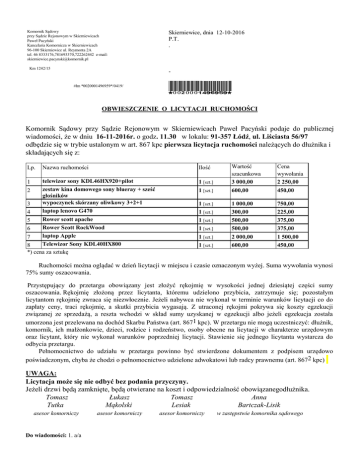 Komornik Sądowy przy Sądzie Rejonowym w Skierniewicach Paweł Pacyński Kancelaria Komornicza w Skierniewicach 96-100 Skierniewice ul. Reymonta 2A tel. 46 8333176,781693370,722262442 e-mail: [email protected] Km 1242/15 Skierniewice, dnia 12-10-2016 P.T. . #łm *0020001496959*/0419/ *0020001496959* OBWIESZCZENIE O LICYTACJI RUCHOMOŚCI Komornik Sądowy przy Sądzie Rejonowym w Skierniewicach Paweł Pacyński podaje do publicznej wiadomości, że w dniu 16-11-2016r. o godz. 11.30 w lokalu: 91-357 Łódź, ul. Liściasta 56/97 odbędzie się w trybie ustalonym w art. 867 kpc pierwsza licytacja ruchomości należących do dłużnika i składających się z: Lp. Nazwa ruchomości 1 [szt.] 1 [szt.] Wartość szacunkowa 3 000,00 600,00 Cena wywołania 2 250,00 450,00 1 [szt.] 1 [szt.] 1 [szt.] 1 [szt.] 1 [szt.] 1 [szt.] 1 000,00 300,00 500,00 500,00 2 000,00 600,00 750,00 225,00 375,00 375,00 1 500,00 450,00 Ilość telewizor sony KDL46HX920+pilot zestaw kina domowego sony blueray + sześć głośników wypoczynek skórzany oliwkowy 3+2+1 3 laptop lenovo G470 4 Rower scott apache 5 Rower Scott RockWood 6 laptop Apple 7 Telewizor Sony KDL40HX800 8 *) cena za sztukę 1 2 Ruchomości można oglądać w dzień licytacji w miejscu i czasie oznaczonym wyżej. Suma wywołania wynosi 75% sumy oszacowania. Przystępujący do przetargu obowiązany jest złożyć rękojmię w wysokości jednej dziesiątej części sumy oszacowania. Rękojmię złożoną przez licytanta, któremu udzielono przybicia, zatrzymuje się; pozostałym licytantom rękojmię zwraca się niezwłocznie. Jeżeli nabywca nie wykonał w terminie warunków licytacji co do zapłaty ceny, traci rękojmię, a skutki przybicia wygasają. Z utraconej rękojmi pokrywa się koszty egzekucji związanej ze sprzedażą, a reszta wchodzi w skład sumy uzyskanej w egzekucji albo jeżeli egzekucja została umorzona jest przelewana na dochód Skarbu Państwa (art. 8671 kpc). W przetargu nie mogą uczestniczyć: dłużnik, komornik, ich małżonkowie, dzieci, rodzice i rodzeństwo, osoby obecne na licytacji w charakterze urzędowym oraz licytant, który nie wykonał warunków poprzedniej licytacji. Stawienie się jednego licytanta wystarcza do odbycia przetargu. Pełnomocnictwo do udziału w przetargu powinno być stwierdzone dokumentem z podpisem urzędowo poświadczonym, chyba że chodzi o pełnomocnictwo udzielone adwokatowi lub radcy prawnemu (art. 8672 kpc) UWAGA: Licytacja może się nie odbyć bez podania przyczyny. Jeżeli drzwi będą zamknięte, będą otwierane na koszt i odpowiedzialność obowiązanegodłużnika. Tomasz Łukasz Tomasz Anna Tutka Mąkolski Lesiak Bartczak-Lisik asesor komorniczy Do wiadomości: 1. a/a asesor komorniczy asesor komorniczy w zastępstwie komornika sądowego