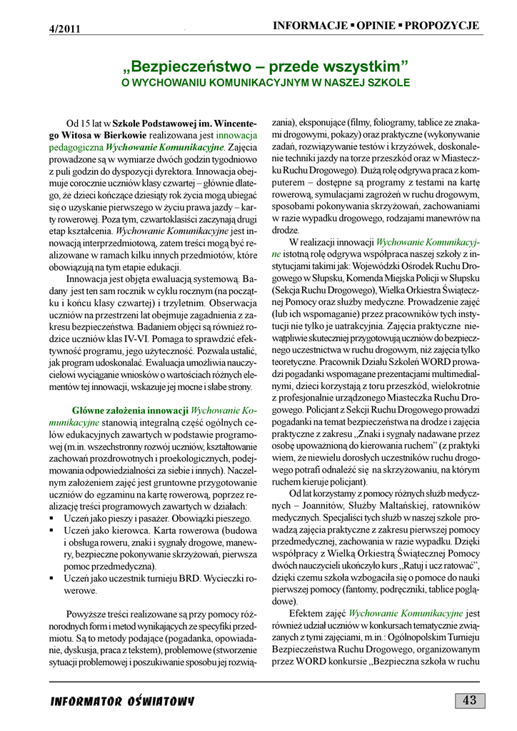 INFORMACJE § OPINIE § PROPOZYCJE 4/2011 Bezpieczeñstwo przede wszystkim O WYCHOWANIU KOMUNIKACYJNYM W NASZEJ SZKOLE Od 15 lat w Szkole Podstawowej im. Wincentego Witosa w Bierkowie realizowana jest innowacja pedagogiczna Wychowanie Komunikacyjne. Zajêcia prowadzone s¹ w wymiarze dwóch godzin tygodniowo z puli godzin do dyspozycji dyrektora. Innowacja obejmuje corocznie uczniów klasy czwartej g³ównie dlatego, ¿e dzieci koñcz¹ce dziesi¹ty rok ¿ycia mog¹ ubiegaæ siê o uzyskanie pierwszego w ¿yciu prawa jazdy karty rowerowej. Poza tym, czwartoklasici zaczynaj¹ drugi etap kszta³cenia. Wychowanie Komunikacyjne jest innowacj¹ interprzedmiotow¹, zatem treci mog¹ byæ realizowane w ramach kilku innych przedmiotów, które obowi¹zuj¹ na tym etapie edukacji. Innowacja jest objêta ewaluacj¹ systemow¹. Badany jest ten sam rocznik w cyklu rocznym (na pocz¹tku i koñcu klasy czwartej) i trzyletnim. Obserwacja uczniów na przestrzeni lat obejmuje zagadnienia z zakresu bezpieczeñstwa. Badaniem objêci s¹ równie¿ rodzice uczniów klas IV-VI. Pomaga to sprawdziæ efektywnoæ programu, jego u¿ytecznoæ. Pozwala ustaliæ, jak program udoskonalaæ. Ewaluacja umo¿liwia nauczycielowi wyci¹ganie wniosków o wartociach ró¿nych elementów tej innowacji, wskazuje jej mocne i s³abe strony. G³ówne za³o¿enia innowacji Wychowanie Komunikacyjne stanowi¹ integraln¹ czêæ ogólnych celów edukacyjnych zawartych w podstawie programowej (m.in. wszechstronny rozwój uczniów, kszta³towanie zachowañ prozdrowotnych i proekologicznych, podejmowania odpowiedzialnoci za siebie i innych). Naczelnym za³o¿eniem zajêæ jest gruntowne przygotowanie uczniów do egzaminu na kartê rowerow¹, poprzez realizacjê treci programowych zawartych w dzia³ach: § Uczeñ jako pieszy i pasa¿er. Obowi¹zki pieszego. § Uczeñ jako kierowca. Karta rowerowa (budowa i obs³uga roweru, znaki i sygna³y drogowe, manewry, bezpieczne pokonywanie skrzy¿owañ, pierwsza pomoc przedmedyczna). § Uczeñ jako uczestnik turnieju BRD. Wycieczki rowerowe. Powy¿sze treci realizowane s¹ przy pomocy ró¿norodnych form i metod wynikaj¹cych ze specyfiki przedmiotu. S¹ to metody podaj¹ce (pogadanka, opowiadanie, dyskusja, praca z tekstem), problemowe (stworzenie sytuacji problemowej i poszukiwanie sposobu jej rozwi¹- INFORMATOR OSWIATOWY zania), eksponuj¹ce (filmy, foliogramy, tablice ze znakami drogowymi, pokazy) oraz praktyczne (wykonywanie zadañ, rozwi¹zywanie testów i krzy¿ówek, doskonalenie techniki jazdy na torze przeszkód oraz w Miasteczku Ruchu Drogowego). Du¿¹ rolê odgrywa praca z komputerem dostêpne s¹ programy z testami na kartê rowerow¹, symulacjami zagro¿eñ w ruchu drogowym, sposobami pokonywania skrzy¿owañ, zachowaniami w razie wypadku drogowego, rodzajami manewrów na drodze. W realizacji innowacji Wychowanie Komunikacyjne istotn¹ rolê odgrywa wspó³praca naszej szko³y z instytucjami takimi jak: Wojewódzki Orodek Ruchu Drogowego w S³upsku, Komenda Miejska Policji w S³upsku (Sekcja Ruchu Drogowego), Wielka Orkiestra wi¹tecznej Pomocy oraz s³u¿by medyczne. Prowadzenie zajêæ (lub ich wspomaganie) przez pracowników tych instytucji nie tylko je uatrakcyjnia. Zajêcia praktyczne niew¹tpliwie skuteczniej przygotowuj¹ uczniów do bezpiecznego uczestnictwa w ruchu drogowym, ni¿ zajêcia tylko teoretyczne. Pracownik Dzia³u Szkoleñ WORD prowadzi pogadanki wspomagane prezentacjami multimedialnymi, dzieci korzystaj¹ z toru przeszkód, wielokrotnie z profesjonalnie urz¹dzonego Miasteczka Ruchu Drogowego. Policjant z Sekcji Ruchu Drogowego prowadzi pogadanki na temat bezpieczeñstwa na drodze i zajêcia praktyczne z zakresu Znaki i sygna³y nadawane przez osobê upowa¿nion¹ do kierowania ruchem (z praktyki wiem, ¿e niewielu doros³ych uczestników ruchu drogowego potrafi odnaleæ siê na skrzy¿owaniu, na którym ruchem kieruje policjant). Od lat korzystamy z pomocy ró¿nych s³u¿b medycznych Joannitów, S³u¿by Maltañskiej, ratowników medycznych. Specjalici tych s³u¿b w naszej szkole prowadz¹ zajêcia praktyczne z zakresu pierwszej pomocy przedmedycznej, zachowania w razie wypadku. Dziêki wspó³pracy z Wielk¹ Orkiestr¹ wi¹tecznej Pomocy dwóch nauczycieli ukoñczy³o kurs Ratuj i ucz ratowaæ, dziêki czemu szko³a wzbogaci³a siê o pomoce do nauki pierwszej pomocy (fantomy, podrêczniki, tablice pogl¹dowe). Efektem zajêæ Wychowanie Komunikacyjne jest równie¿ udzia³ uczniów w konkursach tematycznie zwi¹zanych z tymi zajêciami, m.in.: Ogólnopolskim Turnieju Bezpieczeñstwa Ruchu Drogowego, organizowanym przez WORD konkursie Bezpieczna szko³a w ruchu 43 INFORMACJE § OPINIE § PROPOZYCJE 4/2011 drogowym oraz licznych konkursach plastycznych promuj¹cych bezpieczeñstwo. Dzieci bardzo chêtnie uczestnicz¹ w zajêciach, s¹ zainteresowane treciami, podoba im siê sposób realizacji. Cykl koñczy siê uroczystym wrêczeniem na forum szko³y kart rowerowych. Naczeln¹ zasad¹ Szko³y Podstawowej im. Wincentego Witosa w Bierkowie jest Bezpieczeñstwo przede wszystkim. Realizowana w szerokim zakresie efektywna innowacja Wychowanie Komunikacyjne jest podporz¹dkowana tej zasadzie, stanowi jej sedno i niejako wyró¿nik wyeksponowany symbol. Realizacja treci zwi¹zanych z bezpieczeñstwem w ruchu drogowym zarówno podczas zajêæ Wychowania Komunikacyjnego, jak i w ramach systemu interprzedmiotowego, przynosi efekty: uczniowie s¹ wiadomi zagro¿eñ, potrafi¹ unikaæ sytuacji niebezpiecznych, potrafi¹ zachowaæ siê w razie zaistnienia takich sytuacji i co najwa¿niejsze nie stwarzaj¹ zagro¿enia jako wiadomi uczestnicy ruchu drogowego. PRZYK£ADOWA ANKIETA SKIEROWANA DO RODZICÓW Szanowni Pañstwo! Chcemy poznaæ opiniê Pañstwa dotycz¹c¹ realizacji w naszej szkole innowacji pedagogicznej Wychowanie Komunikacyjne. 1. Czy znany jest Pani/Panu program Wychowania Komunikacyjnego? * tak * nie 2. Czy uwa¿a Pani/Pan, ¿e proponowane treci s¹ trafne i