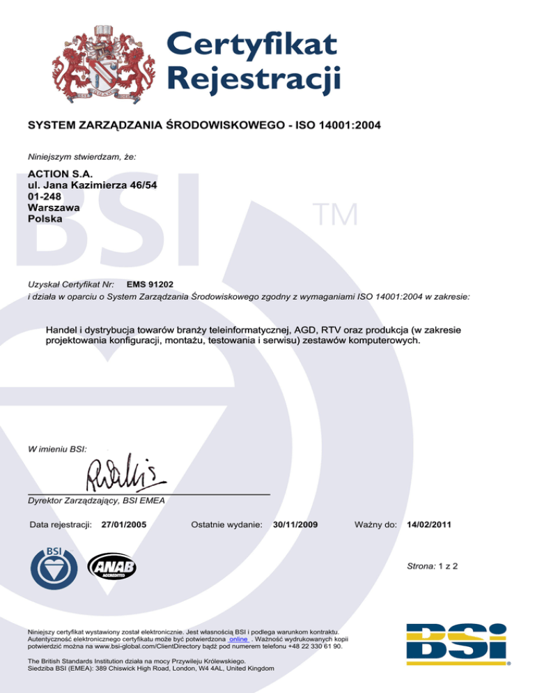 SYSTEM ZARZĄDZANIA ŚRODOWISKOWEGO - ISO 14001:2004 Niniejszym stwierdzam, że: ACTION S.A. ul. Jana Kazimierza 46/54 01-248 Warszawa Polska Uzyskał Certyfikat Nr: EMS 91202 i działa w oparciu o System Zarządzania Środowiskowego zgodny z wymaganiami ISO 14001:2004 w zakresie: Handel i dystrybucja towarów branży teleinformatycznej, AGD, RTV oraz produkcja (w zakresie projektowania konfiguracji, montażu, testowania i serwisu) zestawów komputerowych. W imieniu BSI: Dyrektor Zarządzający, BSI EMEA Data rejestracji: 27/01/2005 Ostatnie wydanie: 30/11/2009 Ważny do: 14/02/2011 Strona: 1 z 2 Niniejszy certyfikat wystawiony został elektronicznie. Jest własnością BSI i podlega warunkom kontraktu. Autentyczność elektronicznego certyfikatu może być potwierdzona online . Ważność wydrukowanych kopii potwierdzić można na www.bsi-global.com/ClientDirectory bądź pod numerem telefonu +48 22 330 61 90. The British Standards Institution działa na mocy Przywileju Królewskiego. Siedziba BSI (EMEA): 389 Chiswick High Road, London, W4 4AL, United Kingdom Certyfikat Nr: EMS 91202 Lokalizacja Działania objęte certyfikacją ACTION S.A. ul. Jana Kazimierza 46/54 Warszawa 01-248 Polska Handel i dystrybucja towarów branży teleinformatycznej, AGD, RTV oraz produkcja (w zakresie projektowania konfiguracji, montażu, testowania i serwisu) zestawów komputerowych. ACTION S.A. Zamienie ul. Dawidowska 10 Warszawa 02-800 Polska Handel i dystrybucja towarów branży teleinformatycznej, AGD, RTV oraz produkcja (w zakresie projektowania konfiguracji, montażu, testowania i serwisu) zestawów komputerowych. Data rejestracji: 27/01/2005 Ostatnie wydanie: 30/11/2009 Ważny do: 14/02/2011 Strona 2 z 2 Niniejszy certyfikat wystawiony został elektronicznie. Jest własnością BSI i podlega warunkom kontraktu. Autentyczność elektronicznego certyfikatu może być potwierdzona online . Ważność wydrukowanych kopii potwierdzić można na www.bsi-global.com/ClientDirectory bądź pod numerem telefonu +48 22 330 61 90. The British Standards Institution działa na mocy Przywileju Królewskiego. Siedziba BSI (EMEA): 389 Chiswick High Road, London, W4 4AL, United Kingdom