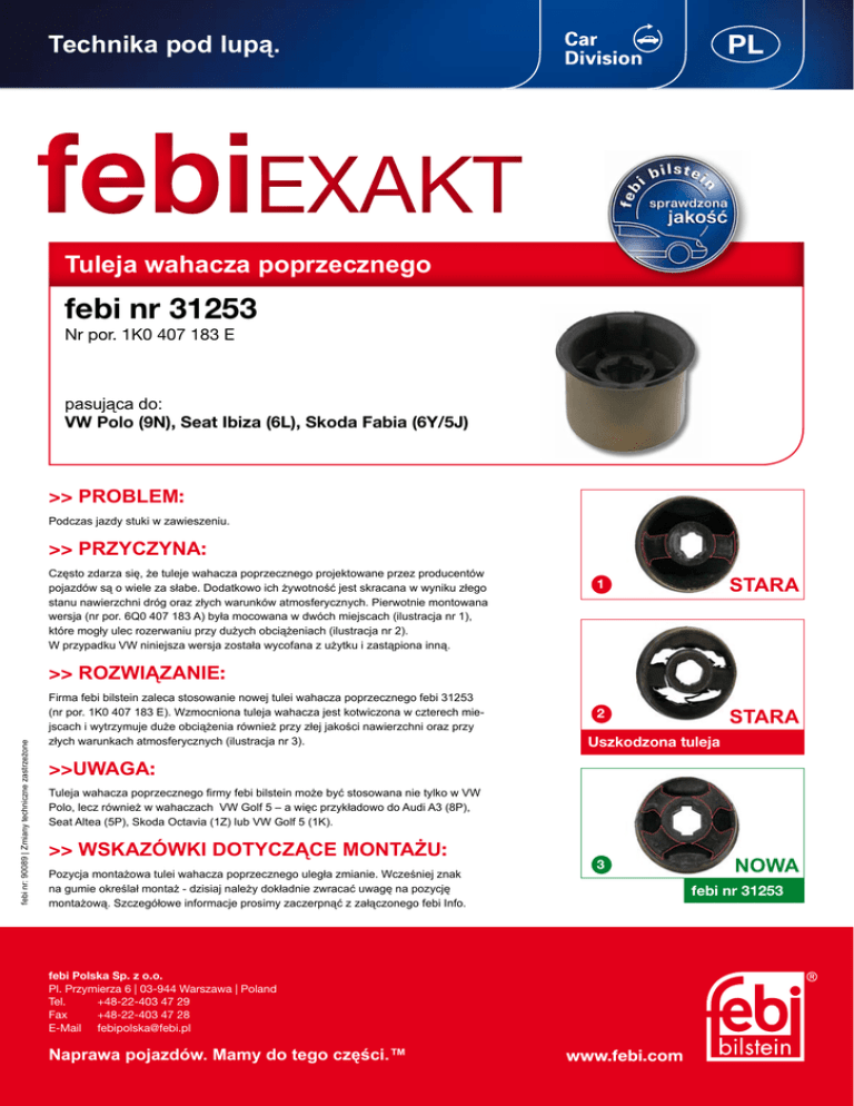 PL Technika pod lupą. febiEXAKT Tuleja wahacza poprzecznego febi nr 31253 Nr por. 1K0 407 183 E pasująca do: VW Polo (9N), Seat Ibiza (6L), Skoda Fabia (6Y/5J) >> PROBLEM: Podczas jazdy stuki w zawieszeniu. >> PRZYCZYNA: Często zdarza się, że tuleje wahacza poprzecznego projektowane przez producentów pojazdów są o wiele za słabe. Dodatkowo ich żywotność jest skracana w wyniku złego stanu nawierzchni dróg oraz złych warunków atmosferycznych. Pierwotnie montowana wersja (nr por. 6Q0 407 183 A) była mocowana w dwóch miejscach (ilustracja nr 1), które mogły ulec rozerwaniu przy dużych obciążeniach (ilustracja nr 2). W przypadku VW niniejsza wersja została wycofana z użytku i zastąpiona inną. 1 STARA 2 STARA febi nr: 90089 | Zmiany techniczne zastrzeżone >> ROZWIĄZANIE: Firma febi bilstein zaleca stosowanie nowej tulei wahacza poprzecznego febi 31253 (nr por. 1K0 407 183 E). Wzmocniona tuleja wahacza jest kotwiczona w czterech miejscach i wytrzymuje duże obciążenia również przy złej jakości nawierzchni oraz przy złych warunkach atmosferycznych (ilustracja nr 3). Uszkodzona tuleja >>UWAGA: Tuleja wahacza poprzecznego firmy febi bilstein może być stosowana nie tylko w VW Polo, lecz również w wahaczach VW Golf 5 – a więc przykładowo do Audi A3 (8P), Seat Altea (5P), Skoda Octavia (1Z) lub VW Golf 5 (1K). >> WSKAZÓWKI DOTYCZĄCE MONTAŻU: Pozycja montażowa tulei wahacza poprzecznego uległa zmianie. Wcześniej znak na gumie określał montaż - dzisiaj należy dokładnie zwracać uwagę na pozycję montażową. Szczegółowe informacje prosimy zaczerpnąć z załączonego febi Info. febi Polska Sp. z o.o. Pl. Przymierza 6 | 03-944 Warszawa | Poland Tel. +48-22-403 47 29 Fax +48-22-403 47 28 [email protected] Naprawa pojazdów. Mamy do tego części.™ 3 NOWA febi nr 31253