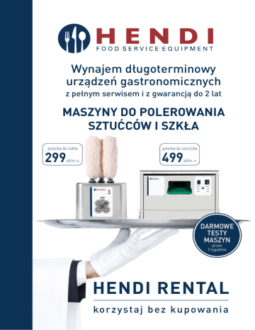 Wynajem długoterminowy urządzeń gastronomicznych z pełnym serwisem i z gwarancją do 2 lat MASZYNY DO POLEROWANIA SZTUĆCÓW I SZKŁA polerka do szkła 299 zł/m-c polerka do sztućców 499 zł/m-c DARMOWE TESTY MASZYN przez 2 tygodnie HENDI RENTAL ko r z ysta j b e z k u p o w a n i a HENDI RENTAL ko r z ysta j b e z k u p o w a n i a wybierasz produkt maszyna do polerowania sztućców 231517 testujesz 2 tygodnie gratis wynajmujesz urządzenie na 24 miesiące wymieniasz na nowy model lub kupujesz korzystasz z urządzenia przez 14 dni i decydujesz czy chcesz je oddać czy zostawić zapewniamy dostawę, montaż, szkolenie z obsługi, naprawy po zakończeniu umowy kontynuujesz wynajem na preferencyjnych warunkach maszyna do polerowania szkła 231524 Jeśli Twój personel wciąż ręcznie poleruje sztućce i kieliszki CZAS NA ZMIANY Dzięki naszym urządzeniom możesz zaoszczędzić nawet 10 000 zł rocznie. • Wynajem maszyn do polerowania wraz z pełną obsługą serwisową to najlepszy sposób na korzystanie ze specjalistycznych urządzeń. • Gwarantujemy całkowity spokój ducha. • Nie wymagamy depozytu. • Umożliwiamy korzystanie z maszyn do polerowania tak długo jak to jest potrzebne. • Dbamy o serwis urządzeń oraz o szybką dostawę części zamiennych. • Zorganizujemy szkolenie Twojego personelu w zakresie obsługi, która jest bardzo prosta i nie wymaga specjalnych umiejętności. • Umożliwiamy zwrot urządzeń, przedłużenie umowy lub wykupienie maszyny na własność w atrakcyjnej cenie. • Sam decydujesz czego potrzebuje Twoja firma. • Pełen komfort i bezpieczeństwo. Dzięki naszym maszynom do polerowania zyskujesz Czynsz wynajmu za 1 szt./1 m-c zawiera: • • • • • • • • maszynę do polerowania • obsługę serwisową*: – naprawy i części zamienne – pełne czyszczenie maszyny co 6 miesięcy przez autoryzowany serwis (dotyczy modelu 231517) • szkolenia: – startowe po dostawie maszyny – cykliczne dla nowego personelu • szczotki startowe dla modelu 231524 Wysoki poziom higieny Wysoki połysk naczyń Brak zacieków wodnych na kieliszkach i sztućcach Redukcję kosztów pracy Oszczędność czasu i pieniędzy Minimalizację kosztów pralni Zmniejszenie ilości stłuczonego szkła * z wyłączeniem wymiany szczotek w trakcie umowy (dotyczy modelu 231524) DARMOWE TESTY MASZYN 2 tygodnie gratis 231524 231517 MASZYNA DO POLEROWANIA SZKŁA MASZYNA DO POLEROWANIA SZTUĆCÓW – Do perfekcyjnego polerowania i suszenia umytego szkła – Dla każdego rodzaju szkła ø50-80 mm i kielicha max. H=180 mm – Znaczna oszczędność czasu barmanów – 5 obrotowych i podgrzewanych miękkich szczotek suszących – Usuwa pozostałości wody a także czyszczących środków chemicznych – Waga: 15,5 kg – Do suszenia sztućców srebrnych oraz stalowych i usuwania z nich śladów po wodzie – Oszczędza do 90% czas personelu lokalu gastronomicznego – Czynnik suszący: ekologiczny granulat roślinny – Nie usuwa zarysowań mechanicznych – Maksymalna długość sztućca 250 mm – Ilość granulatu 2,5 kg – Waga: 45 kg kod wydajność (szt./h) mm V W cena kod 231524 do 350 325x300x(H)500 230 1650 8999,- 231517 975909 maszyna do polerowania szkła 231524 okres wynajmu cena wynajmu cena wykupu 24 m-cy 299 PLN 4999 PLN * Wykup nie jest obligatoryjny, można zwrócić maszynę po okresie wynajmu wydajność (szt./h) mm V W do 3000 570x510x(H)380 230 570 granulat do polerek, ekologiczny – worek 3 kg maszyna do polerowania sztućców 231517 cena 15999,79,- okres wynajmu cena wynajmu cena wykupu 24 m-cy 499 PLN 7999 PLN * Wykup nie jest obligatoryjny, można zwrócić maszynę po okresie wynajmu Jeśli Twoi pracownicy poświęcają więcej niż 1 godzinę dziennie na polerowanie szkła czy sztućców to oznacza, że potrzebujesz maszyny do polerowania – oszczędzisz czas i pieniądze Kalkulator oszczędności* Kalkulator oszczędności* Średnia ilość nakryć / 1 tydzień 1 000 Średnia ilość nakryć / 1 tydzień 1 000 Średnia ilość szkła / 1 osobę 2 szt. Średnia ilość sztućców / 1 osobę 5 szt. Ilość szkła / 1 tydzień Ilość godzin poświęcona przez personel na polerowanie / 1 tydzień (przy założeniu 200 szt./h) Koszty polerowania przez personel / 1 tydzień (przy założeniu średniej płacy za 1 h = 17 zł Oszczędność / 1 miesiąc Oszczędność / 1 rok * szacunkowe wartości do cen należy doliczyć VAT 23% 2 000 szt. 10 h 170 zł 680 zł 8 160 zł Ilość sztućców / 1 tydzień 5 000 szt. Ilość godzin poświęcona przez personel na polerowanie / 1 tydzień (przy założeniu 400 szt./h) 12,5 h Koszty polerowania przez personel / 1 tydzień (przy założeniu średniej płacy za 1 h = 17 zł 213 zł Oszczędność / 1 miesiąc Oszczędność / 1 rok 850 zł 10 200 zł Korzyści z wynajmu maszyn do polerowania • Oferta all inclusive – urządzenie, serwis, szkolenie – nic Cię nie interesuje • Elastyczna umowa – darmowe testy – 14 dni gratis • Stałe miesięczne koszty – niższe wydatki na wynajem niż koszty pracy pracowników – okres umowy – 2 lata • możliwość przedłużenia wynajmu • Wysoki poziom obsługi klientów – większa koncentracja personelu na obsłudze procentuje wzrostem sprzedaży napojów • możliwość wypowiedzenia umowy w dowolnym momencie z zachowaniem 3-miesięcznego okresu wypowiedzenia i deserów, zyskujemy większą liczbę zadowolonych klientów – korzystanie z urządzenia tak długo jak jest ono potrzebne • Bieżący dostęp do pełnej zastawy – wymagany zakup mniej- • Ubezpieczenie wynajmowanych maszyn w ramach polisy szej ilości sztućców „All Risk” • Wynajem maszyny do polerowania można całkowicie odpisać od podatku Dział Wynajmu Długoterminowego tel. kom.: +48 530 076 371 tel. kom.: +48 884 733 804 tel.: +48 61 658 70 00 tel.: +48 61 658 70 50 e-mail: [email protected] HENDI Rental Sp. z o.o. Sp. k ul. Magazynowa 5 62-023 Gądki w