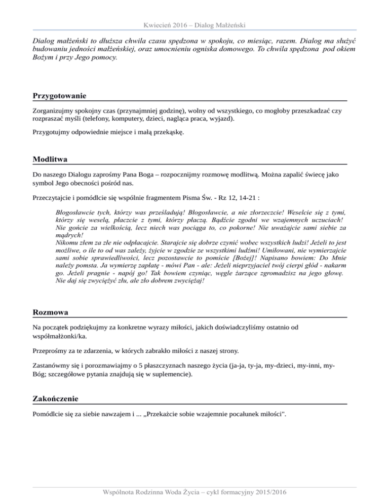Kwiecień 2016 – Dialog Małżeński Dialog małżeński to dłuższa chwila czasu spędzona w spokoju, co miesiąc, razem. Dialog ma służyć budowaniu jedności małżeńskiej, oraz umocnieniu ogniska domowego. To chwila spędzona pod okiem Bożym i przy Jego pomocy. Przygotowanie Zorganizujmy spokojny czas (przynajmniej godzinę), wolny od wszystkiego, co mogłoby przeszkadzać czy rozpraszać myśli (telefony, komputery, dzieci, nagląca praca, wyjazd). Przygotujmy odpowiednie miejsce i małą przekąskę. Modlitwa Do naszego Dialogu zaprośmy Pana Boga – rozpocznijmy rozmowę modlitwą. Można zapalić świecę jako symbol Jego obecności pośród nas. Przeczytajcie i pomódlcie się wspólnie fragmentem Pisma Św. - Rz 12, 14-21 : Błogosławcie tych, którzy was prześladują! Błogosławcie, a nie złorzeczcie! Weselcie się z tymi, którzy się weselą, płaczcie z tymi, którzy płaczą. Bądźcie zgodni we wzajemnych uczuciach! Nie gońcie za wielkością, lecz niech was pociąga to, co pokorne! Nie uważajcie sami siebie za mądrych! Nikomu złem za złe nie odpłacajcie. Starajcie się dobrze czynić wobec wszystkich ludzi! Jeżeli to jest możliwe, o ile to od was zależy, żyjcie w zgodzie ze wszystkimi ludźmi! Umiłowani, nie wymierzajcie sami sobie sprawiedliwości, lecz pozostawcie to pomście [Bożej]! Napisano bowiem: Do Mnie należy pomsta. Ja wymierzę zapłatę - mówi Pan - ale: Jeżeli nieprzyjaciel twój cierpi głód - nakarm go. Jeżeli pragnie - napój go! Tak bowiem czyniąc, węgle żarzące zgromadzisz na jego głowę. Nie daj się zwyciężyć złu, ale zło dobrem zwyciężaj! Rozmowa Na początek podziękujmy za konkretne wyrazy miłości, jakich doświadczyliśmy ostatnio od współmałżonki/ka. Przeprośmy za te zdarzenia, w których zabrakło miłości z naszej strony. Zastanówmy się i porozmawiajmy o 5 płaszczyznach naszego życia (ja-ja, ty-ja, my-dzieci, my-inni, myBóg; szczegółowe pytania znajdują się w suplemencie). Zakończenie Pomódlcie się za siebie nawzajem i ... „Przekażcie sobie wzajemnie pocałunek miłości". Wspólnota Rodzinna Woda Życia – cykl formacyjny 2015/2016