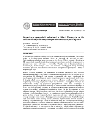 Archives of Waste Management Archiwum Gospodarki Odpadami and Environmental Protection http://ago.helion.pl ISSN 1733-4381, Vol. 8 (2008), p-1-12 Organizacja gospodarki odpadami w Siłach Zbrojnych na tle zmian militarnych i nowych wyzwań stawianych polskiej armii Borucka A.1, Mikosz B.2 1 ul. Domańskiego 82/6, 45-850 Opole 2 ul Rzebiszyn 31, 46-282 Lasowice Wielkie e-mail: [email protected] Streszczenie Wśród wielu wartości decydujących o bycie narodowym, dwie są nadrzędne. Pierwsza to troska o bezpieczeństwo państwa, druga to szacunek do ojczystej przyrody. Najważniejszym zadaniem, jakim obarczone są siły zbrojne RP jest - zgodnie z Konstytucją RP -zapewnienie niepodległości, nienaruszalności terytorialnej, wolności, bezpieczeństwa, poszanowania praw człowieka i obywatela. Wynika ono z fundamentalnych i niezmiennych, kształtowanych przez lata wartości, określających naszą narodową tożsamość, poczucie przynależności i konieczność pielęgnowania patriotyzmu i dumy w niepodległym kraju. Równie ważnym aspektem jest zachowanie dziedzictwa narodowego oraz ochrona środowiska naturalnego w warunkach zrównoważonego rozwoju. I chociaż podstawowym obowiązkiem Sił Zbrojnych jest obrona suwerenności, nie ulega wątpliwości, że zapobiegając wojnie zapobiega się między innymi ogromnemu zagrożeniu dla środowiska. Z drugiej jednak strony przygotowania obronne, szkolenie wojsk, produkcja sprzętu wojskowego wywierają negatywny wpływ na środowisko. Niewątpliwie trudnym do zrealizowania wydaje się pogodzenie priorytetowych zadań armii związanych z permanentnym przygotowywaniem żołnierzy do realizacji zadań w warunkach bojowych z troską o ochronę przyrody. Wymaga to nieustannego kompromisu pomiędzy wymogami ochrony środowiska a szkoleniem i działalnością wojska tak, by nie ucierpiały na tym zdolności obronne Polski i nie ulega wątpliwości fakt, że o wiele łatwiej realizować zadania związane z ekologią podczas ćwiczeń - w warunkach poczucia bezpieczeństwa i spokoju a gorzej podczas sytuacji wojennych, kiedy zagrożone jest życie i zdrowie żołnierza. A sytuacji takich jest coraz więcej i obejmują coraz szersze kręgi żołnierzy Wojska Polskiego stąd konieczność coraz szerszej analizy problemu, wprowadzania nowych założeń i realizacji nowych technologii. Szkody w środowisku mogą być nierozłączną konsekwencją prowadzonych operacji, jednakże planowanie ochrony środowiska powinno minimalizować tego rodzaju zjawiska bez obniżania wymagań związanych z daną operacją lub szkoleniem. Przyjąć niestety należy że aspekty operacyjne są nadrzędne i jedynie odpowiednio wczesne określenie potencjalnych zagrożeń i rozważenie wszystkich aspektów ochrony środowiska 2 Archiwum Gospodarki Odpadami i Ochrony Środowiska, vol. 8 (2008) może umożliwić wypracowanie działania uwzględniającego wszystkie konsekwencje ekologiczne planowanego działania. Abstract Organisation of waste management in the armed forces against the background of military changes and new challenges in the Polish Army There are two major factors among various elements determining the national existence. The first one is the care for national security, and the second one is respect for the environment. The main task among the Armed Force’s responsibilities are-according to the Polish Constitution- provision of independence, inviolability of territory, freedom, safety, and sanctity of human and citizen rights. It derives from the fundamental and stable values which were shaped over the years. Those values determine national identity, feeling of affiliation, and the necessity of looking after patriotic values and national pride in a sovereign country. Preserving national heritage and environment protection in the state of stable development are another aspects of equal importance. Although, the main purpose of the armed forces is to defend the country’s sovereignty, it is without a doubt, that while preventing war, the environment is also protected. On the other hand defensive preparations, army training, and production of military equipment have negative impact on the environment. It is undoubtedly difficult to combine the priorities of the Army connected with the preparation of soldiers for the combat tasks, with environmental protection. It requires constant compromise between the requirements of environmental protection and military activities, including military training, so that the defensive capabilities of the country would not deteriorate, and it is beyond a doubt that it is much easier to fulfill tasks regarding ecology during a peaceful period, than while the life of soldiers is endangered. There are more and more such situations, and they are embracing wider circles of the Polish Army, that is why a deeper analysis of the problem is required. There should be new guidelines and new technological assumptions made. Although damage in the environment may be an inevitable consequence of the conducted operations, planning of the environmental protection should minimize such occurrences without decreasing requirements connected with a given operation, or training. Superiority of operational aspects has to be assumed, and only early detection of potential threats, and analysis of all aspects may enable working out actions embracing all ecological consequences of the planned operations. 1. Wstęp Działalność sił zbrojnych, do niedawna utożsamiana była wyłącznie z realizacją trzech zasadniczych przedsięwzięć: strzeżeniem granic, obroną suwerenności państwa oraz związanym z tym szkoleniem żołnierzy. Wszystkie te zadania stawiane były na pierwszym miejscu, w związku z tym pojęcia z dziedziny ekologii, jak też wiele innych zagadnień związanych z ochroną środowiska traktowane były w kręgach żołnierskich z niechęcią a wręcz po macoszemu. Taki stan utrzymywał się przez długi okres czasu zarówno Archiwum G