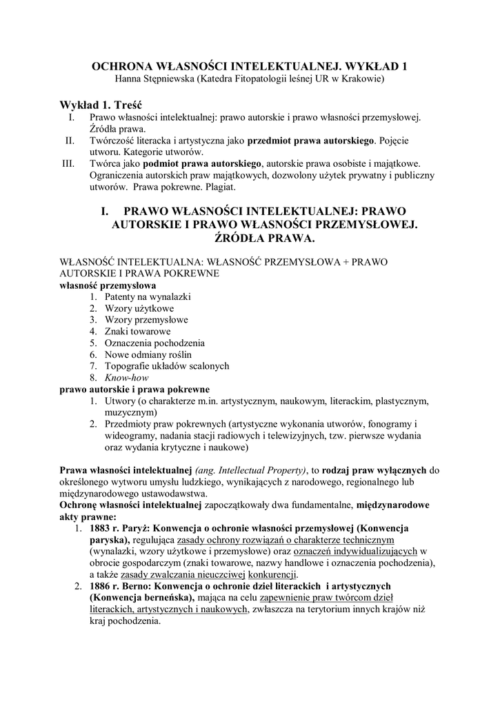 OCHRONA WŁASNOŚCI INTELEKTUALNEJ. WYKŁAD 1 Hanna Stępniewska (Katedra Fitopatologii leśnej UR w Krakowie) Wykład 1. Treść I. II. III. Prawo własności intelektualnej: prawo autorskie i prawo własności przemysłowej. Źródła prawa. Twórczość literacka i artystyczna jako przedmiot prawa autorskiego. Pojęcie utworu. Kategorie utworów. Twórca jako podmiot prawa autorskiego, autorskie prawa osobiste i majątkowe. Ograniczenia autorskich praw majątkowych, dozwolony użytek prywatny i publiczny utworów. Prawa pokrewne. Plagiat. I. PRAWO WŁASNOŚCI INTELEKTUALNEJ: PRAWO AUTORSKIE I PRAWO WŁASNOŚCI PRZEMYSŁOWEJ. ŹRÓDŁA PRAWA. WŁASNOŚĆ INTELEKTUALNA: WŁASNOŚĆ PRZEMYSŁOWA + PRAWO AUTORSKIE I PRAWA POKREWNE własność przemysłowa 1. Patenty na wynalazki 2. Wzory użytkowe 3. Wzory przemysłowe 4. Znaki towarowe 5. Oznaczenia pochodzenia 6. Nowe odmiany roślin 7. Topografie układów scalonych 8. Know-how prawo autorskie i prawa pokrewne 1. Utwory (o charakterze m.in. artystycznym, naukowym, literackim, plastycznym, muzycznym) 2. Przedmioty praw pokrewnych (artystyczne wykonania utworów, fonogramy i wideogramy, nadania stacji radiowych i telewizyjnych, tzw. pierwsze wydania oraz wydania krytyczne i naukowe) Prawa własności intelektualnej (ang. Intellectual Property), to rodzaj praw wyłącznych do określonego wytworu umysłu ludzkiego, wynikających z narodowego, regionalnego lub międzynarodowego ustawodawstwa. Ochronę własności intelektualnej zapoczątkowały dwa fundamentalne, międzynarodowe akty prawne: 1. 1883 r. Paryż: Konwencja o ochronie własności przemysłowej (Konwencja paryska), regulująca zasady ochrony rozwiązań o charakterze technicznym (wynalazki, wzory użytkowe i przemysłowe) oraz oznaczeń indywidualizujących w obrocie gospodarczym (znaki towarowe, nazwy handlowe i oznaczenia pochodzenia), a także zasady zwalczania nieuczciwej konkurencji. 2. 1886 r. Berno: Konwencja o ochronie dzieł literackich i artystycznych (Konwencja berneńska), mająca na celu zapewnienie praw twórcom dzieł literackich, artystycznych i naukowych, zwłaszcza na terytorium innych krajów niż kraj pochodzenia. USTAWODAWSTWO MIĘDZYNARODOWE DOTYCZĄCE WŁASNOŚCI PRZEMYSŁOWEJ 1. 1967 r. Sztokholm: Konwencja o ustanowieniu Światowej Organizacji Własności Intelektualnej [WIPO] (tzw. Konwencja sztokholmska, połączenie dwu poprzednich konwencji). Cel: tworzenie zrównoważonego, światowego systemu ochrony własności intelektualnej. 2. 1970 r. Układ Waszyngtoński o współpracy patentowej (tryb PCT Patent Cooperation Treaty). 3. 1994 r. Marakesz: Porozumienie TRIPS (w sprawie Handlowych Aspektów Praw Własności Intelektualnej), załącznik do porozumienia ustanawiającego Światową Organizację Handlu [WTO]. 4. 1891 r. Porozumienie madryckie (rewidowane) dotyczące międzynarodowego rejestrowania znaków towarowych. 5. 1989 r. Protokół madrycki w sprawie rejestrowania znaków towarowych. USTAWODAWSTWO REGIONALNE DOTYCZĄCE WŁASNOŚCI PRZEMYSŁOWEJ 1. 1973 r. Monachium: Konwencja o udzielaniu patentów europejskich. 2. Rozporządzenia i dyrektywy Parlamentu Europejskiego i Rady USTAWODAWSTWO MIĘDZYNARODOWE DOTYCZĄCE PRAWA AUTORSKIEGO I PRAW POKREWNYCH 1. 1961 r. Rzym: Międzynarodowa konwencja o ochronie praw artystów wykonawców, producentów fonogramów oraz organizacji nadawczych (Konwencja rzymska). 2. 1996 r. Genewa: Traktat Światowej Organizacji Własności Intelektualnej [WIPO] o prawie autorskim. 3. 1996 r. Genewa: Traktat Światowej Organizacji Własności Intelektualnej [WIPO] o artystycznych wykonaniach i fonogramach. USTAWODAWSTWO REGIONALNE DOTYCZĄCE PRAWA AUTORSKIEGO I PRAW POKREWNYCH 1. Rozporządzenia i dyrektywy Parlamentu Europejskiego i Rady USTAWODAWSTWO KRAJOWE 1. Ustawa z dnia 4 lutego 1994 r. o prawie autorskim i prawach pokrewnych (Dz. U. 1994 Nr 24 poz. 83 z późn. zm.) 2. Ustawa z dnia 30 czerwca 2000 r. Prawo własności przemysłowej (Dz. U. 2001 Nr 49 poz. 508 z późn. zm.) 3. Ustawa z dnia 16 kwietnia 1993 r. o zwalczaniu nieuczciwej konkurencji (Dz. U. z 2003 r. Nr 153 poz. 1503 z późn. zm.) URZĘDY DS. WŁASNOŚCI INTELEKTUALNEJ międzynarodowe Biuro Międzynarodowe Światowej Organizacji Własności Intelektualnej [World Intellectual Property Organization WIPO] Genewa, Szwajcaria regionalne (w Europie) Europejski Urząd Patentowy [European Patent Office EPO] Monachium, Niemcy Urząd Harmonizacji Rynku Wewnętrznego [Office for Harmonization in the Internal Market OHIM] Alicante, Hiszpania krajowe Urząd Patentowy RP, Warszawa II. TWÓRCZOŚĆ LITERACKA I ARTYSTYCZNA JAKO PRZEDMIOT PRAWA AUTORSKIEGO. POJĘCIE UTWORU. KATEGORIE UTWORÓW. POJĘCIE UTWORU: Przedmiotem prawa autorskiego jest każdy przejaw działalności twórczej o indywidualnym charakterze, ustalony w jakiejkolwiek postaci, niezależnie od wartości, przeznaczenia i sposobu wyrażenia (utwór) [art. 1 pr.aut.] Przesłanki utworu: jest rezultatem działalności twórczej ma indywidualny charakter został ustalony KATEGORIE UTWORÓW: art. 1 ust. 2 pr.aut. (katalog otwarty, przykłady utworów) (…) literackie, publicystyczne, naukowe, kartograficzne, programy komputerowe plastyczne fotograficzne lutnicze wzornictwa przemysłowego, architektoniczne, architektoniczno-urbanistyczne i urbanistyczne muzyczne i słowno-muzyczne sceniczne, sceniczno-muzyczne, choreograficzne i pantonimiczne audiowizualne (w tym filmowe) Kategorie utworów z zakresu edukacji, nauki i dydaktyki artykuły naukowe i popularno-naukowe, podręczniki, skrypty, opracowania monograficzne recenzje naukowe (np. artykułów, prac magisterskich, prac doktorskich) prace dyplomowe (licencjackie, magisterskie, inżynierskie) wykłady akademickie strony www utwory zależne (tłumaczenia, przeróbki, adaptacje) WYŁĄCZENIA. Przedmiotami prawa autorskiego nie są (art. 4 pr.aut.): akty normatywne lub ich urzędowe projekty urzędowe dokumenty, materiały, znaki i symbole opublikowan