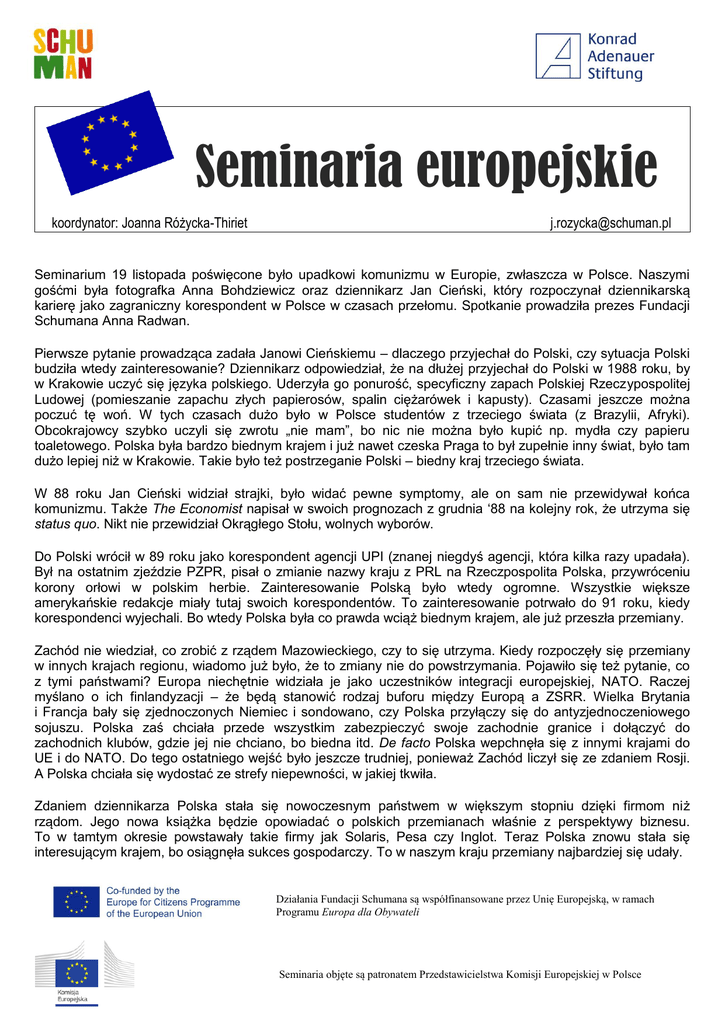 Seminaria europejskie koordynator: Joanna Różycka-Thiriet [email protected] Seminarium 19 listopada poświęcone było upadkowi komunizmu w Europie, zwłaszcza w Polsce. Naszymi gośćmi była fotografka Anna Bohdziewicz oraz dziennikarz Jan Cieński, który rozpoczynał dziennikarską karierę jako zagraniczny korespondent w Polsce w czasach przełomu. Spotkanie prowadziła prezes Fundacji Schumana Anna Radwan. Pierwsze pytanie prowadząca zadała Janowi Cieńskiemu – dlaczego przyjechał do Polski, czy sytuacja Polski budziła wtedy zainteresowanie? Dziennikarz odpowiedział, że na dłużej przyjechał do Polski w 1988 roku, by w Krakowie uczyć się języka polskiego. Uderzyła go ponurość, specyficzny zapach Polskiej Rzeczypospolitej Ludowej (pomieszanie zapachu złych papierosów, spalin ciężarówek i kapusty). Czasami jeszcze można poczuć tę woń. W tych czasach dużo było w Polsce studentów z trzeciego świata (z Brazylii, Afryki). Obcokrajowcy szybko uczyli się zwrotu „nie mam”, bo nic nie można było kupić np. mydła czy papieru toaletowego. Polska była bardzo biednym krajem i już nawet czeska Praga to był zupełnie inny świat, było tam dużo lepiej niż w Krakowie. Takie było też postrzeganie Polski – biedny kraj trzeciego świata. W 88 roku Jan Cieński widział strajki, było widać pewne symptomy, ale on sam nie przewidywał końca komunizmu. Także The Economist napisał w swoich prognozach z grudnia ‘88 na kolejny rok, że utrzyma się status quo. Nikt nie przewidział Okrągłego Stołu, wolnych wyborów. Do Polski wrócił w 89 roku jako korespondent agencji UPI (znanej niegdyś agencji, która kilka razy upadała). Był na ostatnim zjeździe PZPR, pisał o zmianie nazwy kraju z PRL na Rzeczpospolita Polska, przywróceniu korony orłowi w polskim herbie. Zainteresowanie Polską było wtedy ogromne. Wszystkie większe amerykańskie redakcje miały tutaj swoich korespondentów. To zainteresowanie potrwało do 91 roku, kiedy korespondenci wyjechali. Bo wtedy Polska była co prawda wciąż biednym krajem, ale już przeszła przemiany. Zachód nie wiedział, co zrobić z rządem Mazowieckiego, czy to się utrzyma. Kiedy rozpoczęły się przemiany w innych krajach regionu, wiadomo już było, że to zmiany nie do powstrzymania. Pojawiło się też pytanie, co z tymi państwami? Europa niechętnie widziała je jako uczestników integracji europejskiej, NATO. Raczej myślano o ich finlandyzacji – że będą stanowić rodzaj buforu między Europą a ZSRR. Wielka Brytania i Francja bały się zjednoczonych Niemiec i sondowano, czy Polska przyłączy się do antyzjednoczeniowego sojuszu. Polska zaś chciała przede wszystkim zabezpieczyć swoje zachodnie granice i dołączyć do zachodnich klubów, gdzie jej nie chciano, bo biedna itd. De facto Polska wepchnęła się z innymi krajami do UE i do NATO. Do tego ostatniego wejść było jeszcze trudniej, ponieważ Zachód liczył się ze zdaniem Rosji. A Polska chciała się wydostać ze strefy niepewności, w jakiej tkwiła. Zdaniem dziennikarza Polska stała się nowoczesnym państwem w większym stopniu dzięki firmom niż rządom. Jego nowa książka będzie opowiadać o polskich przemianach właśnie z perspektywy biznesu. To w tamtym okresie powstawały takie firmy jak Solaris, Pesa czy Inglot. Teraz Polska znowu stała się interesującym krajem, bo osiągnęła sukces gospodarczy. To w naszym kraju przemiany najbardziej się udały. Działania Fundacji Schumana są współfinansowane przez Unię Europejską, w ramach Programu Europa dla Obywateli Seminaria objęte są patronatem Przedstawicielstwa Komisji Europejskiej w Polsce Następnie Anna Bohdziewicz zaprezentowała swoje zdjęcia. Pochodzą one z jej Fotodziennika prowadzonego od roku 1982. Była to reakcja na wprowadzenie stanu wojennego, koniec karnawału Solidarności i na komunistyczną propagandę. Sama opatruje swoje zdjęcia komentarzami. Tego popołudnia zaprezentowała zdjęcia z 86 i 89 roku. Dotyczą one głównie Warszawy, bo to prywatny dziennik osoby mieszkającej w tym mieście. 86 rok to ciężka zima ze szwankującym centralnym ogrzewaniem. To totalny niedobór towarów. Kolejki stały nawet do kiosków, bo gazet też brakowało. W tym roku robiono totalny remont Mostu Poniatowskiego. Miał też miejsce wybuch w elektrowni w Czarnobylu, o którym początkowo nic Polakom nie powiedziano. A potem ludzie rzucili się do aptek kupić płyn Lugola mający ochronić tarczycę przed skutkami promieniowania. W tamtych czasach silne było powiązanie Solidarności z Kościołem. Silna była pamięć o ks. Jerzym Popiełuszce, który został zamordowany kilka lat wcześniej. W drugiej połowie lat 80-tych mięso było gorącym tematem, bo go brakowało (fotografka często robiła zdjęcia mięsa). Anna Bohdziewicz rokrocznie fotografowała też na koniec roku generała Jaruzelskiego – ekran telewizora podczas jego wystąpienia. W 89 roku już coś się czuło w powietrzu – opowiadała fotografka. 89 rok to obrady Okrągłego Stołu. Jedno z pokazanych zdjęć przedstawiało zdjęcie bankietu po zakończeniu obrad okrągłostołowych. Wspólne picie wódki przez przedstawicieli władzy i opozycji przyczyniło się do oskarżania tej ostatniej o zdradę. Już w 89 roku rozpoczęły się manifestacje dotyczące dopuszczalności aborcji. A w dzień wyboru generała Jaruzelskiego na prezydenta (co było częścią okrągłostołowego kompromisu) pod Sejmem odbywały się protesty. Jednym z najważniejszych wydarzeń tego roku było zburzenie pomnika Feliksa Dzierżyńskiego na Placu Bankowym w Warszawie. Było zimno, a cała operacja trwała kilka godzin. Zdaniem fotografki nie warto wracać do tych czasów, ale jednak w tym systemie ludzie żyli i przeżywali swoją młodość. Jan Cieński dodał, że kiedy był korespondentem w Moskwie spotkał ludzi dobrze wspominających radzieckie lata 30-te (kojarzone powszechnie z wielkimi 