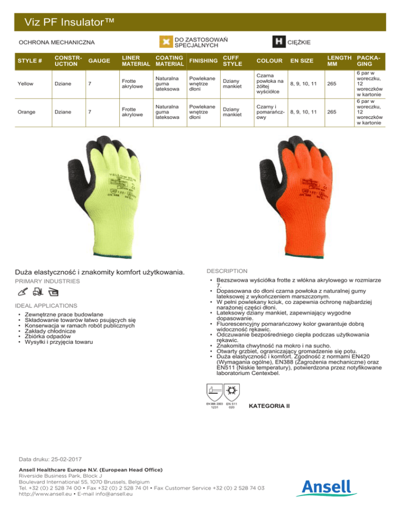 Viz PF Insulator™ DO ZASTOSOWAŃ SPECJALNYCH OCHRONA MECHANICZNA STYLE # CONSTRUCTION GAUGE LINER COATING CUFF FINISHING MATERIAL MATERIAL STYLE Yellow Dziane 7 Frotte akrylowe Naturalna guma lateksowa Orange Dziane 7 Frotte akrylowe Naturalna guma lateksowa Duża elastyczność i znakomity komfort użytkowania. PRIMARY INDUSTRIES IDEAL APPLICATIONS • • • • • • Zewnętrzne prace budowlane Składowanie towarów łatwo psujących się Konserwacja w ramach robót publicznych Zakłady chłodnicze Zbiórka odpadów Wysyłki i przyjęcia towaru Powlekane wnętrze dłoni Powlekane wnętrze dłoni CIĘŻKIE COLOUR EN SIZE LENGTH PACKAMM GING Dziany mankiet Czarna powłoka na żółtej wyściółce 8, 9, 10, 11 265 Dziany mankiet Czarny i pomarańczowy 8, 9, 10, 11 265 6 par w woreczku, 12 woreczków w kartonie 6 par w woreczku, 12 woreczków w kartonie DESCRIPTION • Bezszwowa wyściółka frotte z włókna akrylowego w rozmiarze 7. • Dopasowana do dłoni czarna powłoka z naturalnej gumy lateksowej z wykończeniem marszczonym. • W pełni powlekany kciuk, co zapewnia ochronę najbardziej narażonej części dłoni. • Lateksowy dziany mankiet, zapewniający wygodne dopasowanie. • Fluorescencyjny pomarańczowy kolor gwarantuje dobrą widoczność rękawic. • Odczuwanie bezpośredniego ciepła podczas użytkowania rękawic. • Znakomita chwytność na mokro i na sucho. • Otwarty grzbiet, ograniczający gromadzenie się potu. • Duża elastyczność i komfort. Zgodność z normami EN420 (Wymagania ogólne), EN388 (Zagrożenia mechaniczne) oraz EN511 (Niskie temperatury), potwierdzona przez notyfikowane laboratorium Centexbel. KATEGORIA II Data druku: 25-02-2017 Riverside Business Park, Block J Boulevard International 55, 1070 Brussels, Belgium Tel. +32 (0) 2 528 74 00 • Fax +32 (0) 2 528 74 01 • Fax Customer Service +32 (0) 2 528 74 03 http://www.ansell.eu • E-mail [email protected]