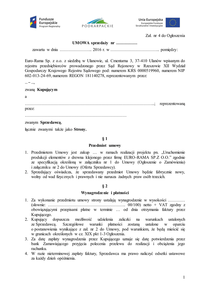Zał. nr 4 do Ogłoszenia UMOWA sprzedaży nr …………… zawarta w dniu ………………….. 2016 r. w …………………………….. pomiędzy: Euro-Rama Sp. z o.o. z siedzibą w Ulanowie, ul. Cmentarna 3, 37-410 Ulanów wpisanym do rejestru przedsiębiorców prowadzonego przez Sąd Rejonowy w Rzeszowie XII Wydział Gospodarczy Krajowego Rejestru Sądowego pod: numerem KRS 0000519960, numerem NIP 602-013-24-69, numerem REGON 181140278, reprezentowanym przez: … – …, zwaną Kupującym a ………………………………………………………………………………..; przez: reprezentowaną ……………………………………………………………… zwanym Sprzedawcą, łącznie zwanymi także jako Strony. §1 Przedmiot umowy 1. Przedmiotem Umowy jest zakup … w ramach realizacji projektu pn. „Uruchomienie produkcji elementów z drewna klejonego przez firmę EURO-RAMA SP.Z O.O.” zgodnie ze specyfikacją określoną w załączniku nr 1 do Umowy (Ogłoszenie o Zamówieniu) i załączniku nr 2 do Umowy (Oferta Sprzedawcy). 2. Sprzedający oświadcza, że sprzedawany przedmiot Umowy będzie fabrycznie nowy, wolny od wad fizycznych i prawnych i nie narusza żadnych praw osób trzecich. §2 Wynagrodze nie i płatności 1. Za wykonanie przedmiotu umowy strony ustalają wynagrodzenie w wysokości ………… (słownie: ………………………………………………. 00/100) netto + VAT zgodny z obowiązującymi przepisami płatne w terminie … od dnia otrzymania faktury przez Kupującego. 2. Kupujący dopuszcza możliwość udzielenia zaliczki na warunkach ustalonych ze Sprzedawcą. Szczegółowe warunki płatności zostaną ustalone w oparciu o postanowienia wynikające z zał. nr 2 do Umowy, pod warunkiem, że będą mieścić się w granicach określonych w cz. XIX pkt 1-3 Ogłoszenia. 3. Za datę zapłaty wynagrodzenia przez Kupującego uznaje się datę potwierdzenia przez bank Zamawiającego przyjęcia polecenia przelewu do realizacji i obciążenia jego rachunku. 4. W razie nieterminowej zapłaty faktury, Sprzedawca ma prawo naliczyć odsetki ustawowe za każdy dzień opóźnienia. 1 5. W razie jakichkolwiek wątpliwości ustala się, że Sprzedawca jest zobowiązany do pokrycia wszelkich kosztów związanych z prawidłowym zrealizowaniem Przedmiotu Umowy. §3 Termin realizacji umowy 1. Przedmiot Umowy zostanie zrealizowany nie później niż do dnia …. 2. Sprzedawca gwarantuje bezwzględnie terminowe wykonanie przedmiotu Umowy. 3. Za datę wykonania Przedmiotu Umowy przez Sprzedawcę uważa się datę potwierdzenia przez Kupującego protokołem zdawczo-odbiorczym odbioru przedmiotu Umowy wraz z całą niezbędną dokumentacją techniczną oraz niezbędnymi dokumentami (np. certyfikaty, atesty, deklaracje, instrukcje). Protokół zdawczo-odbiorczy zostanie podpisany po zamontowaniu Przedmiotu Umowy i przeprowadzeniu z wynikiem pozytywnym wyników testów sprawdzających urządzenia. §4 Gwarancja, rękojmia 1. Sprzedawca udziela Kupującemu gwarancji na dostarczony Sprzęt na okres … lat licząc od daty podpisania protokołu, o którym mowa w § 3 ust. 3 Umowy. 2. Zamawiający ma prawo wykorzystać uprawnienia z tytułu rękojmi za wady, niezależnie od uprawnień wynikających z gwarancji. 3. Sprzedawca odpowiada za wady w wykonaniu przedmiotu umowy również po okresie gwarancji oraz rękojmi, jeżeli Kupujący zawiadomił Sprzedawcę o wadzie przed upływem okresu gwarancji lub rękojmi, zgodnie z art. 568 ustawy kodeks cywilny. 4. Wady ujawnione w okresie gwarancji będą usuwane przez Sprzedawcę na jego koszt i ryzyko w terminie 14 dni od powiadomienia go przez Kupującego o wadzie lub jeżeli nie będzie to technicznie możliwe w innym uzgodnionym przez Strony terminie. 5. Jeżeli Sprzedawca w wyznaczonym terminie nie usunie wad, Kupujący może je usunąć w jego zastępstwie i na jego koszt. 6. Sprzedawca zobowiązany jest do serwisowania Przedmiotu Umowy przez okres … lat. §5 Kary umowne, odszkodowania 1. Sprzedawca zapłaci Kupującemu kary umowne: 1) za opóźnienie w wykonaniu przedmiotu umowy w wysokości 1% wynagrodzenia netto określonego w § 2 ust. 1 Umowy za każdy dzień opóźnienia, 2) za opóźnienie w usunięciu wad ujawnionych w okresie gwarancji i rękojmi – w wysokości 0,1 % wynagrodzenia netto określonego w § 2 ust. 1 za każdy dzień opóźnienia, licząc od upływu terminu wynikającego z § 4 ust. 4 Umowy. 2. Kupujący zastrzega sobie prawo dochodzenia odszkodowania, przewyższającego wysokość zastrzeżonych kar umownych na zasadach ogólnych Kodeksu Cywilnego, niezależnie od naliczonych kar umownych. 3. Kary umowne, o których mowa w ust. 1 Sprzedawca zapłaci na wskazany przez Kupującego rachunek bankowy w terminie 14 dni kalendarzowych od dnia wystawienia noty obciążeniowej. 2 4. Zapłata kary umownej nie zwalnia Sprzedawcy z obowiązku wykonania przedmiotu niniejszej umowy. §6 Siła wyższa 1. Strony nie odpowiadają za niewykonanie lub nienależyte wykonanie przedmiotu umowy, jeżeli jest to spowodowane „siłą wyższą”. 2. Dla celów niniejszej umowy „siłą wyższą” jest zdarzenie nagłe, nadzwyczajne i niemożliwe do przewidzenia w dacie zawarcia Umowy, na które nie ma wpływu żadna ze Stron. 3. Jeżeli okres działania siły wyższej trwa dłużej niż 1 miesiąc, strony mają prawo odstąpić od dalszej realizacji umowy, bez obowiązku zapłaty kar i odszkodowań związanych z odstąpieniem po uprzednim pisemnym powiadomieniu drugiej strony. §7 Poufność 1. Strony zobowiązują się do nie ujawniania informacji związanych z zawarciem i wykonywaniem niniejszej umowy. 2. Obowiązek nie ujawniania informacji związanych z zawarciem i wykonywaniem niniejszej umowy nie dotyczy takich informacji, jak: jawnych z mocy prawa, podanych wcześniej przez drugą stronę do publicznej informacji lub w jakikolwiek inny sposób przez nią rozpowszechnione, informacje uznane