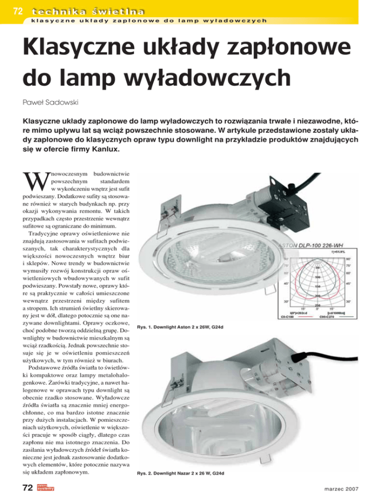 72 klasyczne uk≥ady zap≥onowe do lamp wy≥adowczych Klasyczne układy zapłonowe do lamp wyładowczych Paweł Sadowski Klasyczne uk≥ady zap≥onowe do lamp wy≥adowczych to rozwiπzania trwa≥e i niezawodne, ktÛre mimo up≥ywu lat sπ wciπø powszechnie stosowane. W artykule przedstawione zosta≥y uk≥ady zap≥onowe do klasycznych opraw typu downlight na przyk≥adzie produktÛw znajdujπcych siÍ w ofercie firmy Kanlux. nowoczesnym budownictwie powszechnym standardem w wykoÒczeniu wnÍtrz jest sufit podwieszany. Dodatkowe sufity sπ stosowane rÛwnieø w starych budynkach np. przy okazji wykonywania remontu. W takich przypadkach czÍsto przestrzenie wewnπtrz sufitowe sπ ograniczane do minimum. Tradycyjne oprawy oúwietleniowe nie znajdujπ zastosowania w sufitach podwieszanych, tak charakterystycznych dla wiÍkszoúci nowoczesnych wnÍtrz biur i sklepÛw. Nowe trendy w budownictwie wymusi≥y rozwÛj konstrukcji opraw oúwietleniowych wbudowywanych w sufit podwieszany. Powsta≥y nowe, oprawy ktÛre sπ praktycznie w ca≥oúci umieszczone wewnπtrz przestrzeni miÍdzy sufitem a stropem. Ich strumieÒ úwietlny skierowany jest w dÛ≥, dlatego potocznie sπ one nazywane downlightami. Oprawy oczkowe, choÊ podobne tworzπ oddzielnπ grupÍ. Downlighty w budownictwie mieszkalnym sπ wciπø rzadkoúciπ. Jednak powszechnie stosuje siÍ je w oúwietleniu pomieszczeÒ uøytkowych, w tym rÛwnieø w biurach. Podstawowe ürÛd≥a úwiat≥a to úwietlÛwki kompaktowe oraz lampy metalohalogenkowe. ØarÛwki tradycyjne, a nawet halogenowe w oprawach typu downlight sπ obecnie rzadko stosowane. Wy≥adowcze ürÛd≥a úwiat≥a sπ znacznie mniej energoch≥onne, co ma bardzo istotne znacznie przy duøych instalacjach. W pomieszczeniach uøytkowych, oúwietlenie w wiÍkszoúci pracuje w sposÛb ciπg≥y, dlatego czas zap≥onu nie ma istotnego znaczenia. Do zasilania wy≥adowczych ürÛde≥ úwiat≥a konieczne jest jednak zastosowanie dodatkowych elementÛw, ktÛre potocznie nazywa siÍ uk≥adem zap≥onowym. W 72 Rys. 1. Downlight Aston 2 x 26W, G24d Rys. 2. Downlight Nazar 2 x 26 W, G24d marzec 2007 klasyczne uk≥ady zap≥onowe... Rys. 3. Urzπdzenie stabilizacyjno-zap≥onowe do úwietlÛwek G24d 2 x 18 W 74 Rys. 4. Downlight Pasat, Rx7s 70 W / 150 W L K E R Oprawy typu downlight ze úwietlÛwkami kompaktowymi Najbardziej popularne w oprawach typu downlight sπ úwietlÛwki kompaktowe o mocach 18 W i 26 W z trzonkiem G24d, przystosowane do klasycznego uk≥adu zap≥onowego. Wewnπtrz trzonka umieszczony jest bimetalowy zap≥onnik, ktÛry juø stanowi czÍúÊ obwodu uk≥adu zap≥onowego. åwietlÛwki te do poprawnej pracy wymagajπ tylko statecznika indukcyjnego. Dawniej element ten znajdowa≥ siÍ wewnπtrz oprawy. Obecnie, coraz czÍúciej stateczniki umieszczane sπ w oddzielnej obudowie, poz oprawπ. Dla typowej oprawy 2 x 18 W lub 2 x 26 W stosowane jest jedno urzπdzenie zap≥onowe, wyposaøone w dwa stateczniki indukcyjne, odpowiednio do mocy ürÛde≥ úwiat≥a. W oprawach typu downlight firmy Kanlux serii DLP przewÛd od oprawy jest zakoÒczony specjalnπ wtyczkπ pasujπcπ tylko do urzπdzenia zap≥onowego. Takie rozwiπzanie u≥atwia montaø oraz wyklucza moøliwoúÊ pope≥nienia b≥Ídu przez instalatora. A M Klasycznym uk≥adem zap≥onowym nazywa siÍ rozwiπzania pracujπce z czÍstotliwoúciπ sieci zasilajπcej oparte na stateczniku indukcyjnym w≥πczonym szeregowo w obwÛd lampy. Schematy ideowe klasycznych uk≥adÛw zap≥onowych znajdujπ siÍ niemal w kaødym katalogu czy instrukcji. Rozwiπzania te sπ praktycznie wciπø niezmienne od poczπtku istnienia wy≥adowczych ürÛde≥ úwiat≥a. Zap≥onem elektronicznym nazywa siÍ rozwiπzanie, w ktÛrym napiÍcie zap≥onu oraz stabilizacjÍ prπdu wy≥adowania realizuje w pe≥ni uk≥ad elektroniczny, a ürÛd≥o úwiat≥a jest zasilane duøπ czÍstotliwoúciπ, zwykle powyøej 20 kHz. A Uk≥ady zap≥onowe 74 klasyczne uk≥ady zap≥onowe do lamp wy≥adowczych Rys. 5. Peru 150 ñ urzπdzenie stabilizacyjno-zap≥onowe do lamp wysokoprÍønych 150 W 73 Oprawy do lamp metalohalogenkowych Oprawy do lamp metalohalogenkowych sπ zwykle rÛwnieø przystosowane do zasilania poprzez zewnÍtrzne urzπdzenie stabilizacyjno-zap≥onowe. W downlightach powszechnie stosuje siÍ lampy o mocach od 35 W do 150 W z trzonkami G12 i Rx7s. W przeciwieÒstwie do úwietlÛwek kompaktowych, lampy metalohalogenkowe stosowane w oprawach downlight nie posiadajπ wbudowanych zap≥onnikÛw. Dlatego do ich zasilania konieczne jest kompletne urzπdzenie stabilizacyjno-zap≥onowe, ktÛre oprÛcz stabilizacji prπdu wy≥adowania musi dodatkowo dostarczaÊ impulsÛw wysokonapiÍciowych o wartoúci szczytowej wynoszπcej nawet 5 kV. Impulsy te sπ niezbÍdne do zap≥onu lampy. Obecnie wiÍkszoúÊ stosowanych zap≥onnikÛw do lamp wysokoprÍønych posiada wewnÍtrzne uzwojenie szeregowe (zap≥onnik szeregowo-rÛwnoleg≥y) oraz prosty uk≥ad elektroniczny do generacji impulsÛw inicjujπcych zap≥on lampy wysokoprÍønej. Jednak jest to nadal klasyczny uk≥ad zap≥onowy. Statecznik Zap≥onniki do lamp wy≥adowczych, zarÛwno bimetalowe jak i elektroniczne nie pe≥niπ øadnej funkcji w czasie ustalonej pracy ürÛd≥a. Ich rola ogranicza siÍ jedynie do zap≥onu. W klasycznych uk≥adach zap≥onowych, stabilizacja prπdu ürÛd≥a úwiat≥a odbywa siÍ poprzez d≥awik indukcyjny, zwany potocznie statecznikiem. Jego podstawowym parametrem jest impe- dancja. Od niej zaleøy prπd pracy ürÛd≥a úwiat≥a, ktÛry z kolei jest jego najwaøniejszym parametrem elektrycznym. Markowe stateczniki ustalajπ prπd wy≥adowania lampy na w≥aúciwym dla niej poziomie, co gwarantuje uzyskanie znamionowych parametrÛw úwietlnych i odpowiedniej trwa≥oúci ürÛd≥a úwiat≥a. W tanich uk≥adach zap≥onowych czÍsto rdzeÒ magnetyczny statecznika wykonany jest z blach ferromagnetycznyc
