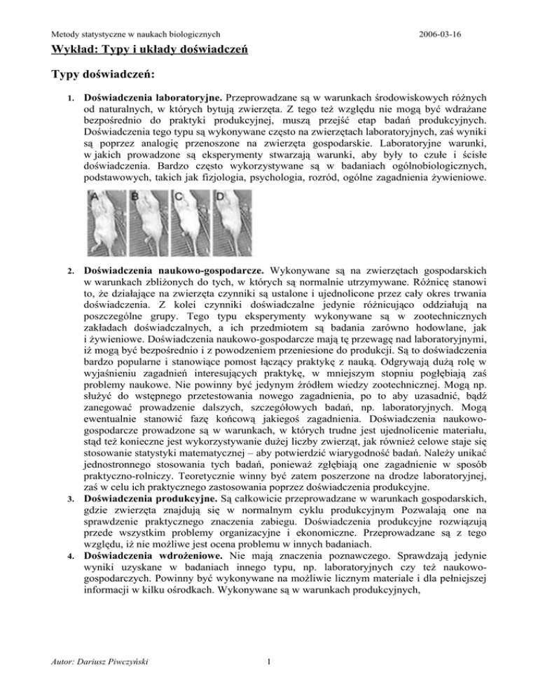 Metody statystyczne w naukach biologicznych 2006-03-16 Wykład: Typy i układy doświadczeń Typy doświadczeń: 1. Doświadczenia laboratoryjne. Przeprowadzane są w warunkach środowiskowych różnych od naturalnych, w których bytują zwierzęta. Z tego też względu nie mogą być wdrażane bezpośrednio do praktyki produkcyjnej, muszą przejść etap badań produkcyjnych. Doświadczenia tego typu są wykonywane często na zwierzętach laboratoryjnych, zaś wyniki są poprzez analogię przenoszone na zwierzęta gospodarskie. Laboratoryjne warunki, w jakich prowadzone są eksperymenty stwarzają warunki, aby były to czułe i ścisłe doświadczenia. Bardzo często wykorzystywane są w badaniach ogólnobiologicznych, podstawowych, takich jak fizjologia, psychologia, rozród, ogólne zagadnienia żywieniowe. Doświadczenia naukowo-gospodarcze. Wykonywane są na zwierzętach gospodarskich w warunkach zbliżonych do tych, w których są normalnie utrzymywane. Różnicę stanowi to, że działające na zwierzęta czynniki są ustalone i ujednolicone przez cały okres trwania doświadczenia. Z kolei czynniki doświadczalne jedynie różnicująco oddziałują na poszczególne grupy. Tego typu eksperymenty wykonywane są w zootechnicznych zakładach doświadczalnych, a ich przedmiotem są badania zarówno hodowlane, jak i żywieniowe. Doświadczenia naukowo-gospodarcze mają tę przewagę nad laboratoryjnymi, iż mogą być bezpośrednio i z powodzeniem przeniesione do produkcji. Są to doświadczenia bardzo popularne i stanowiące pomost łączący praktykę z nauką. Odgrywają dużą rolę w wyjaśnieniu zagadnień interesujących praktykę, w mniejszym stopniu pogłębiają zaś problemy naukowe. Nie powinny być jedynym źródłem wiedzy zootechnicznej. Mogą np. służyć do wstępnego przetestowania nowego zagadnienia, po to aby uzasadnić, bądź zanegować prowadzenie dalszych, szczegółowych badań, np. laboratoryjnych. Mogą ewentualnie stanowić fazę końcową jakiegoś zagadnienia. Doświadczenia naukowogospodarcze prowadzone są w warunkach, w których trudne jest ujednolicenie materiału, stąd też konieczne jest wykorzystywanie dużej liczby zwierząt, jak również celowe staje się stosowanie statystyki matematycznej – aby potwierdzić wiarygodność badań. Należy unikać jednostronnego stosowania tych badań, ponieważ zgłębiają one zagadnienie w sposób praktyczno-rolniczy. Teoretycznie winny być zatem poszerzone na drodze laboratoryjnej, zaś w celu ich praktycznego zastosowania poprzez doświadczenia produkcyjne. 3. Doświadczenia produkcyjne. Są całkowicie przeprowadzane w warunkach gospodarskich, gdzie zwierzęta znajdują się w normalnym cyklu produkcyjnym Pozwalają one na sprawdzenie praktycznego znaczenia zabiegu. Doświadczenia produkcyjne rozwiązują przede wszystkim problemy organizacyjne i ekonomiczne. Przeprowadzane są z tego względu, iż nie możliwe jest ocena problemu w innych badaniach. 4. Doświadczenia wdrożeniowe. Nie mają znaczenia poznawczego. Sprawdzają jedynie wyniki uzyskane w badaniach innego typu, np. laboratoryjnych czy też naukowogospodarczych. Powinny być wykonywane na możliwie licznym materiale i dla pełniejszej informacji w kilku ośrodkach. Wykonywane są w warunkach produkcyjnych, 2. Autor: Dariusz Piwczyński 1 Metody statystyczne w naukach biologicznych 2006-03-16 Typy doświadczeń w warunkach „polowych”: Laboratoryjne. Prowadzone w warunkach sztucznych, odmiennych do naturalnych, w których uprawiane są rośliny: klimatyzowane komory, termostaty, chłodnie. Są to warunki, w których możliwe jest regulowanie natężenia światła, wilgotności. Mają zastosowanie ogólnobiologiczne. 2. Wazonowe. Rośliny uprawiane są w specjalnych pojemnikach, wazonach. Są one traktowane w takim ujęciu, jako jednostki doświadczalne. Wazony umieszczane są w halach wegetacyjnych, czasami na otwartej przestrzeni. W wazonach ograniczone są możliwości rozrastania się korzeni, warunki glebowe są sztuczne, wodne, inny mikroklimat. Wobec powyższych, uzyskiwane wyniki mają charakter często orientacyjny. Zastosowaniem tego typu doświadczeń są badania ogólnobiologiczne czy też agrotechniczne. 3. Lizymetryczne. Lizymetry, to pojemniki o znacznej wielkości, 1-2 m2, w dnach posiadają otwory do zbierania wody. Ich wielkość pozwala odwzorować profil glebowy, miąższość gleby nawet do 2 m, ale warunki ekologiczne i agrotechniczne nadal są sztuczne. Zastosowanie, to chemia rolna, gleboznawstwo, fizjologia roślin. 4. Polowe. Prowadzone w warunkach polowych, a zatem w zbliżonych do takich, jakie panują na polach produkcyjnych. 1. Układy doświadczeń Układ doświadczenia jest to sposób podziału jednostek doświadczalnych (zwierząt, roślin) zwierząt na grupy doświadczalne, ich liczebność oraz wzajemne proporcje. Układ doświadczenia należy uznać za model doświadczenia. Układ ortogonalny, nieortogonalny Na kształt układu doświadczenia mają wpływ następujące czynniki: gatunek zwierząt - decyduję o wielkości jednolitych grup zwierząt, sposób traktowania zwierząt – indywidualne lub gromadne, warunki techniczne panujące w miejscu realizacji eksperymentu - wielkość i wyposażenie techniczne pomieszczeń, kadry wykonującej doświadczenie, wykształcenie i umiejętności kadry decydują o złożoności realizowanych układów, metod statystycznych – doświadczenie winno być tak zaprojektowane, aby możliwa była jego późniejsza, statystyczna obróbka. Układy doświadczeń: 1. Układ jednoczynnikowy (prosty). W doświadczeniu tym rozpatruje się wpływ jednego czynnika na oceniane cechy. a) Ciągłe. Podział na grupy, jaki został ustalony na początku doświadczenia, utrzymuje się przez cały okres eksperymentu. Doświadczenie rozpoczyna się jednocześnie na wszystkich osobnikach. Czasami czas trwania doświadczenia dzielony jest na okresy, np. przejściowy oraz właściwy w prz