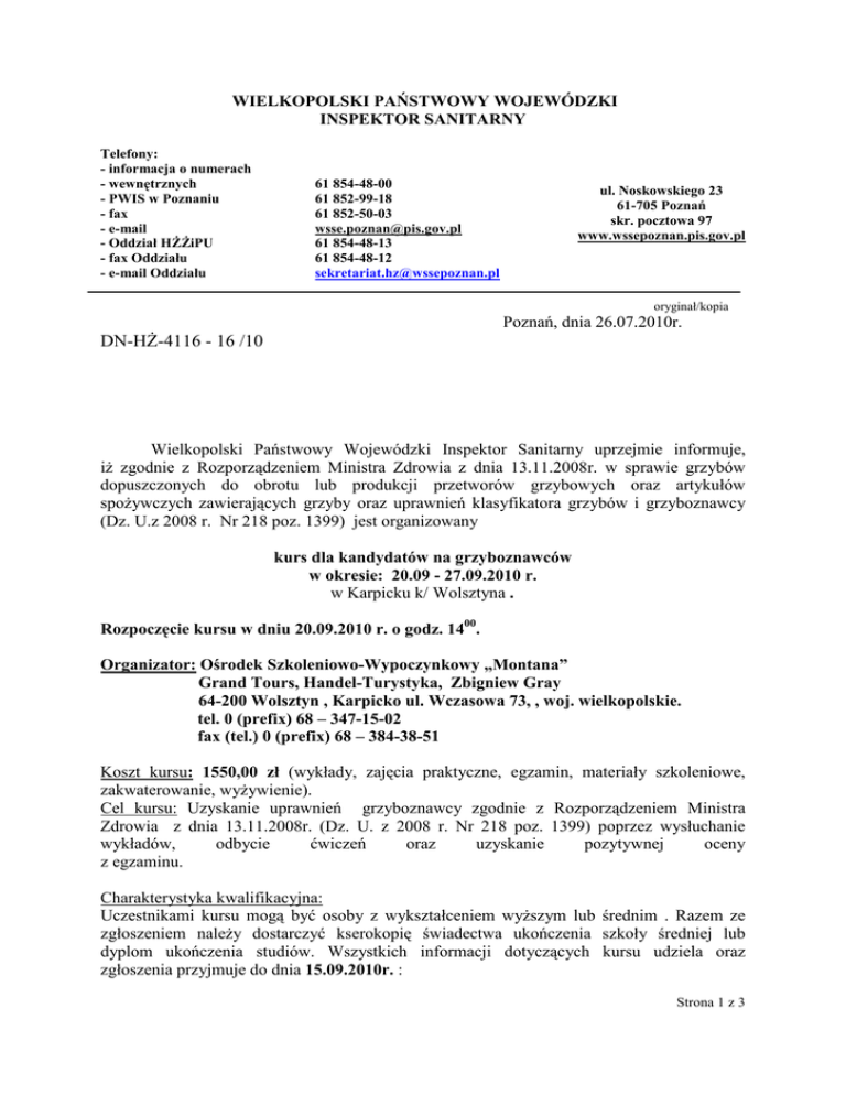 WIELKOPOLSKI PAŃSTWOWY WOJEWÓDZKI INSPEKTOR SANITARNY Telefony: - informacja o numerach - wewnętrznych - PWIS w Poznaniu - fax - e-mail - Oddział HśśiPU - fax Oddziału - e-mail Oddziału 61 854-48-00 61 852-99-18 61 852-50-03 [email protected] 61 854-48-13 61 854-48-12 [email protected] ul. Noskowskiego 23 61-705 Poznań skr. pocztowa 97 www.wssepoznan.pis.gov.pl oryginał/kopia Poznań, dnia 26.07.2010r. DN-Hś-4116 - 16 /10 Wielkopolski Państwowy Wojewódzki Inspektor Sanitarny uprzejmie informuje, iŜ zgodnie z Rozporządzeniem Ministra Zdrowia z dnia 13.11.2008r. w sprawie grzybów dopuszczonych do obrotu lub produkcji przetworów grzybowych oraz artykułów spoŜywczych zawierających grzyby oraz uprawnień klasyfikatora grzybów i grzyboznawcy (Dz. U.z 2008 r. Nr 218 poz. 1399) jest organizowany kurs dla kandydatów na grzyboznawców w okresie: 20.09 - 27.09.2010 r. w Karpicku k/ Wolsztyna . Rozpoczęcie kursu w dniu 20.09.2010 r. o godz. 1400. Organizator: Ośrodek Szkoleniowo-Wypoczynkowy „Montana” Grand Tours, Handel-Turystyka, Zbigniew Gray 64-200 Wolsztyn , Karpicko ul. Wczasowa 73, , woj. wielkopolskie. tel. 0 (prefix) 68 – 347-15-02 fax (tel.) 0 (prefix) 68 – 384-38-51 Koszt kursu: 1550,00 zł (wykłady, zajęcia praktyczne, egzamin, materiały szkoleniowe, zakwaterowanie, wyŜywienie). Cel kursu: Uzyskanie uprawnień grzyboznawcy zgodnie z Rozporządzeniem Ministra Zdrowia z dnia 13.11.2008r. (Dz. U. z 2008 r. Nr 218 poz. 1399) poprzez wysłuchanie wykładów, odbycie ćwiczeń oraz uzyskanie pozytywnej oceny z egzaminu. Charakterystyka kwalifikacyjna: Uczestnikami kursu mogą być osoby z wykształceniem wyŜszym lub średnim . Razem ze zgłoszeniem naleŜy dostarczyć kserokopię świadectwa ukończenia szkoły średniej lub dyplom ukończenia studiów. Wszystkich informacji dotyczących kursu udziela oraz zgłoszenia przyjmuje do dnia 15.09.2010r. : Strona 1 z 3 Wojewódzka Stacja Sanitarno-Epidemiologiczna ul. Noskowskiego 23, 61-705 Poznań. Oddział Higieny śywności ,śywienia i Przedmiotów UŜytku nr telefonu : (61) 8544-846 fax : (61) 8544-812. e-mail : [email protected] Opłatę za kurs naleŜy wpłacić na konto: BS SIEDLEC 53 9660 0007 0011 6479 0200 0001 „Grand Tours” Handel-Turystyka 64-200 Wolsztyn , Karpicko, ul. Wczasowa 73, z dopiskiem „Kurs grzyboznawczy.” Dowód wpłaty naleŜy przedłoŜyć organizatorowi w dniu przyjazdu na kurs lub dokonać wpłaty gotówkowej na miejscu w Ośrodku „Grand Tours”. Uwaga: W związku z ograniczoną liczbą miejsc o przyjęciu na kurs w podanym terminie decyduje kolejność zgłoszeń. Zatem istnieje konieczność potwierdzenia uczestnictwa w kursie do dnia 16.09.2010r. pod wyŜej podanym nr telefonu, fax-u lub e-mailem. Informujemy Państwa, Ŝe dojazd do Karpicka jest następujący: PKP (Dworzec Kolejowy) Poznań – Wolsztyn (czas ok. 2 godz.) Wyjazd z Poznania: 545, 635,855, 1325,1555,1713, 1930. PKS (Dworzec Autobusowy – w pobliŜu dworca kolejowego) Poznań – Wolsztyn (czas ok. 2 godz.) Wyjazd z Poznania: 630, 810,930,1100, 1200, 1300, 1315 ,1400, 1425, 1530, 1625,1750, 1850,1905,2100. Wolsztyn- Karpicko: 750,1030,1125, 1230, 1300,1440, 1525,1600,1828, 1935. (podpisał) Wielkopolski Państwowy Wojewódzki Inspektor Sanitarny dr n. med. Andrzej Trybusz (podpis nieczytelny) bs Strona 2 z 3 Mapa dojazdowa Strona 3 z 3