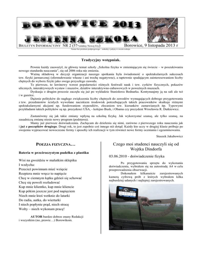BIULETYN INFORMACYJNY NR 2 (57-siódmy Nowej Ery) Borowice, 9 listopada 2013 r Numer bez przekazu podprogowego – unikalny i jedyny w swoim rodzaju. Tradycyjny wstępniak. Pewnie każdy zauważył, że główny temat szkoły „Szkolna fizyka w zmieniającym się świecie – w poszukiwaniu nowego standardu nauczania”, się od 2006 roku nie zmienia. Ważną składową w decyzji organizacji naszego spotkania była świadomość o spektakularnych sukcesach tzw. fizyki jarmarcznej (sformułowanie własne i ani trochę negatywne), a raptownie spadającym zainteresowaniem liczby chętnych do wyboru fizyki jako swego przyszłego zawodu. Te pierwsze, to lawinowy wzrost popularności różnych festiwali nauk i tzw. cyrków fizycznych, pokazów ulicznych, interaktywnych wystaw i muzeów, działów interaktywno-zabawowych w poważnych muzeach. Dyskusja o drugim procesie zaczęła się już po wykładzie Stanisława Bednarka. Kontynuujmy ją na sali ale też i w gazetce. Dążenie polityków do nagłego zwiększenia liczby chętnych do zawodów wymagających dobrego przygotowania z tzw. przedmiotów ścisłych wywołane naciskiem środowisk potrzebujących takich pracowników skutkuje różnymi spektakularnymi akcjami np. fundowaniem stypendiów, zlecaniem tzw. kierunków zamawianych itp. Typowymi przykładami takich polityków są np. prezydenci USA, - kolejno Bush, i Obama czy prezydent Wrocławia R. Dutkiewicz. Zastanówmy się jak takie zmiany wpłyną na szkolną fizykę. Jak wykorzystać szansę, ale tylko szansę, na zasadniczą zmianę niesie nowy program (podstawa). Mamy już pierwsze doświadczenia. Zachęcam do dzielenia się nimi, zarówno z pierwszego roku nauczania jak i już z początków drugiego. Drugi rok, to jest zupełnie coś innego niż dotąd. Każdy kto uczy w drugiej klasie próbuje po swojemu wypracować nowoczesne formy i sposoby ich realizacji w tym również nowe formy oceniania i egzaminowania. Staszek Jakubowicz POEZJA FIZYCZNA… Czego moi studenci nauczyli się od Wojtka Dindorfa Bateria w przeźroczystym pudełku z plastiku 03.06.2010 - doświadczenie fizyka Wisi na gwoździu w malutkim sklepiku I wzdycha: Przecież powinnam mieć wzięcie Rozpiera mnie wręcz to napięcie Chcę w ciemnym kątku gdzieś się schować Chcę się powoli rozładować Kup mnie klientko, kup mnie kliencie Kup pókim jeszcze jest pod napięciem Niech mnie ktoś wetknie do latarki Do radia, autka, do wiertarki I niech popłynie prąd, niech stracę Wolty – niech wykonam pracę! AUTOR bardzo dobrze znany Redakcji i wszystkim (no, prawie…) Borowikom. Po przygotowaniu sprzętu do wykonania doświadczenia, wybrałem się na autostradę A4 w celu przeprowadzenia obserwacji. Dokonałem kilkanaście zarejestrowanych kamerą cyfrową prób z których wybrałem kilka najbardziej udanych i najlepiej zarejestrowanych. Dziś strona z poczuciem humoru (i nie tylko). Foto Zagadka !!! Zadanie jest proste: należy zgadnąć KTO znajduje się na powyższej fotografii (kierowcę i gościa z prawej strony zdjęcia pomijamy). Fizyka i życie Prezentacja Kolejny raz Wojtek Dindorf udowodnił, że można zrobić coś z niczego czyli pokazał, w jaki sposób przy użyciu ogólnie dostępnych przedmiotów można pokazać ciekawe doświadczenia z fizyki. A ja mam satysfakcję (i dowód na zdjęciach), że byłem asystentem Wojtka, czym będę się chwalił chyba do końca życia… Maciek Żeby fizyka rosła w siłę, a każdy miał swój tramwaj… Czarny humor (zgadnijcie dlaczego…) Student do profesora na Uniwersytecie Medycznym: - Panie Profesorze po co na medycynę jest egzamin z fizyki? - Jak to po co? Fizyka ratuje życie! - Jak to? Jak fizyka może ratować życie? - Trzyma debili z dala od medycyny! OGŁOSZENIA (jak zwykle) PŁATNE: Nr1. Redakcja tym razem mieści się w pokoju nr 1. Nr2. Redakcja permanentnie czeka na materiały albo na cokolwiek. Nr2. Koperty z wyrazami wdzięczności są przyjmowane w pokoju nr 1. Koperty należy przynosić pojedynczo (nie pchać się) po kolacji. Nr3. Korupcji mówimy stanowcze „Być może…”. Mglistopadowy blady świt na jakimś dworcu kolejowym gdzieś w Polsce. Początek żmudnej podróży środkami komunikacji publicznej do tajemniczego miejsca o nawie Borowice. Jeśli mi się spodoba, przyjadę tu znowu, ale samochodem, więc po drodze staram się zobaczyć jak najwięcej rzeczy dziwnych i w miarę trwałych – ot, takie repery dla pamięci. Oj jasny gwint, ależ ktoś miał poczucie humoru, żeby wywlec tramwaj aż tak wysoko i postawić go pod skałą! Od mojego ‘pierwszego’ razu wielokrotnie już przemierzałam tą trasę siedząc za kółkiem i choć nie jest ona szczególnie skomplikowana, stan pełnego spokoju ducha osiągam ujrzawszy tramwaj pod skałą w Podgórzynie. Wówczas mam pewność, że jestem na dobrej drodze. i tak sobie kombinuję, że w poświęconej fizyce części mojego życia Jesienna Szkoła w Borowicach jest tramwajem pod skała. Danka KURSANCIE !!! Tu może być TWÓJ tekst, zdjęcia, przemyślenia, cokolwiek… …tylko daj nam to a my dopilnujemy Twojej sławy AUTORA… Referat Zabawki i niezabawki z dzieciństwa… Stanisław Bednarek wywołał ożywioną dyskusję referatem Analiza czynników determinujących frekwentywność wyboru studiów na kierunku fizyka przez maturzystów w Polsce po 1989 r. Tezy referatu: 1. Cel referatu 2. Wyniki badań zespołu Prof. Władysława Błasiaka 3. Lista potencjalnych czynników 4. Ocena znaczenia czynników 5. Prawdopodobna ewolucja sytuacji 6. Wnioski Zjawisko małego zainteresowania maturzystów wyborem studiów na kierunku fizyka wymaga dalszych badań. Rozwój sytuacji społecznej i gospodarczej, szczególnie w Europie, najprawdopodobniej nie będzie sprzyjał w najbliższych latach istotnemu zwiększeniu liczby osób wybierających studia na kierunku fizyka. Czy rzeczywiście jest to powód do niepokoju? Jeżeli tak, to co należałoby zrobić w celu uniknięcia negaty