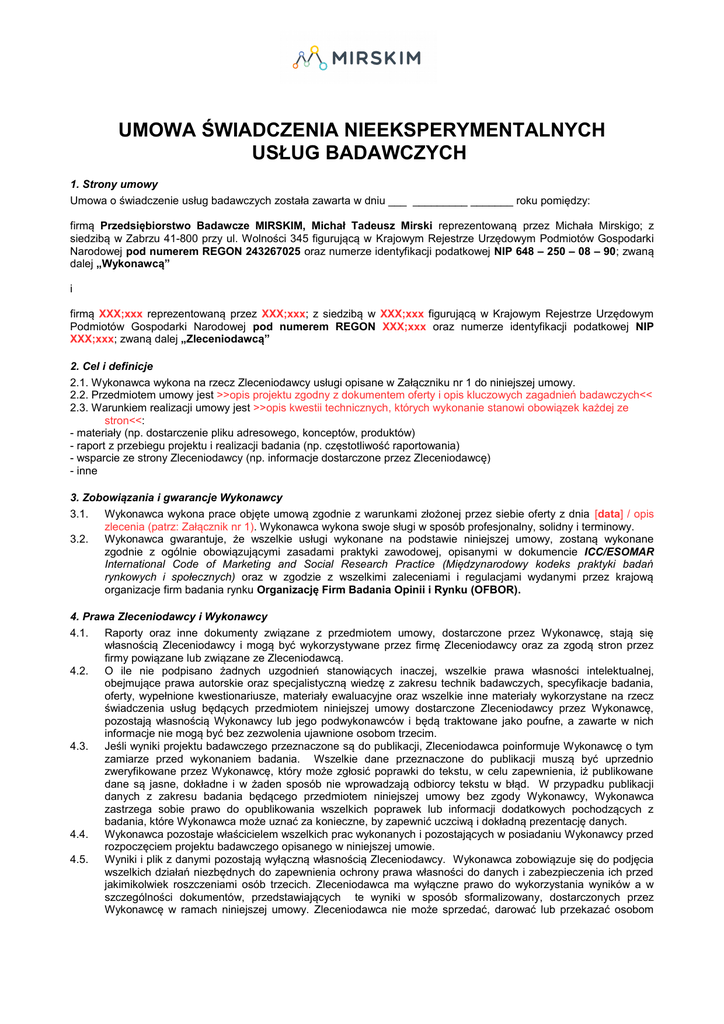UMOWA ŚWIADCZENIA NIEEKSPERYMENTALNYCH USŁUG BADAWCZYCH 1. Strony umowy Umowa o świadczenie usług badawczych została zawarta w dniu ___ _________ _______ roku pomiędzy: firmą Przedsiębiorstwo Badawcze MIRSKIM, Michał Tadeusz Mirski reprezentowaną przez Michała Mirskigo; z siedzibą w Zabrzu 41-800 przy ul. Wolności 345 figurującą w Krajowym Rejestrze Urzędowym Podmiotów Gospodarki Narodowej pod numerem REGON 243267025 oraz numerze identyfikacji podatkowej NIP 648 – 250 – 08 – 90; zwaną dalej „Wykonawcą” i firmą XXX;xxx reprezentowaną przez XXX;xxx; z siedzibą w XXX;xxx figurującą w Krajowym Rejestrze Urzędowym Podmiotów Gospodarki Narodowej pod numerem REGON XXX;xxx oraz numerze identyfikacji podatkowej NIP XXX;xxx; zwaną dalej „Zleceniodawcą” 2. Cel i definicje 2.1. Wykonawca wykona na rzecz Zleceniodawcy usługi opisane w Załączniku nr 1 do niniejszej umowy. 2.2. Przedmiotem umowy jest >>opis projektu zgodny z dokumentem oferty i opis kluczowych zagadnień badawczych<< 2.3. Warunkiem realizacji umowy jest >>opis kwestii technicznych, których wykonanie stanowi obowiązek każdej ze stron<<: - materiały (np. dostarczenie pliku adresowego, konceptów, produktów) - raport z przebiegu projektu i realizacji badania (np. częstotliwość raportowania) - wsparcie ze strony Zleceniodawcy (np. informacje dostarczone przez Zleceniodawcę) - inne 3. Zobowiązania i gwarancje Wykonawcy 3.1. Wykonawca wykona prace objęte umową zgodnie z warunkami złożonej przez siebie oferty z dnia [data] / opis zlecenia (patrz: Załącznik nr 1). Wykonawca wykona swoje sługi w sposób profesjonalny, solidny i terminowy. 3.2. Wykonawca gwarantuje, że wszelkie usługi wykonane na podstawie niniejszej umowy, zostaną wykonane zgodnie z ogólnie obowiązującymi zasadami praktyki zawodowej, opisanymi w dokumencie ICC/ESOMAR International Code of Marketing and Social Research Practice (Międzynarodowy kodeks praktyki badań rynkowych i społecznych) oraz w zgodzie z wszelkimi zaleceniami i regulacjami wydanymi przez krajową organizacje firm badania rynku Organizację Firm Badania Opinii i Rynku (OFBOR). 4. Prawa Zleceniodawcy i Wykonawcy 4.1. Raporty oraz inne dokumenty związane z przedmiotem umowy, dostarczone przez Wykonawcę, stają się własnością Zleceniodawcy i mogą być wykorzystywane przez firmę Zleceniodawcy oraz za zgodą stron przez firmy powiązane lub związane ze Zleceniodawcą. 4.2. O ile nie podpisano żadnych uzgodnień stanowiących inaczej, wszelkie prawa własności intelektualnej, obejmujące prawa autorskie oraz specjalistyczną wiedzę z zakresu technik badawczych, specyfikacje badania, oferty, wypełnione kwestionariusze, materiały ewaluacyjne oraz wszelkie inne materiały wykorzystane na rzecz świadczenia usług będących przedmiotem niniejszej umowy dostarczone Zleceniodawcy przez Wykonawcę, pozostają własnością Wykonawcy lub jego podwykonawców i będą traktowane jako poufne, a zawarte w nich informacje nie mogą być bez zezwolenia ujawnione osobom trzecim. 4.3. Jeśli wyniki projektu badawczego przeznaczone są do publikacji, Zleceniodawca poinformuje Wykonawcę o tym zamiarze przed wykonaniem badania. Wszelkie dane przeznaczone do publikacji muszą być uprzednio zweryfikowane przez Wykonawcę, który może zgłosić poprawki do tekstu, w celu zapewnienia, iż publikowane dane są jasne, dokładne i w żaden sposób nie wprowadzają odbiorcy tekstu w błąd. W przypadku publikacji danych z zakresu badania będącego przedmiotem niniejszej umowy bez zgody Wykonawcy, Wykonawca zastrzega sobie prawo do opublikowania wszelkich poprawek lub informacji dodatkowych pochodzących z badania, które Wykonawca może uznać za konieczne, by zapewnić uczciwą i dokładną prezentację danych. 4.4. Wykonawca pozostaje właścicielem wszelkich prac wykonanych i pozostających w posiadaniu Wykonawcy przed rozpoczęciem projektu badawczego opisanego w niniejszej umowie. 4.5. Wyniki i plik z danymi pozostają wyłączną własnością Zleceniodawcy. Wykonawca zobowiązuje się do podjęcia wszelkich działań niezbędnych do zapewnienia ochrony prawa własności do danych i zabezpieczenia ich przed jakimikolwiek roszczeniami osób trzecich. Zleceniodawca ma wyłączne prawo do wykorzystania wyników a w szczególności dokumentów, przedstawiających te wyniki w sposób sformalizowany, dostarczonych przez Wykonawcę w ramach niniejszej umowy. Zleceniodawca nie może sprzedać, darować lub przekazać osobom 4.6. 4.7. 4.8. 4.9. trzecim (za wyjątkiem przypadków opisanych w ust. 4.1) wspomnianych wyników w całości lub w części bez pisemnej zgody Wykonawcy. Wykonawca zachowa oryginalne dane związane z projektem badawczym (np. raporty, kwestionariusze, bazy danych, materiały audio/wideo, materiały instruktażowe, listy kodowe, i inne), zapisane w wersji elektronicznej bądź w inny sposób, przez okres dwóch lat po zakończeniu projektu. W ciągu tego okresu Wykonawca będzie stroną odpowiedzialną za ochronę poufności wszelkich przechowywanych materiałów. Na żądanie Zleceniodawcy materiały mogą zostać zniszczone przed upływem okresu dwóch lat od zakończenia realizacji badania, będącego przedmiotem niniejszej umowy. Po upływie dwóch lat, wszelkie materiały mogą zostać zniszczone przez Wykonawcę bez uzyskania uprzedniej zgody Zleceniodawcy. Na żądanie Zleceniodawcy materiały te mogą być przechowywane przez okres dłuższy niż określony powyżej, pod warunkiem że Zleceniodawca opłaci wszelkie związane z tym koszty. Podczas gdy Wykonawca zapewnia, iż w rozsądnym zakresie dołoży wszelkich starań, aby wykonać usługi zgodnie z uzgodnionym harmonogramem, nie przyjmuje on odpowiedzialności za jakiekolwiek opóźnienie spowodowane przez okoliczności pozostające poza zakresem jego kontroli. Prawdopodobny czas wszelkich istotnych opóźnień powinien być jak najszybciej zgłoszony Zleceniodawcy na piśmi