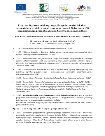 Europejski Fundusz Rolny na Rzecz Rozwoju Obszarów Wiejskich: Europa inwestująca w obszary wiejskie. Wyjazd edukacyjny współfinansowany ze środków Unii Europejskiej w ramach Osi 4 LEADER, w zakresie działania 431 Funkcjonalnie Lokalnej Grupy Działania, nabywanie umiejętności i aktywizacja, objętego PROW na lata 2007-2013 Program Wyjazdu edukacyjnego dla społeczności lokalnej prezentujący projekty zrealizowane w ramach Wdrażania LSR organizowanego przez LGD „Kraina Nafty” w dniu 12.06.2015 r. godz. 11:00 – Zbiórka w Miejscu Piastowym w siedzibie LGD „Kraina Nafty” – parking Objazd po obszarze LGD „Kraina Nafty” - prezentacja zrealizowanych projektów 11:10 - Gmina Miejsce Piastowe - Park w Miejscu Piastowym - OiRW 11:30 - Elżbieta Kandefer – Iwonicz - Zakup nowoczesnego sprzętu do produkcji ciast, ciastek, tortów, pączków i drożdżówek - TiRMP 12:00 - Gminny Ośrodek Kultury w Iwoniczu Zdroju (Amfiteatr) - Zakup strojów dla ludowego zespołu folklorystycznego „Mali Lubatowianie”; Wyposażenie gminnej orkiestry dętej w niezbędne instrumenty oraz Wydanie płyty autorskiej i promocja w rozgłośni radiowej zespołu "Ivo Stars Band" – MP 12:45 - Stowarzyszenie Miłośników Wsi Rogi – Wyposażenie Zagrody Etnograficznej oraz Założenie ogródka przydomowego i zorganizowanie warsztatów zielarskich formą kultywowania tradycji – MP 13:00 – Gmina Miejsce Piastowe - Rewitalizacja budynku Domu Ludowego w Rogach - OiRW 13:30 – Gmina Dukla - Remont Sali widowiskowo-kinowej Ośrodka Kultury w Dukli - OiRW, Modernizacja punktu Informacji Turystycznej w Dukli, poprzez zakup nowego sprzętu komputerowego, urządzenia wielofunkcyjnego i powstanie mini kafejki internetowej oraz Wydanie albumu: kapliczki dziedzictwem kulturowym Gminy Dukla i foldera „Do Złotej Studzienki” - MP 14:15 - obiad w Gospodarstwie Agroturystycznym Zakucie w Daliowej oraz prezentacja projektów zrealizowanych przez Gminę Jaśliska – Przygotowanie i wydanie publikacji informacyjno – promocyjnej dotyczącej Gminy Jaśliska; OSP Jaśliska - Wydanie mapy turystycznej Gminy Jaśliska, Stowarzyszenie na Styku Kultur – Jaśliskie kolędowanie; Dyskusja nad zaprezentowanymi projektami cz. I 15:00 - Zwiedzanie gospodarstwa agroturystycznego Nasz Dom w Daliowej – prezentacja rezultatów projektów zrealizowanych przez Jadwigę Urban - Wyposażenie gospodarstwa agroturystycznego „Nasz dom”; Zakup i montaż zestawu fotowoltaicznego w Gospodarstwie Agroturystycznym "Nasz Dom"; Przebudowa i modernizacja altany wraz z utwardzeniem terenu w Gospodarstwie Agroturystycznym "Nasz Dom". Europejski Fundusz Rolny na Rzecz Rozwoju Obszarów Wiejskich: Europa inwestująca w obszary wiejskie. Wyjazd edukacyjny współfinansowany ze środków Unii Europejskiej w ramach Osi 4 LEADER, w zakresie działania 431 Funkcjonalnie Lokalnej Grupy Działania, nabywanie umiejętności i aktywizacja, objętego PROW na lata 2007-2013 15:45 - Fundacja Muzeum Przemysłu Naftowego i Gazowniczego Im. Ignacego Łukasiewicza w Bóbrce – Zwiedzanie Muzeum z audioprzewodnikiem, Multimedialne wyposażenie sali edukacyjnej – MP 16:00 - Bóbrka – Gmina Chorkówka – Budowa siedmiu placów zabaw w Gminie Chorkówka – MP oraz Rozbudowa, przebudowa i nadbudowa budynku Domu Ludowego w Szczepańcowej, budowa placu zabaw, budowa chodnika i utwardzenie istniejącego placu postojowego - OiRW 17:00 - GBP - Izba Pamięci w Jaszczwi, Wydanie książki Zdzisława Łopatkiewicza Marii Konopnickiej żarnowieckie lata, Wydanie i promocja książki "Pochyl głowę który przechodzisz… Kapliczki i Krzyże Przydrożne Gminy Jedlicze" - MP 17:30 - Poczęstunek w Starej Szkole w Żarnowcu oraz prezentacji projektu GOK Jedlicze Na ścieżce XIX przyrody - MP Występ zespołu Jarzębina z Piotrówki – prezentacja strojów ludowych zakupionych w ramach MP przez Stowarzyszenie Nasza Piotrówka Dyskusja nad zaprezentowanymi projektami cz. podsumowanie wyjazdu i działalności LGD „Kraina Nafty” 18:30 - 19:00 Powrót do Miejsca Piastowego II oraz