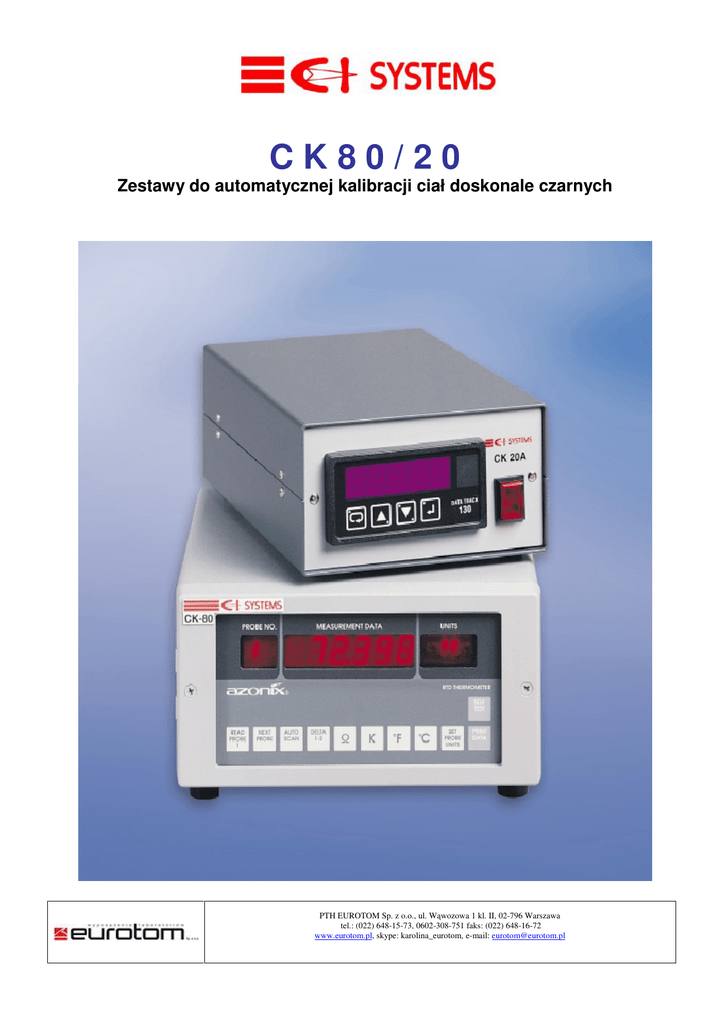 CK80/20 Zestawy do automatycznej kalibracji ciał doskonale czarnych PTH EUROTOM Sp. z o.o., ul. Wąwozowa 1 kl. II, 02-796 Warszawa tel.: (022) 648-15-73, 0602-308-751 faks: (022) 648-16-72 www.eurotom.pl, skype: karolina_eurotom, e-mail: [email protected] CK80 - Zestaw do automatycznej kalibracji ciała doskonale czarnego o zwiększonej powierzchni SR80 Zestaw CK80 stosuje się do precyzyjnej kalibracji ciał doskonale czarnych o zwiększonej powierzchni produkcji firmy CI Systems. Zastosowanie najnowszych, stabilnych termicznie układów elektronicznych daje doskonałe wyniki. Wartości temperatury źródła emisyjnego, celu lub różnicy między nimi są wyświetlane w formie cyfrowej. Zestaw CK80 obejmuje termometr cyfrowy, dwa platynowe termometry opornościowe (PRT), pakiet software’owy do automatycznej kalibracji, certyfikat kalibracji i dokumenty odniesienia NIST (traceability documentation). CECHY FUNKCJONALNE: • • • • • Automatyczna kalibracja ciała doskonale czarnego Komunikacja za pomocą protokołu RS 232 Odniesienie do NIST (traceability) Dokładność termometru cyfrowego 0.001 °C Nie ma potrzeby demontażu ciała doskonale czarnego z testera SPECYFIKACJA TECHNICZNA: Wyświetlane temperatury Rozdzielczość (resolution) Zakres temperatury Absolutna dokładność kalibracji Dryft długo okresowy (Long term drift) Natężenie prądu pomiarowego Zakres roboczej temperatury otoczenia Zakres temperatur przechowywania Wilgotność względna Zasilanie Wymiary (WxSzxD) Waga Częstość rekalibracji dla utrzymania odniesienia do NIST (Traceability) wyświetlanie temperatury emitera, płytki celu lub ich różnica w °C, K, °F oraz oporności PRT, 0.001 °C -60 °C to +180 °C ± 0.05%, maksymalna 0.1% pełnego zakresu, około ±0.020°C rocznie 1 mA 0 °C to +60 °C -40 °C to +85 °C 0 to 95% bez kondensacji 230/115 VAC, 50/60 Hz, 10 Wat 114x203x130 mm (4.5”x8”x13”) około 8 Kg (17.6 Lb) 12 miesięcy PTH EUROTOM Sp. z o.o., ul. Wąwozowa 1 kl. II, 02-796 Warszawa tel.: (022) 648-15-73, 0602-308-751 faks: (022) 648-16-72 www.eurotom.pl, skype: karolina_eurotom, e-mail: [email protected] CK20A - Zestaw do automatycznej kalibracji wnękowego ciała doskonale czarnego SR80 (Cavity Black Body) Zestaw CK20A umożliwia kalibrację temperatury odniesioną do NIST (National Institute of Standards and Technology). Zestaw umożliwia automatyczną lub półautomatyczną rekalibrację wysoko temperaturowych, wnękowych ciał doskonale czarnych produkcji CI Systems. Zestaw CK20A składa się z precyzyjnego termometru cyfrowego, termopary typu “S”, przystawki do pozycjonowania termopary we wnęce ciała doskonale czarnego i oprogramowanie. Zestaw CK20A przesyła dokładnie mierzoną temperaturę via RS 232 link do komputera. Software przelicza dane i za pośrednictwem kontrolera IEEE-488 wpisuje nowe wartości kalibracyjne do sterownika SR20. CECHY FUNKCJONALNE: • • • • • • Odniesienie do NIST (traceability) Kalibracja automatyczna Komunikacja za pomocą protokołu RS 232 Wyświetlacz cyfrowy Dokładność termometru cyfrowego 0.1 °C Uchwyt termopary do precyzyjnego i powtarzalnego pozycjonowania SPECYFIKACJA TECHNICZNA: Typ termometru Rozdzielczość termometru Dokładność temperatury Dryft temperatury Częstość rekalibracji dla odniesienia do NIST (traceability) cyfrowy z wewnętrznym złączem 0.1 °C ± 0.5 °C 100 PPM/°C utrzymania 12 miesięcy wzorcem www.ci-systems.com/eo • • Cl Systems Inc. Tel: 1+805-520-2233, Fax: 1+805-520-2234 Cl Systems Ltd., Tel: 972+4-644-8888/0 Fax: 972-4-6543570, e-mail: [email protected] INFORMACJE O PRZEDSTAWICIELACH W DANYM KRAJU/REGIONIE ZNAJDUJĄ SIĘ NA NASZEJ STRONIE INTERNETOWEJ: www.ci-systems.com/eo Nr kat. 607-1900B Zastrzegamy prawo do poprawy charakterystyk bez uprzedzenia. PTH EUROTOM Sp. z o.o., ul. Wąwozowa 1 kl. II, 02-796 Warszawa tel.: (022) 648-15-73, 0602-308-751 faks: (022) 648-16-72 www.eurotom.pl, skype: karolina_eurotom, e-mail: [email protected] z zimnym