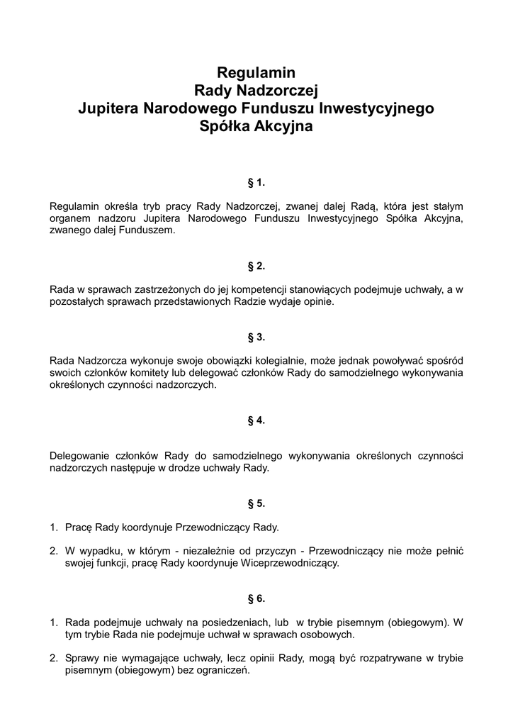 Regulamin Rady Nadzorczej Jupitera Narodowego Funduszu Inwestycyjnego Spółka Akcyjna § 1. Regulamin określa tryb pracy Rady Nadzorczej, zwanej dalej Radą, która jest stałym organem nadzoru Jupitera Narodowego Funduszu Inwestycyjnego Spółka Akcyjna, zwanego dalej Funduszem. § 2. Rada w sprawach zastrzeżonych do jej kompetencji stanowiących podejmuje uchwały, a w pozostałych sprawach przedstawionych Radzie wydaje opinie. § 3. Rada Nadzorcza wykonuje swoje obowiązki kolegialnie, może jednak powoływać spośród swoich członków komitety lub delegować członków Rady do samodzielnego wykonywania określonych czynności nadzorczych. § 4. Delegowanie członków Rady do samodzielnego wykonywania określonych czynności nadzorczych następuje w drodze uchwały Rady. § 5. 1. Pracę Rady koordynuje Przewodniczący Rady. 2. W wypadku, w którym - niezależnie od przyczyn - Przewodniczący nie może pełnić swojej funkcji, pracę Rady koordynuje Wiceprzewodniczący. § 6. 1. Rada podejmuje uchwały na posiedzeniach, lub w trybie pisemnym (obiegowym). W tym trybie Rada nie podejmuje uchwał w sprawach osobowych. 2. Sprawy nie wymagające uchwały, lecz opinii Rady, mogą być rozpatrywane w trybie pisemnym (obiegowym) bez ograniczeń. § 7. Posiedzenia Rady odbywają się w miarę potrzeb, jednakże w odstępach czasu nie dłuższych niż ustalone w Statucie. § 8. 1. Posiedzenia Rady zwołuje jej Przewodniczący lub Wiceprzewodniczący. 2. Rada może odbyć posiedzenie bez formalnego zwołania, jeżeli wszyscy jej członkowie są obecni i nikt nie wniósł sprzeciwu co do odbycia posiedzenia. 3. Posiedzenia Rady, z wyjątkiem posiedzeń w sprawach dotyczących bezpośrednio Zarządu lub jego członków, są dostępne i jawne dla członków Zarządu. § 9. 1. Pisemne zawiadomienia o zwołaniu posiedzenia są doręczane członkom Rady wraz z ewentualnymi materiałami, co najmniej na trzy dni przed terminem posiedzenia. W szczególnych przypadkach materiały mogą być doręczone w dniu posiedzenia. 2. W zawiadomieniu o posiedzeniu winny być określone: termin, miejsce posiedzenia oraz jego porządek. Zawiadomienie podpisuje, z zastrzeżeniem §5 ust.2, Przewodniczący Rady lub osoba przez niego upoważniona. 3. Czynności faktyczne związane z wysłaniem zawiadomień wykonuje osoba wyznaczona do obsługi techniczno-biurowej Rady lub Sekretarz Rady, przy pomocy biura obsługującego Fundusz. 4. Wysłanie zawiadomień nie jest konieczne w wypadku, w którym termin, miejsce posiedzenia Rady oraz jego porządek zostały ustalone na poprzednim posiedzeniu, w formie zapisu do protokołu, z tym zastrzeżeniem, że zaproszenie wysyła się nieobecnym na poprzednim posiedzeniu członkom Rady. § 10. 1. Obrady Rady na posiedzeniu prowadzi Przewodniczący lub Wiceprzewodniczący Rady, któremu przysługuje prawo ustalania kolejności wypowiedzi i czasu ich trwania, zarządzanie i przeprowadzanie głosowań oraz ustalanie i ogłaszanie ich wyników. 2. W wypadku oddelegowania członków Rady do wykonywania poszczególnych czynności nadzorczych, omawianie punktów porządku obrad związanych z tymi czynnościami koordynują członkowie Rady, którym Rada powierzyła wykonywanie tych czynności. 2 § 11. 1. Porządek obrad Rady nie powinien być zmieniany lub uzupełniany w trakcie posiedzenia, którego dotyczy. Wymogu powyższego nie stosuje się, gdy obecni są wszyscy członkowie Rady i wyrażają oni zgodę na zmianę lub uzupełnienie porządku obrad, a także gdy podjęcie określonych działań przez Radę jest konieczne dla uchronienia Funduszu przed szkodą jak również w przypadku uchwały, której przedmiotem jest ocena, czy istnieje konflikt interesów między członkiem Rady a Funduszem. 2. Wnioski o charakterze porządkowym lub nie wymagające podjęcia uchwały, mogą być rozpatrywane przez Radę chociażby nie były zamieszczone w porządku obrad. § 12. 1. Członkowie Rady biorą osobiście udział w jej posiedzeniach. W uzasadnionych przypadkach członek/członkowie Rady mogą uczestniczyć w posiedzeniu Rady za pośrednictwem środka łączności. 2. Członek Rady, który zamierza uczestniczyć w posiedzeniu przy użyciu środka łączności, obowiązany jest zawiadomić o tym Przewodniczącego Rady. W zawiadomieniu tym winien on jest wskazać rodzaj środka łączności, przy którego użyciu ma zamiar uczestniczyć w posiedzeniu. Przed rozpoczęciem posiedzenia Przewodniczący Rady powiadamia wszystkich pozostałych członków Rady, o zamiarze uczestniczenia danego członka Rady w posiedzeniu za pośrednictwem środka łączności. 3. Fakt uczestniczenia przez członka Rady w jej posiedzeniu za pośrednictwem środka łączności winien zostać zapisany w protokole posiedzenia. W przypadku podjęcia przez Radę uchwały na posiedzeniu, w którym choć jeden z jej członków uczestniczył za pośrednictwem środka łączności, w treści uchwały winna zostać zamieszczona wzmianka wskazująca, który z członków Rady głosował za pośrednictwem środka łączności oraz określająca oddany przez niego głos. Członek Rady uczestniczący w posiedzeniu za pośrednictwem środka łączności obowiązany jest w najbliższym możliwym terminie podpisać zarówno protokół, jak i uchwały, w których przyjęciu brał udział za pośrednictwem środka łączności. 4. Postanowienia ust. 2 - 3. stosuje się odpowiednio do tej części posiedzenia Rady, które postanowiono przerwać na określony dzień i dokończyć w trybie posiedzenia za pośrednictwem środków łączności. § 13. 1. W sprawach objętych porządkiem obrad posiedzenia i wymagających uchwał lub opinii Rady przeprowadza się głosowanie. 2. Głosowanie jest jawne, za wyjątkiem głosowania w sprawach personalnych oraz z zastrzeżeniem postanowień ust.3. 3 3. Przewodniczący Rady zarządza głosowanie tajne, na wniosek choćby jednego z głosujących. 4. Głosowania na posiedzeniu nie przeprowadza się